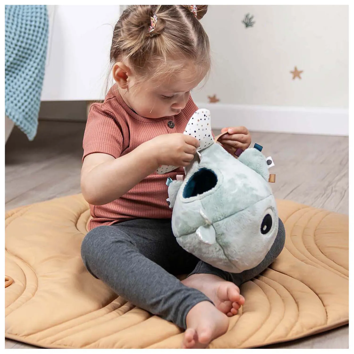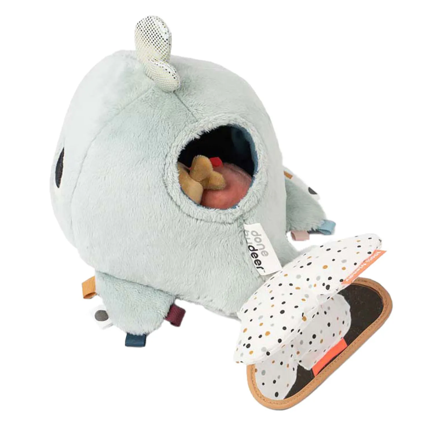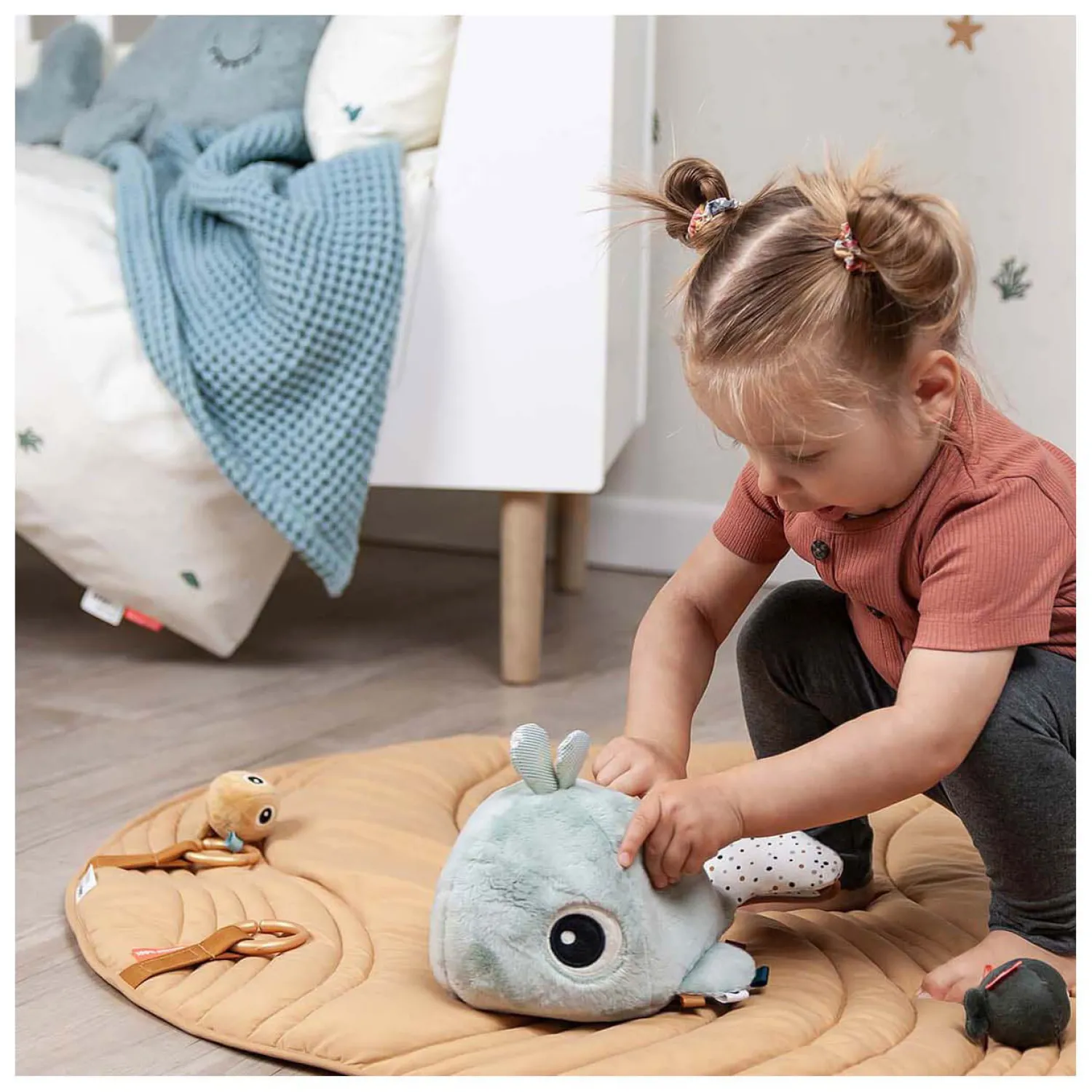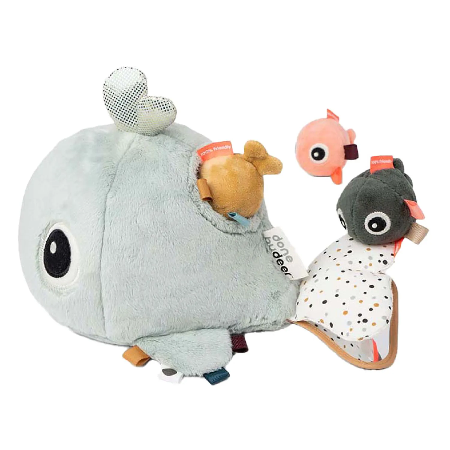 • Mooie blauwe kleuren en verschillende texturen op de schattige walvis stimuleren de zintuigen van uw kind