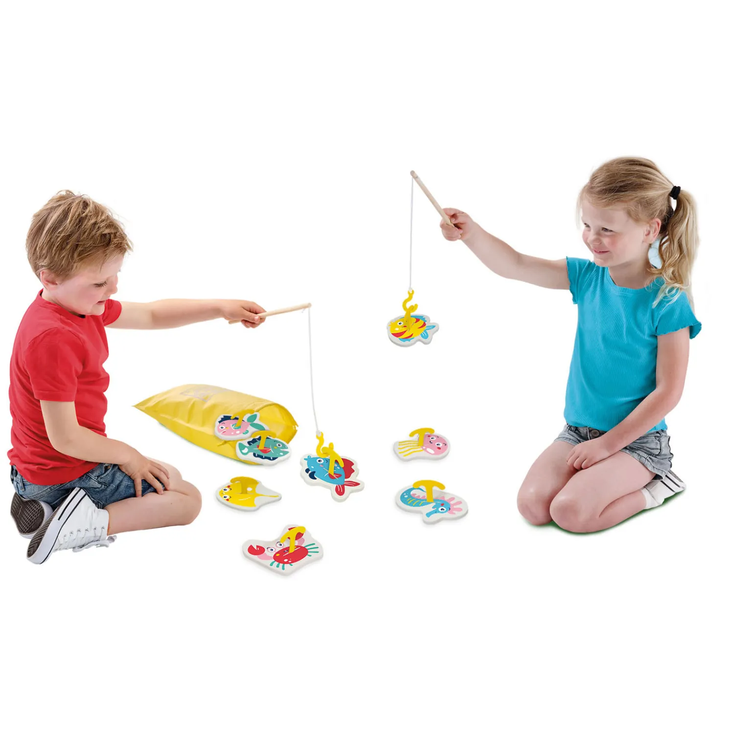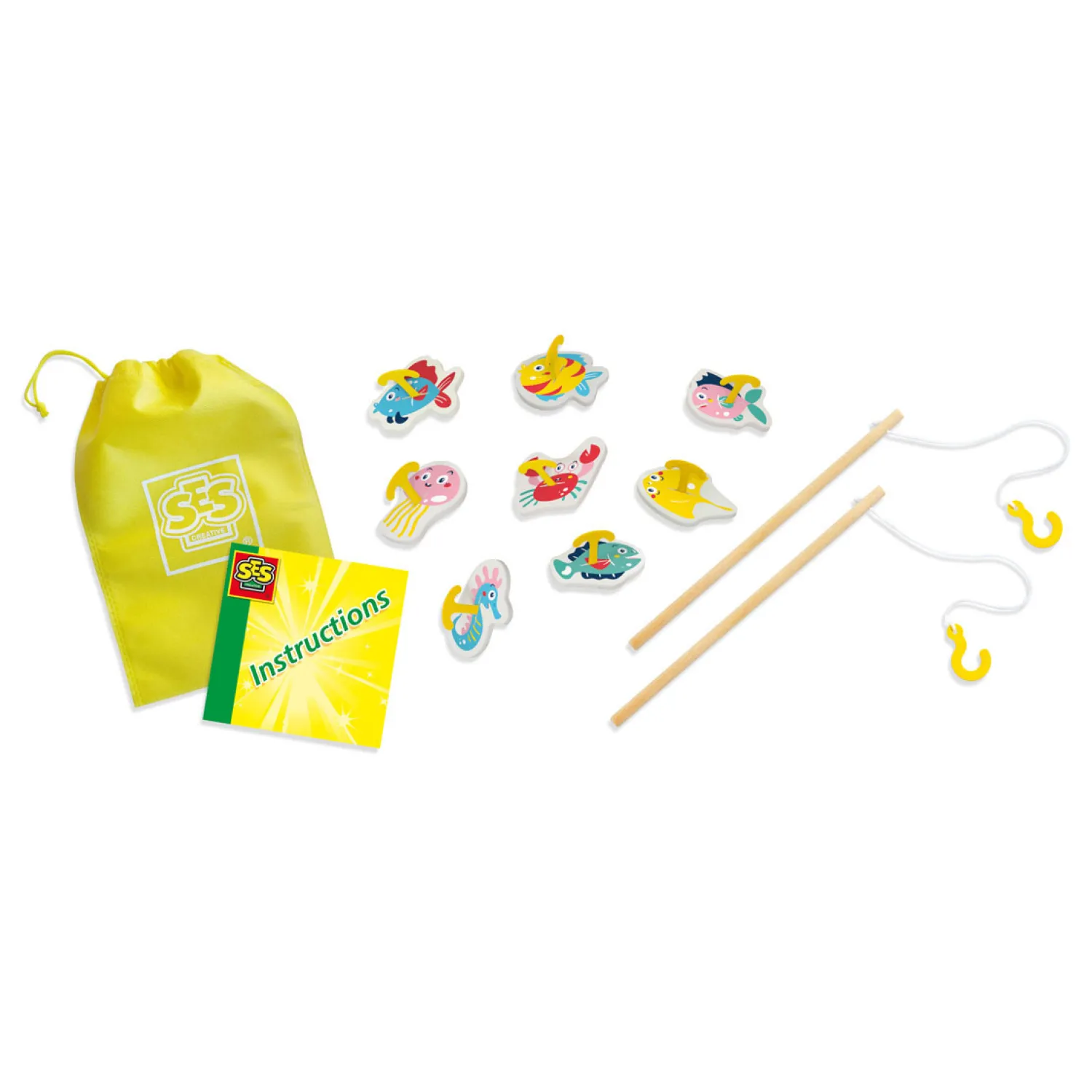 – Vrolijk geïllustreerde vissen met kunststof haakjes;