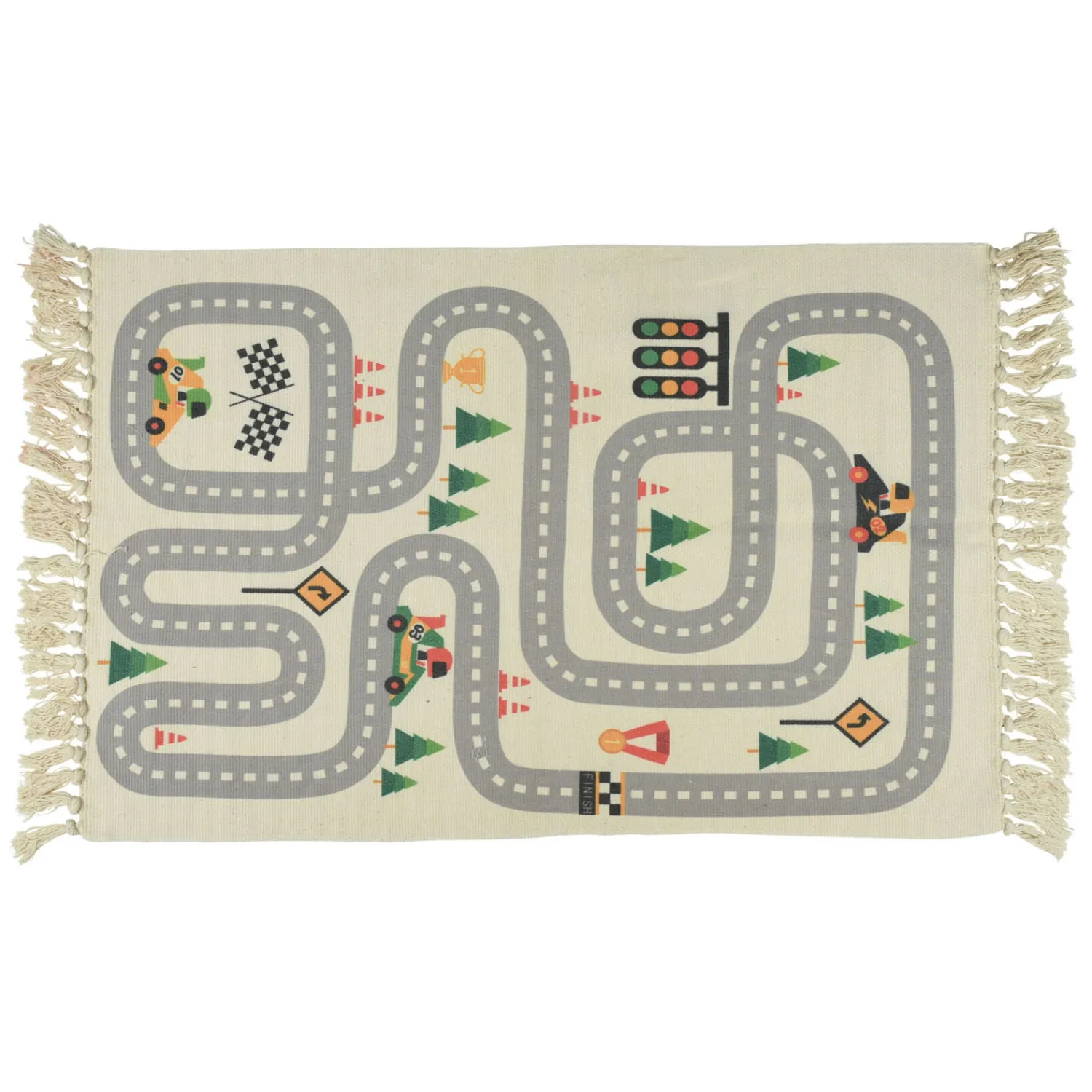 Het tapijt is 80 x 120 centimeter groot en heeft aan de korte zijden vrolijke franjes. Met de hand wassen.
