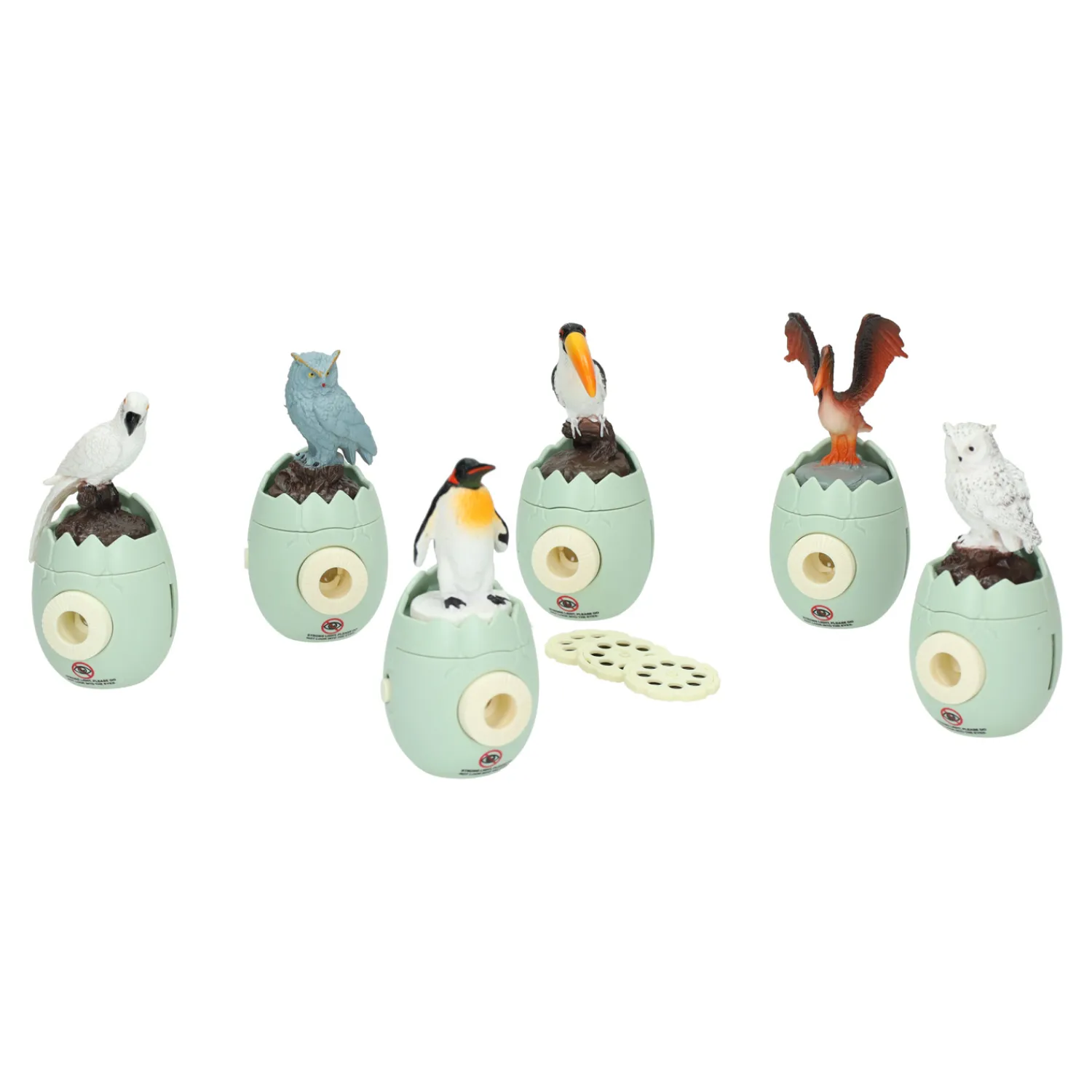Inhoud: projector, 1 vogel in ei (de projector), 3 projectie schijfjes, lus om om je hand te doen.