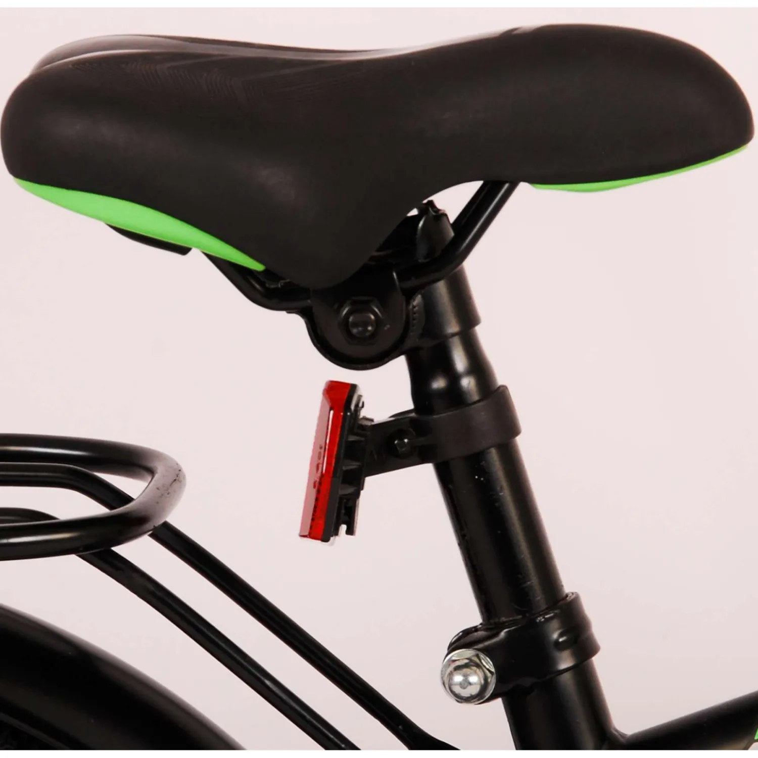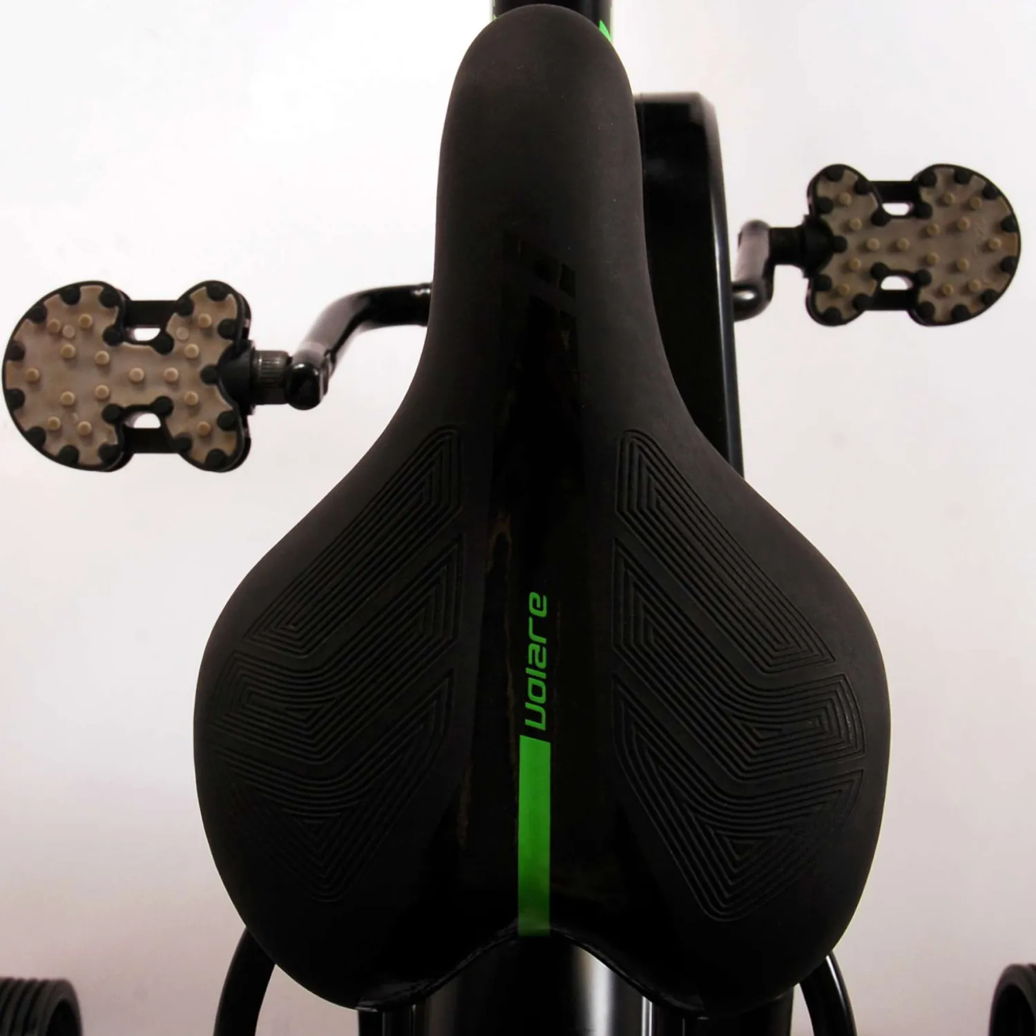 Veiligheid staat voorop! Daarom heeft deze gave fiets een handrem en terugtraprem, een gesloten kettingkast en afneembare zijwieltjes. Daarnaast heeft de fiets een leuke bel. Ook aan het comfort is gedacht. De mooie zwarte Volare fiets met groene accenten heeft een luxe zacht zadel, een handige achterdrager, en extra lange spatborden om al het vuil tegen te houden. Om zo lang mogelijk van de fiets te kunnen genieten zijn het zadel en stuur in hoogte verstelbaar. Wordt geleverd inclusief al het montagemateriaal dat nodig is om de fiets in elkaar te zetten!