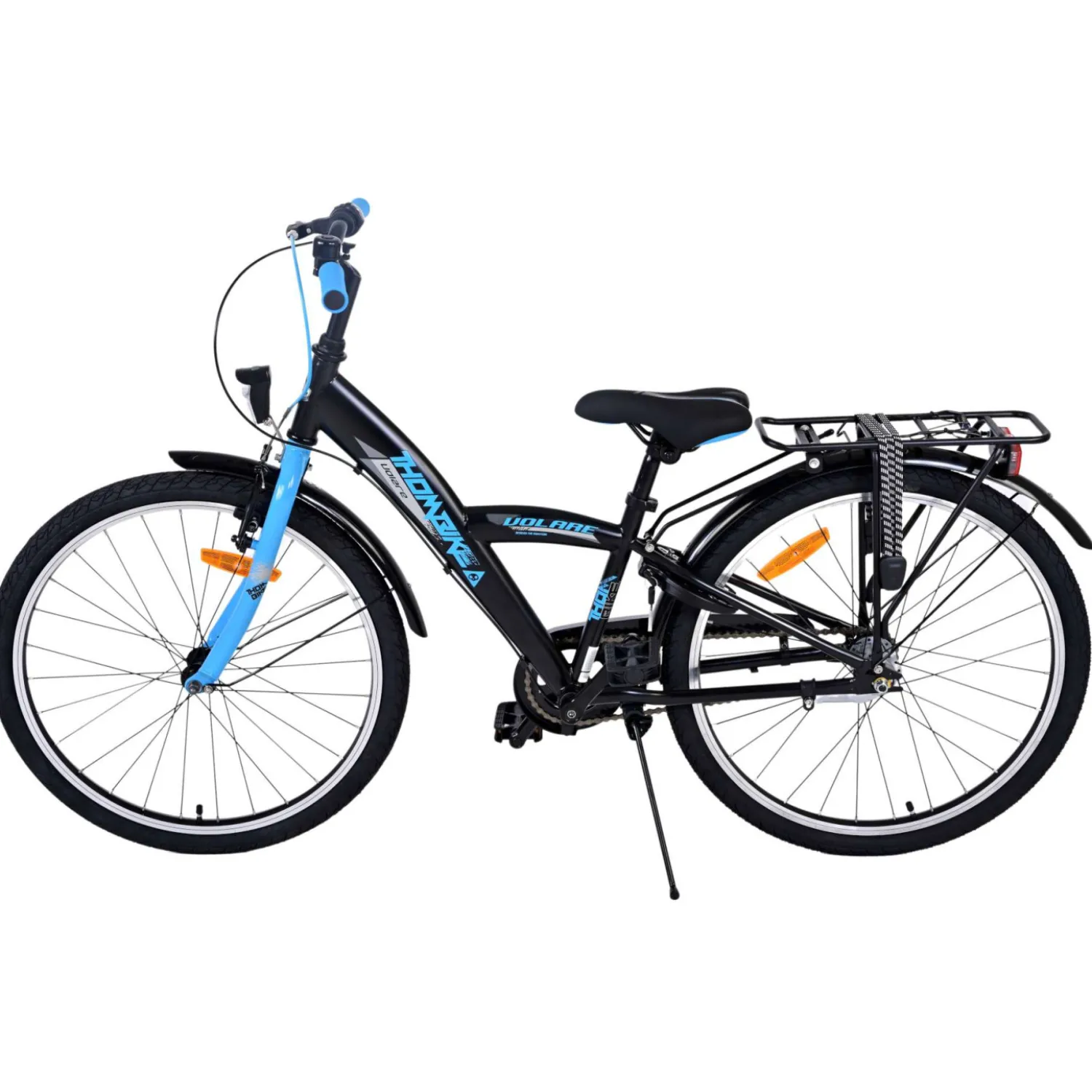 Veiligheid staat voorop! Daarom heeft deze gave fiets een handrem en terugtraprem en verlichting op batterij voor en achter. Daarnaast heeft de fiets een leuke bel en reflectoren in de wielen. Ook aan het comfort is gedacht. De mooie zwarte Volare fiets met blauwe accenten heeft een luxe zacht zadel en extra zachte handvaten, een handige achterdrager, en een stevig frame dat wel tegen een stootje kan. Verder heeft de fiets 3 versnellingen van Shimano, een standaard zodat hij netjes blijft staan en een sterk slot. Om zo lang mogelijk van de fiets te kunnen genieten heeft deze een extra lange zadelpen waardoor de fiets nóg langer met het kind meegroeit en ook het stuur is in hoogte verstelbaar.