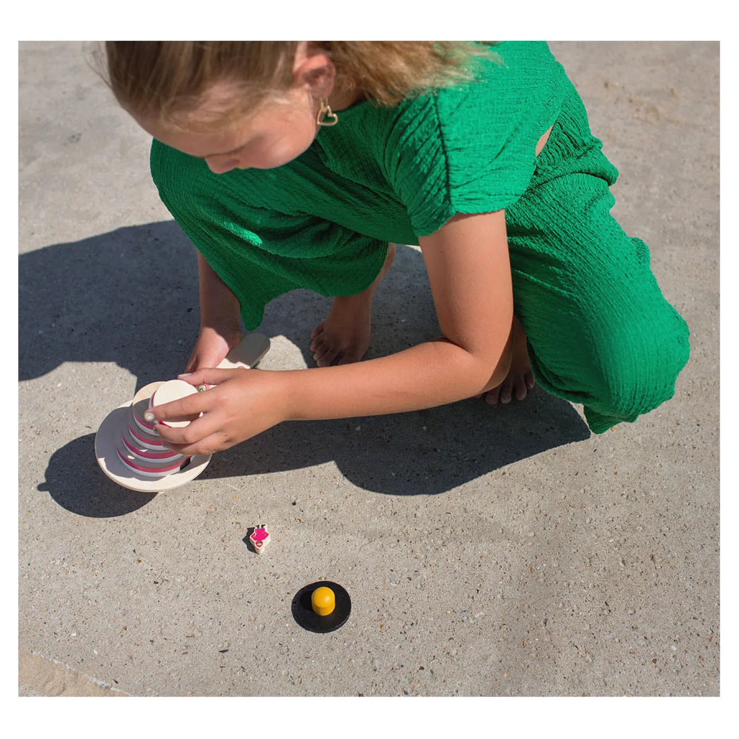 Voorbereiding: Leg de rackets op de grond, met de gekleurde stip naar beneden. Doe 5 stappen naar voren en leg hier alle overige houten onderdelen verspreid over de grond.