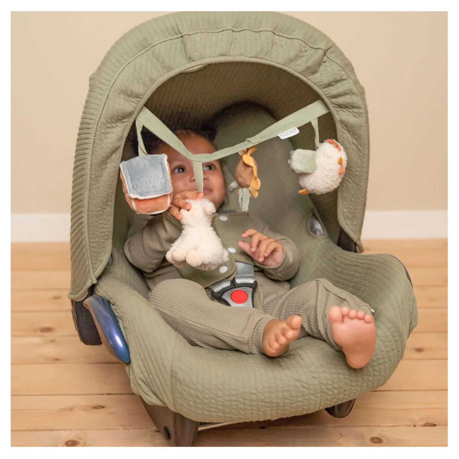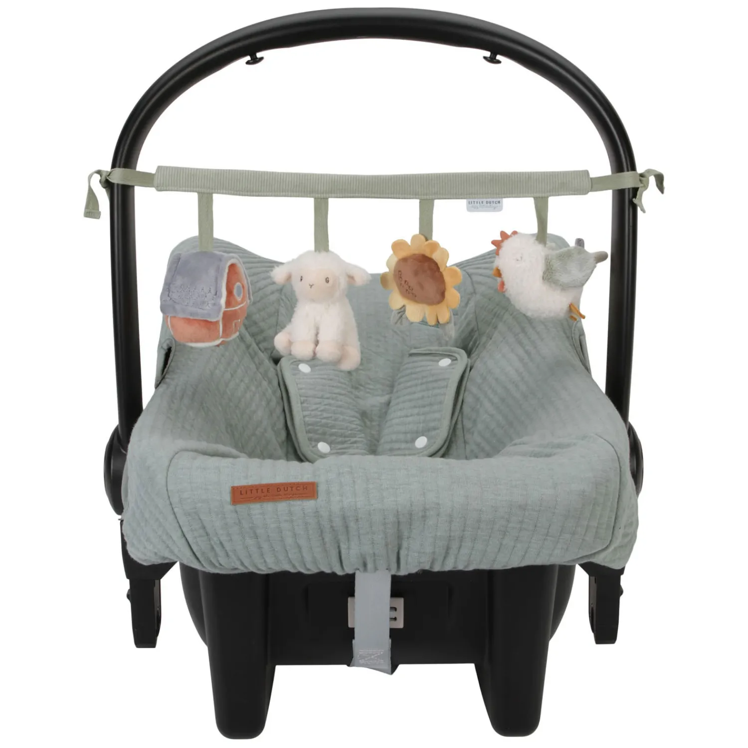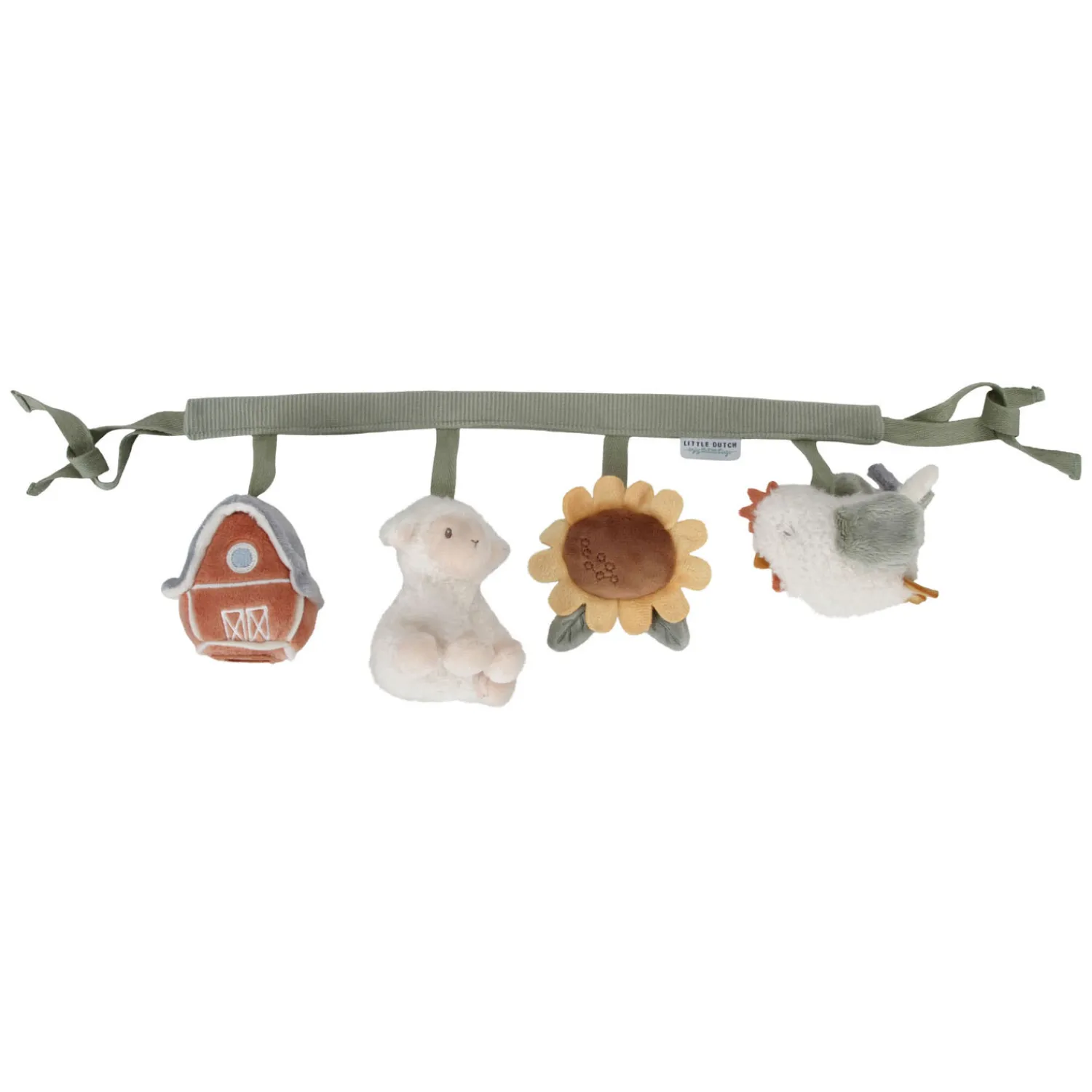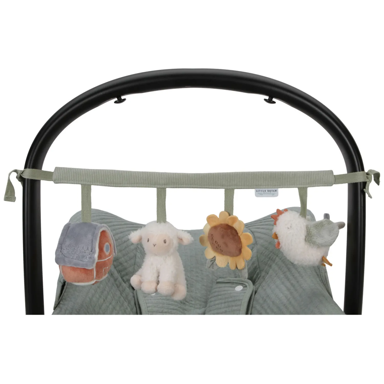 Deze Little Dutch wagenspanner met de vriendjes van de boerderij is eenvoudig te bevestigen aan een autostoeltje of kinderwagen en zorgt onderweg voor veel speelplezier en vermaak dankzij de speeltjes met een rammelaar, spiegeltje, knijptoetertje en knisper. Stimuleert tevens de hand-oogcoördinatie. WAARSCHUWING: Om te voorkomen dat het kind verstrikt raakt, en zich bezeert, verwijder dit speelgoed wanneer het kind op handen en voeten begint te kruipen. Te monteren door een volwassene.