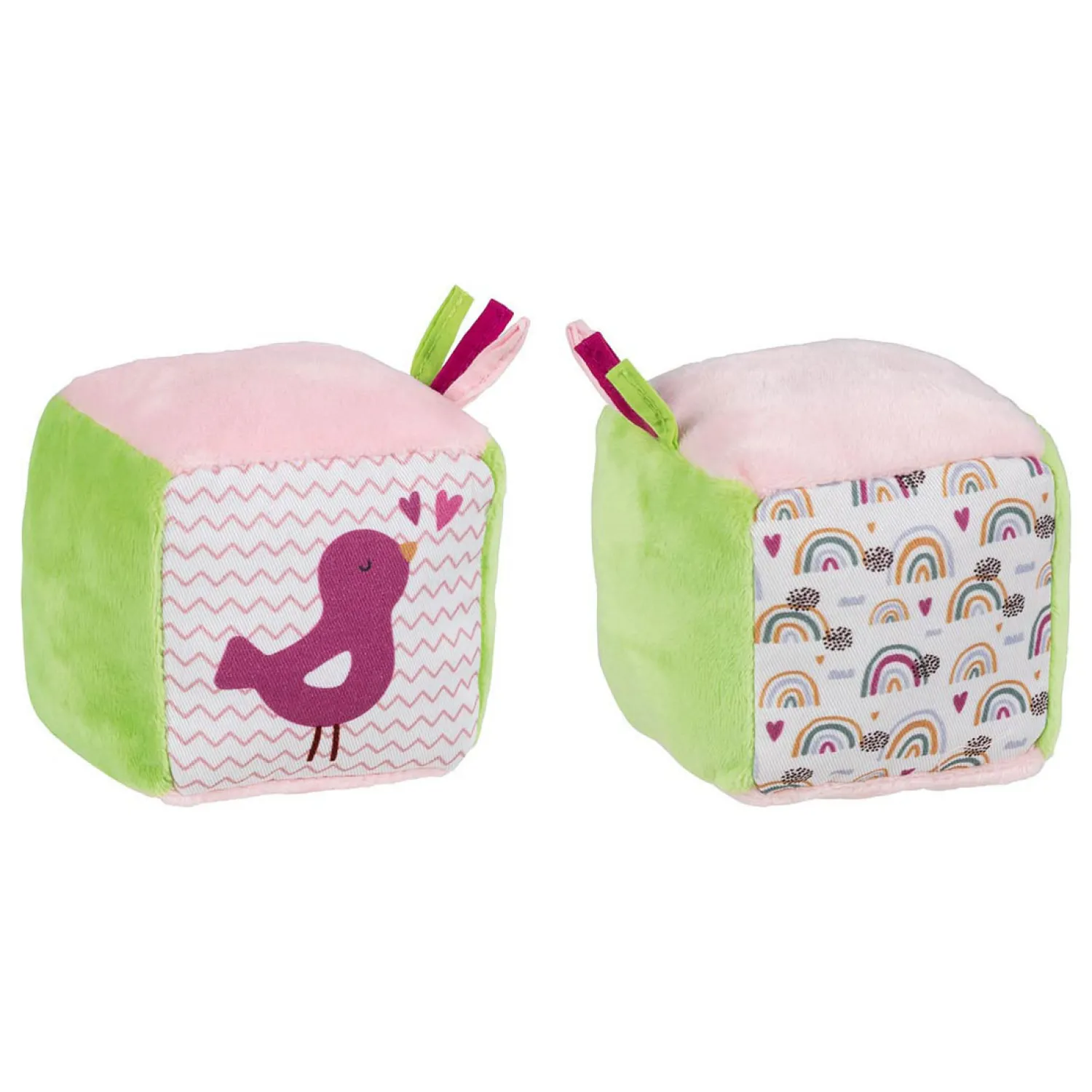 Zacht stoffen blok van roze en groene stof, met een belletje en kraakpapier. Aan de ene kant een vogeltje afgebeeld en aan de andere kant regenbogen. Leuk voor baby’s.