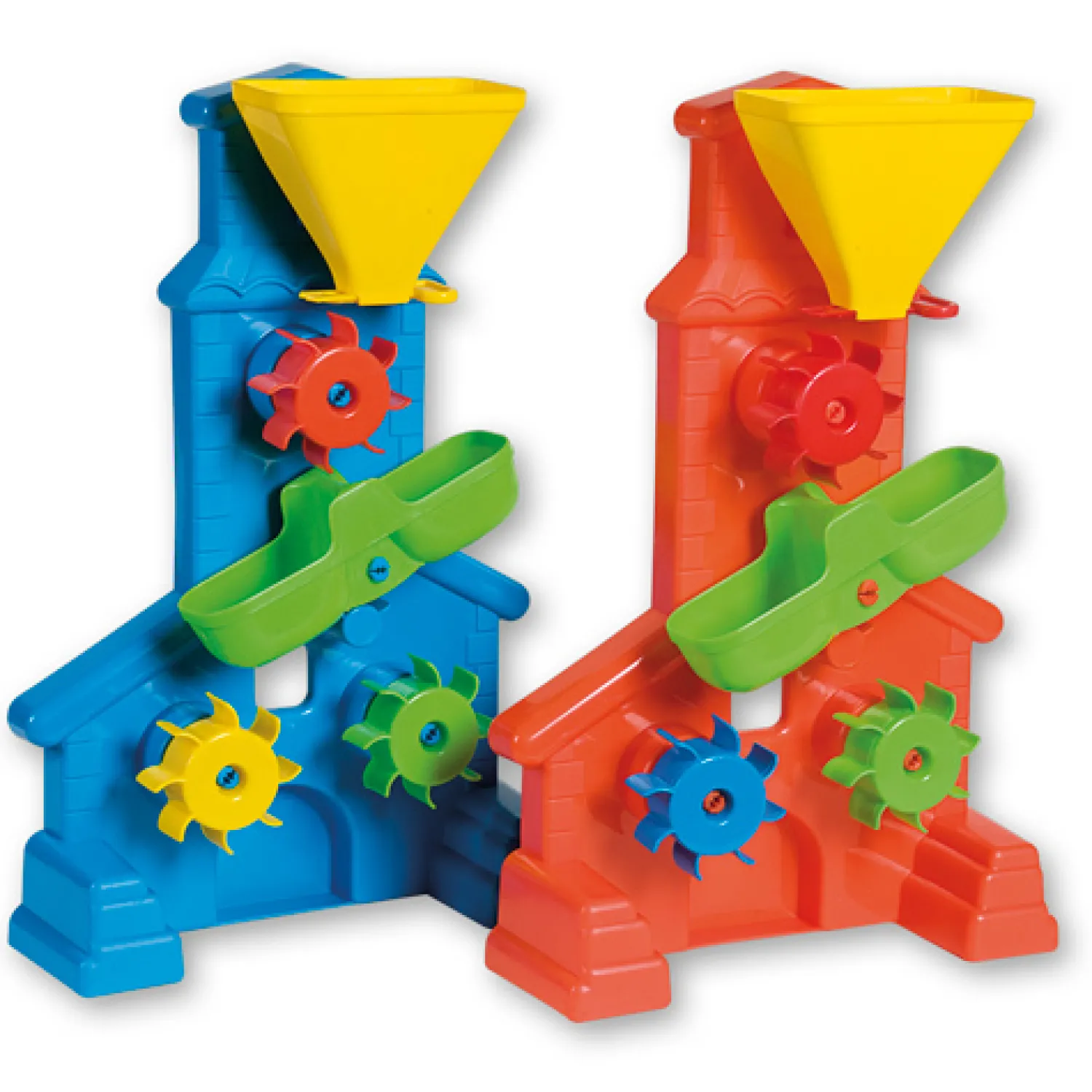 Kunststof molen in de vorm van een kasteel waardoor je water of zand kunt laten lopen.Prijs per stuk, verschillende uitvoeringen/kleuren worden door elkaar geleverd.