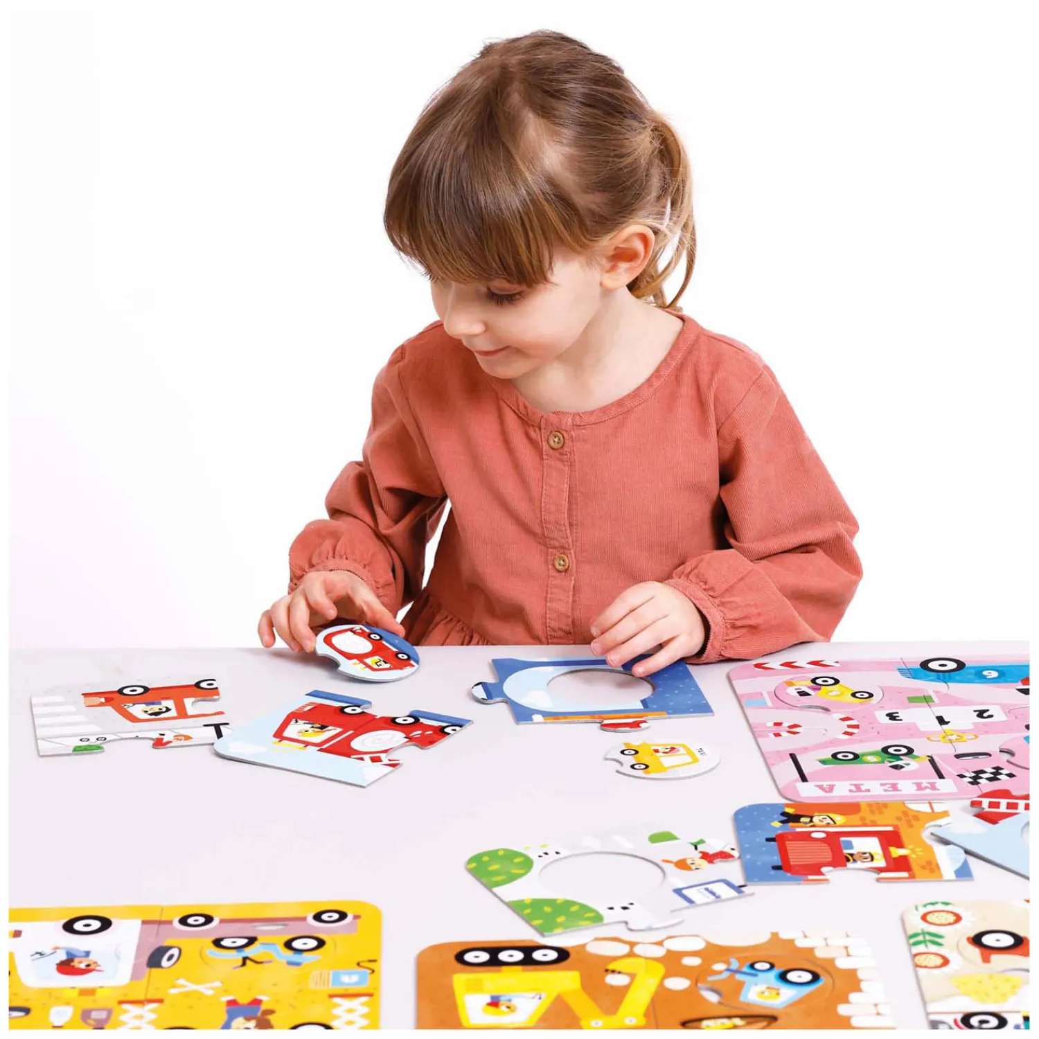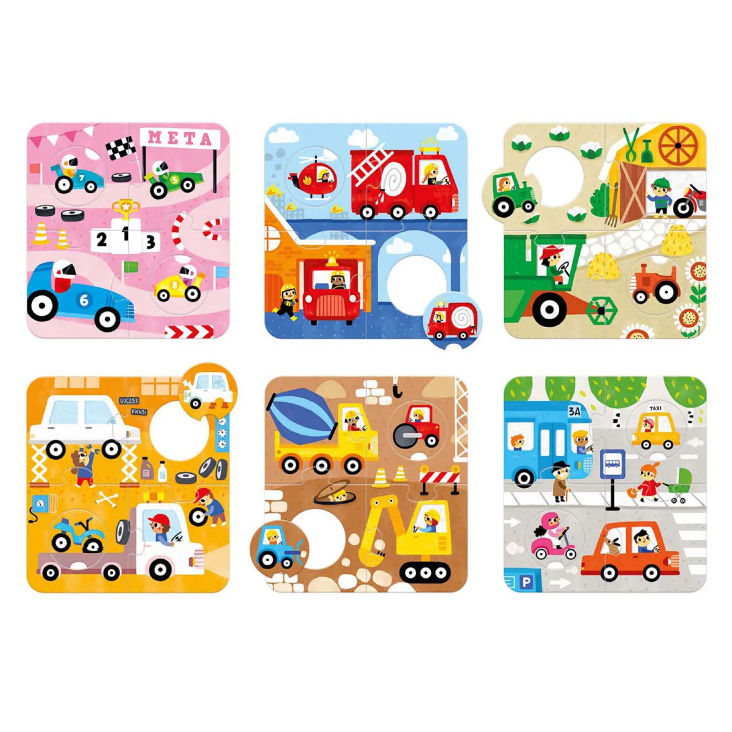 Deze educatieve set bevat 6 grote puzzels met uitneembare ronde stukjes die verwisselbaar in elkaar gezet kunnen worden. Beleef samen plezier en train behendigheid, waarnemingsvermogen en concentratie.