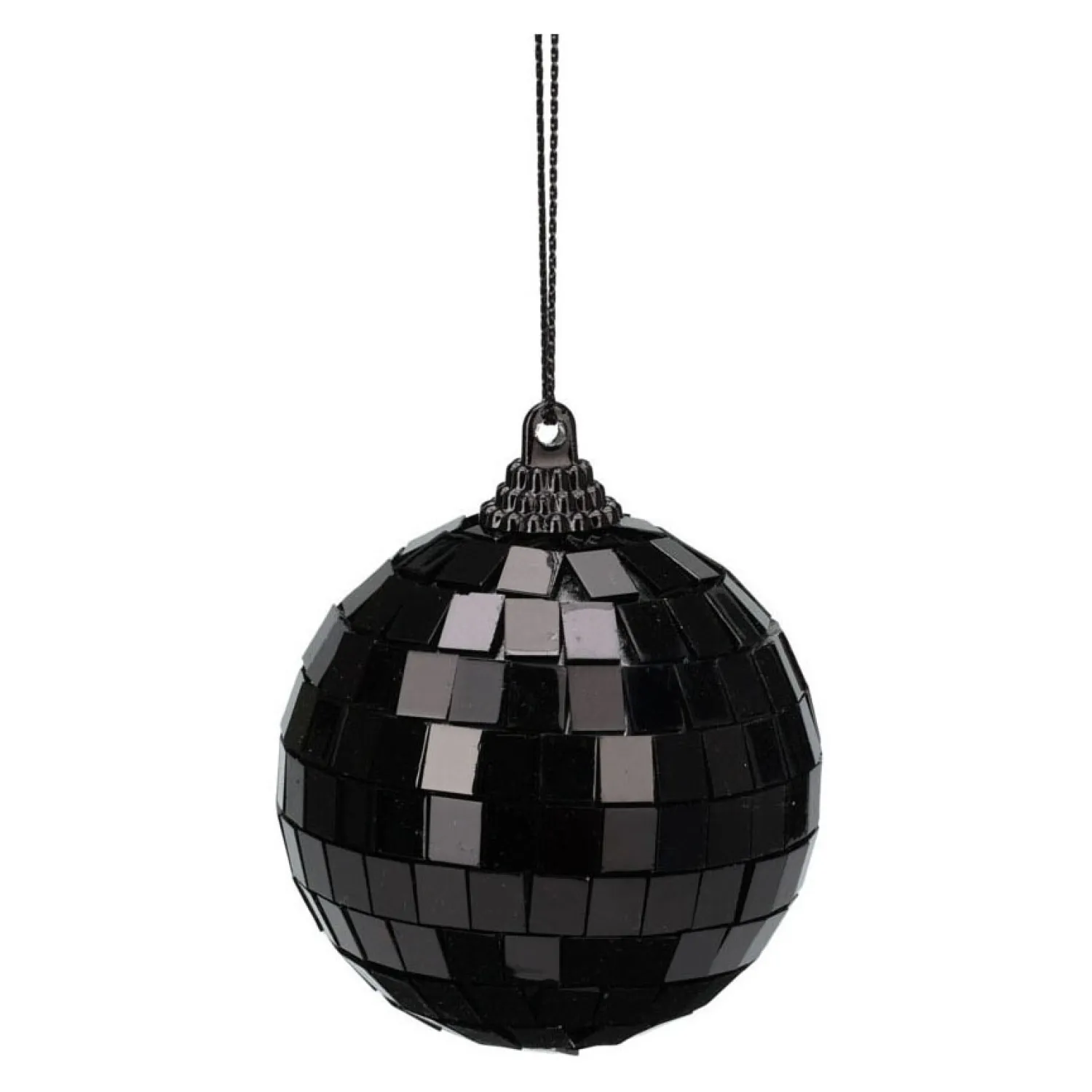 Wil je eens wat anders in je kerstboom? Deze bijzondere, zwarte kerstballen zijn vormgegeven als spiegelballen/discobollen! De weerspiegelende steentjes op de kerstballen zullen de lichtjes in de boom op een bijzondere manier weerkaatsen. Ga voor een unieke look! In de set zitten 12 zwarte kerstballen van ca. 6 centimeter groot, inclusief ophangtouwtjes.