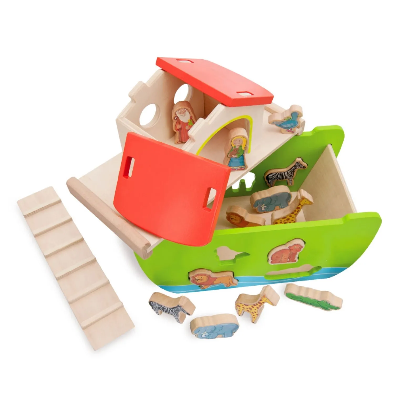 21-delige houten Eichhorn Ark van Noach. 7 van de dieren kunnen onderin de Ark door de juiste vorm in de Ark geplaatst worden.