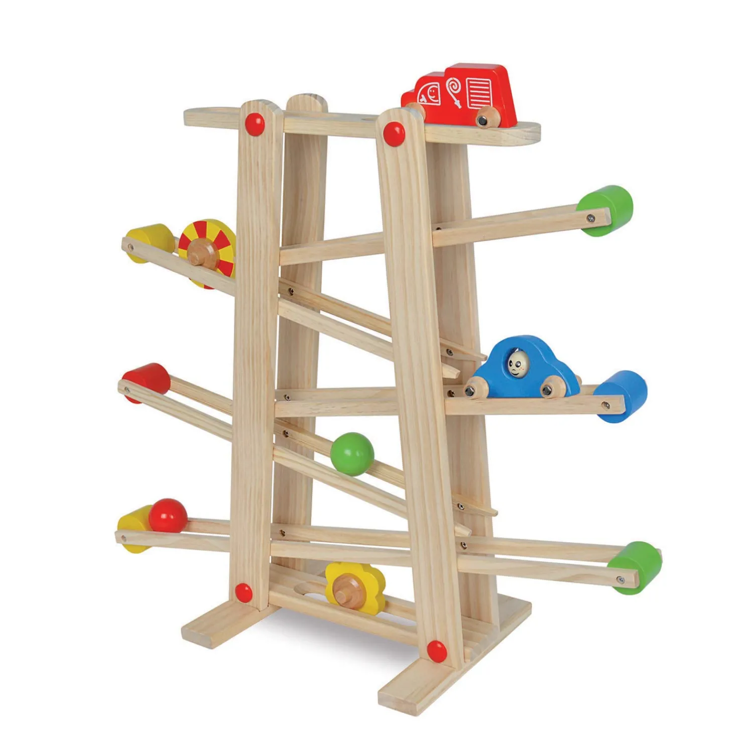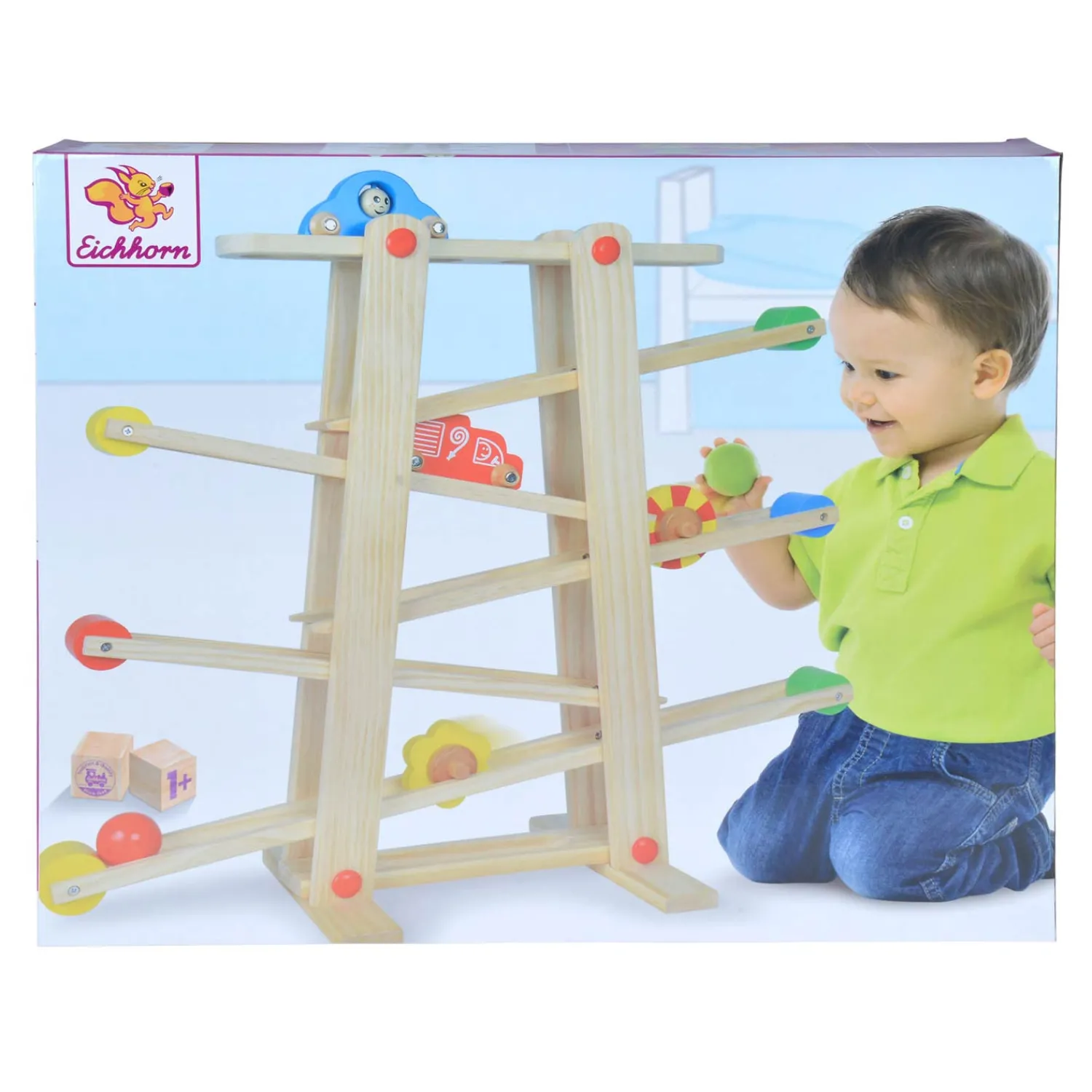 De houten Eichhorn Auto- en Ballenbaan laat kinderen kennis maken met het principe van rollen en naar beneden vallen. Plaats de houten ballen, de houten autootjes en de houten bloemen op de bovenste houten baan en zie hoe deze schuin naar beneden rollen en op de volgende baan vallen. Dat is leuk! Wanneer alle alle autootjes, ballen en bloemen weer beneden zijn kan het rollen en vallen weer vanaf vooraf aan beginnen. De Eichhorn Auto- en Ballenbaan stimuleert de motoriek en maakt kinderen bewust van oorzaak-gevolgrelaties.