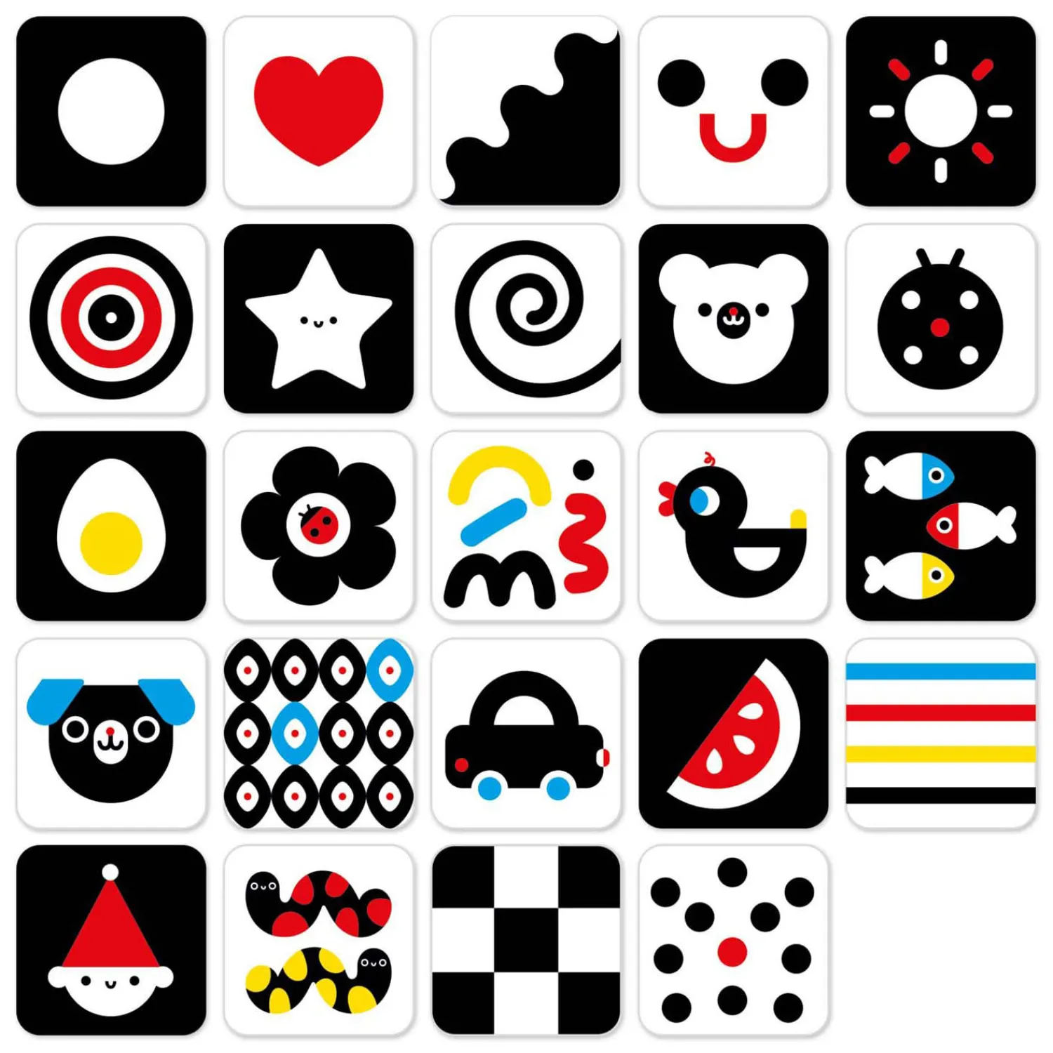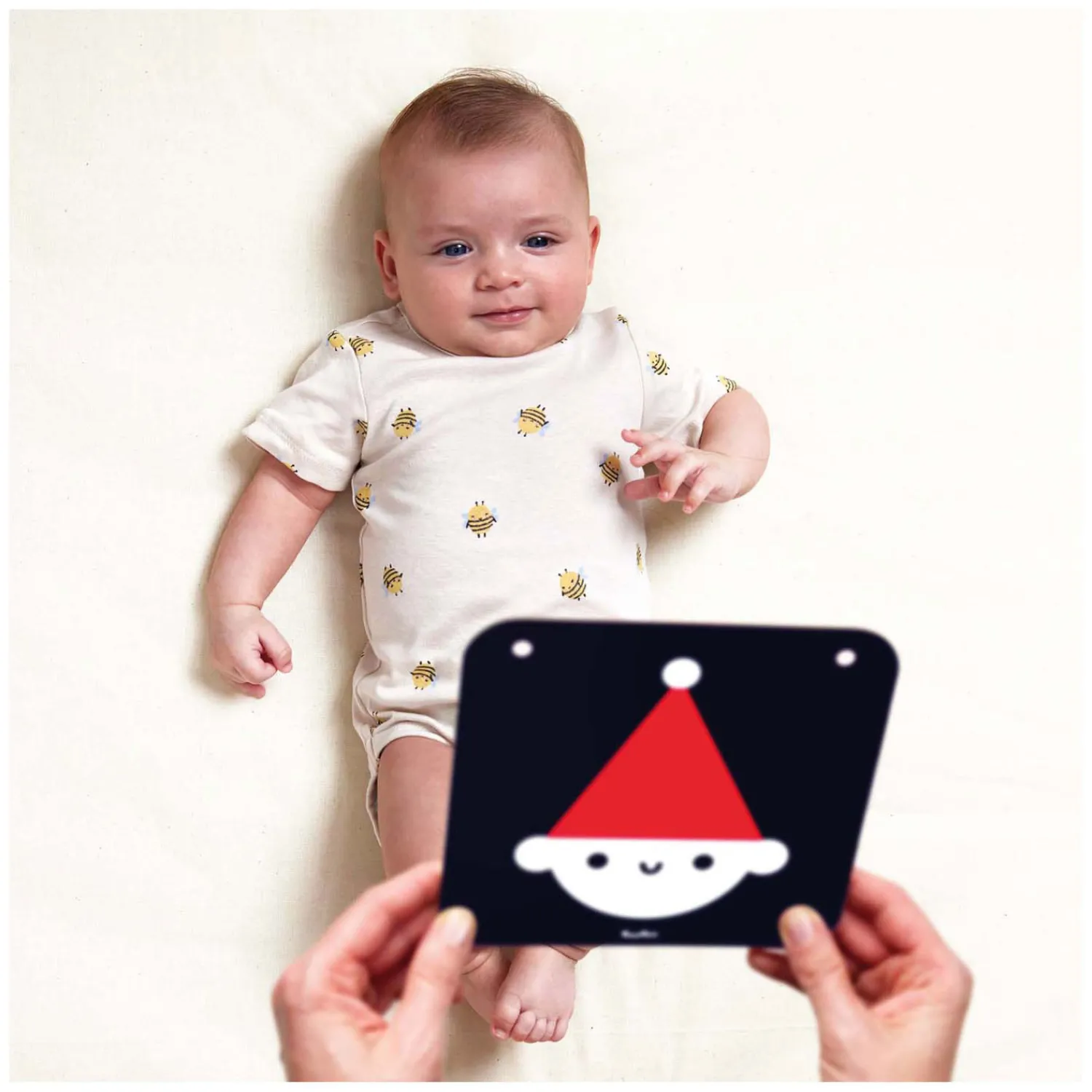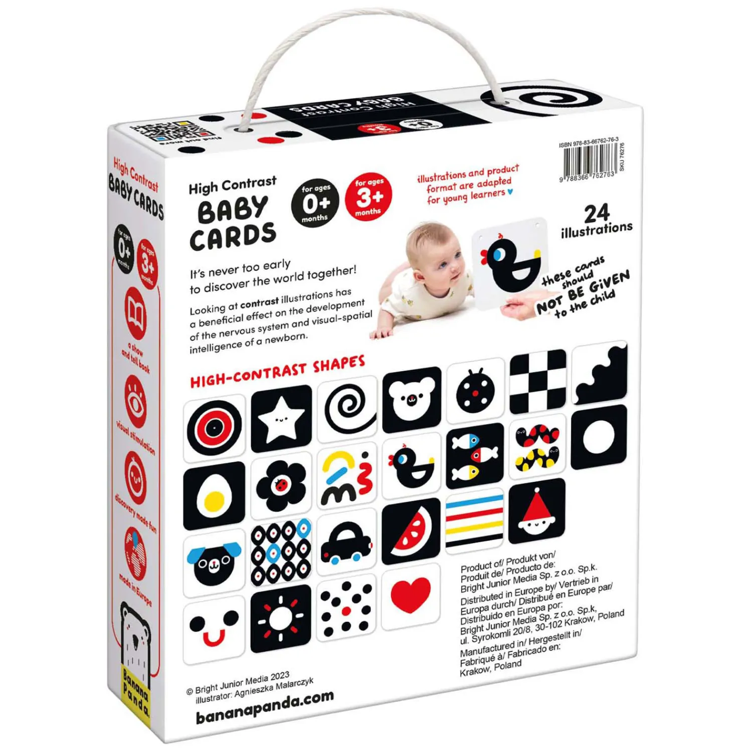 Bij de geboorte is het gezichtsvermogen nog onderontwikkeld. In het begin zien baby’s het beste heldere, contrastrijke patronen en in de maanden daarna ontwikkelt het vermogen om beelddetails en kleuren te onderscheiden zich geleidelijk. Daarom houden baby’s zo van contrasten. Ouders kunnen een boekje of individuele kaarten bij het bed of de wandelwagen hangen, of een effectieve slinger maken. Veel interessante en praktische informatie over de ontwikkeling van baby’s en hoe je samen plezier kunt hebben, vind je in de gids die bij de set zit.