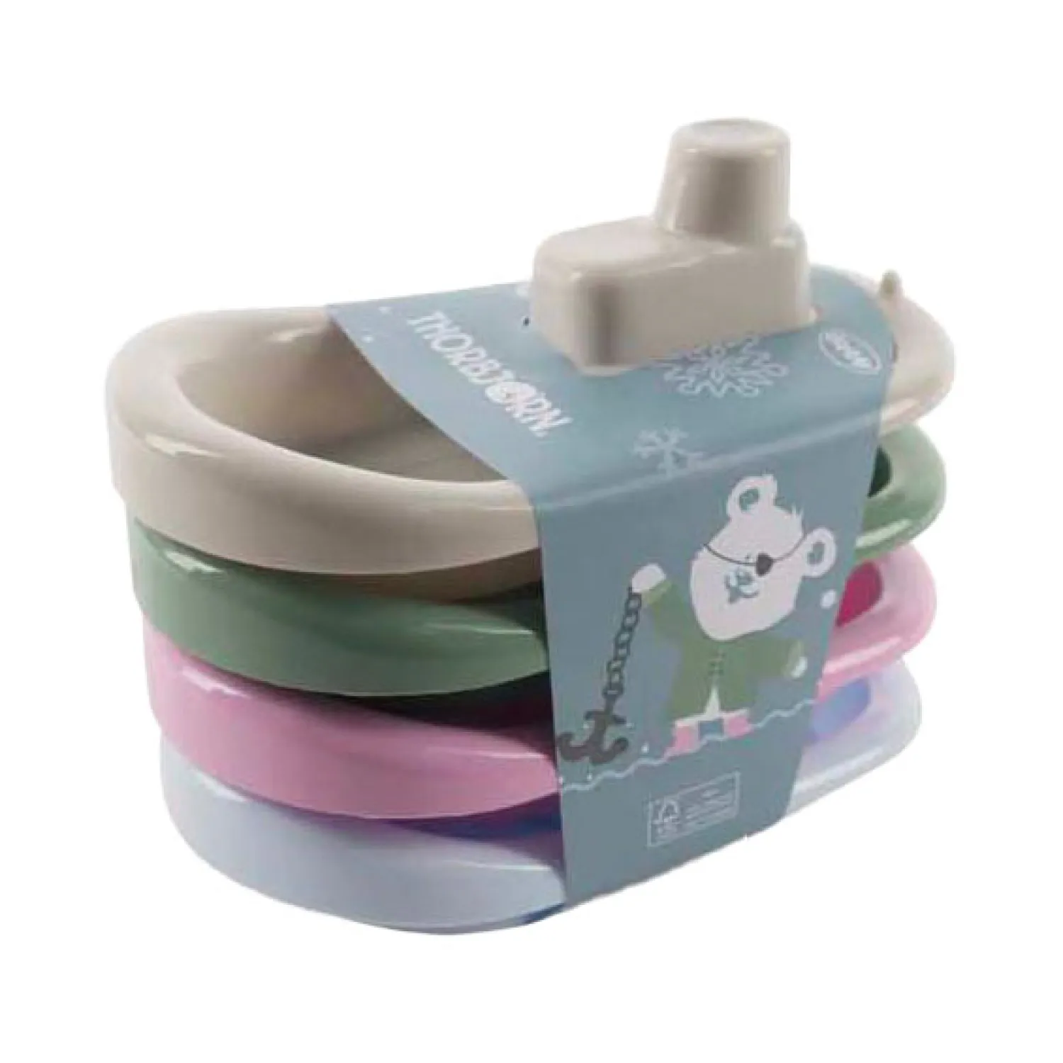Dantoy bootjesset, 4 stuks, in beige, groen, roze en blauw. Lichtgewicht, stevig en veilig in gebruik, geschikt voor kinderen vanaf 2 jaar.