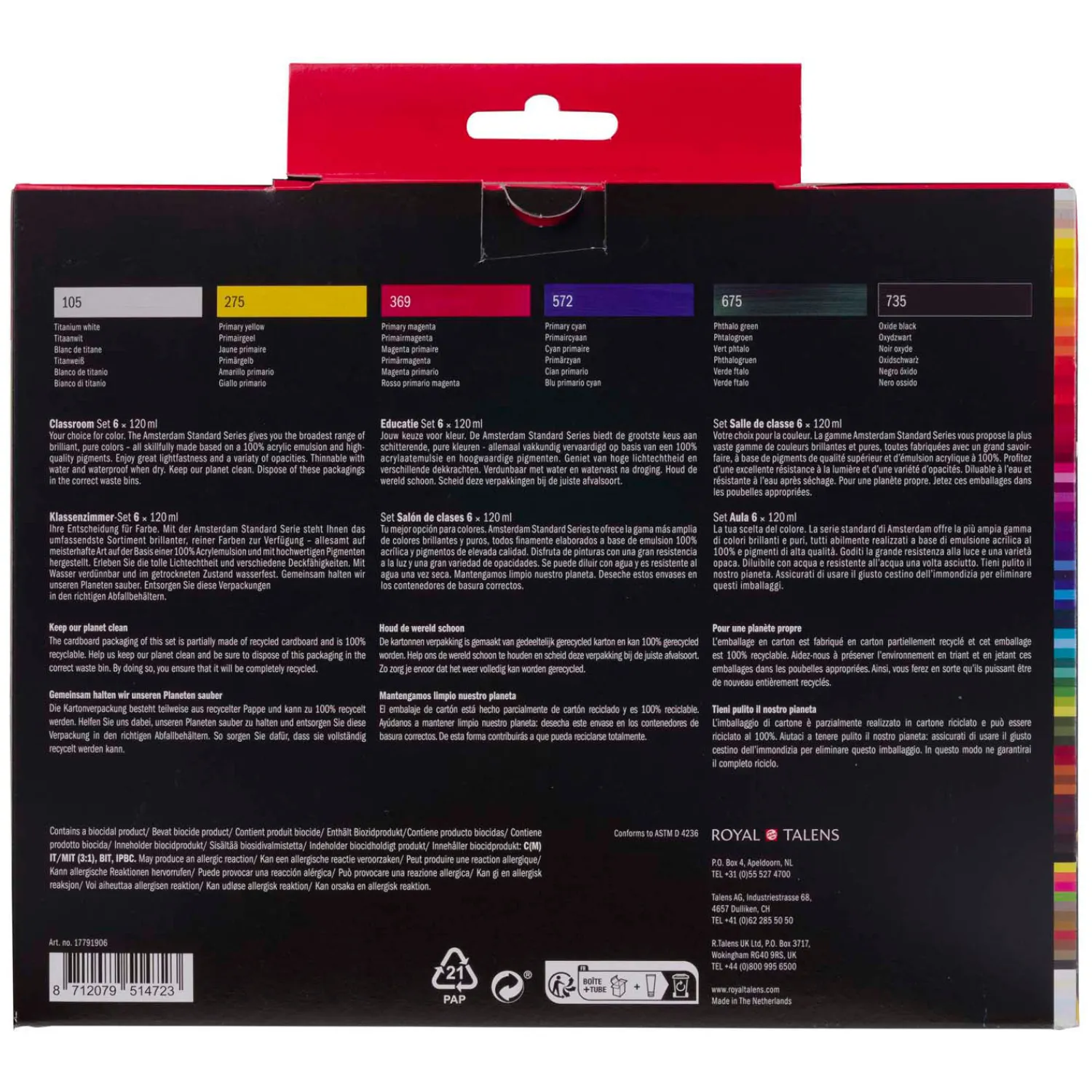 Inhoud: 6 x 120 ml tubes (105 Titaanwit – 275 Primairgeel – 369 Primairmagenta – 572 Primaircyaan – 675 Phtalogroen – 735 Oxydzwart).