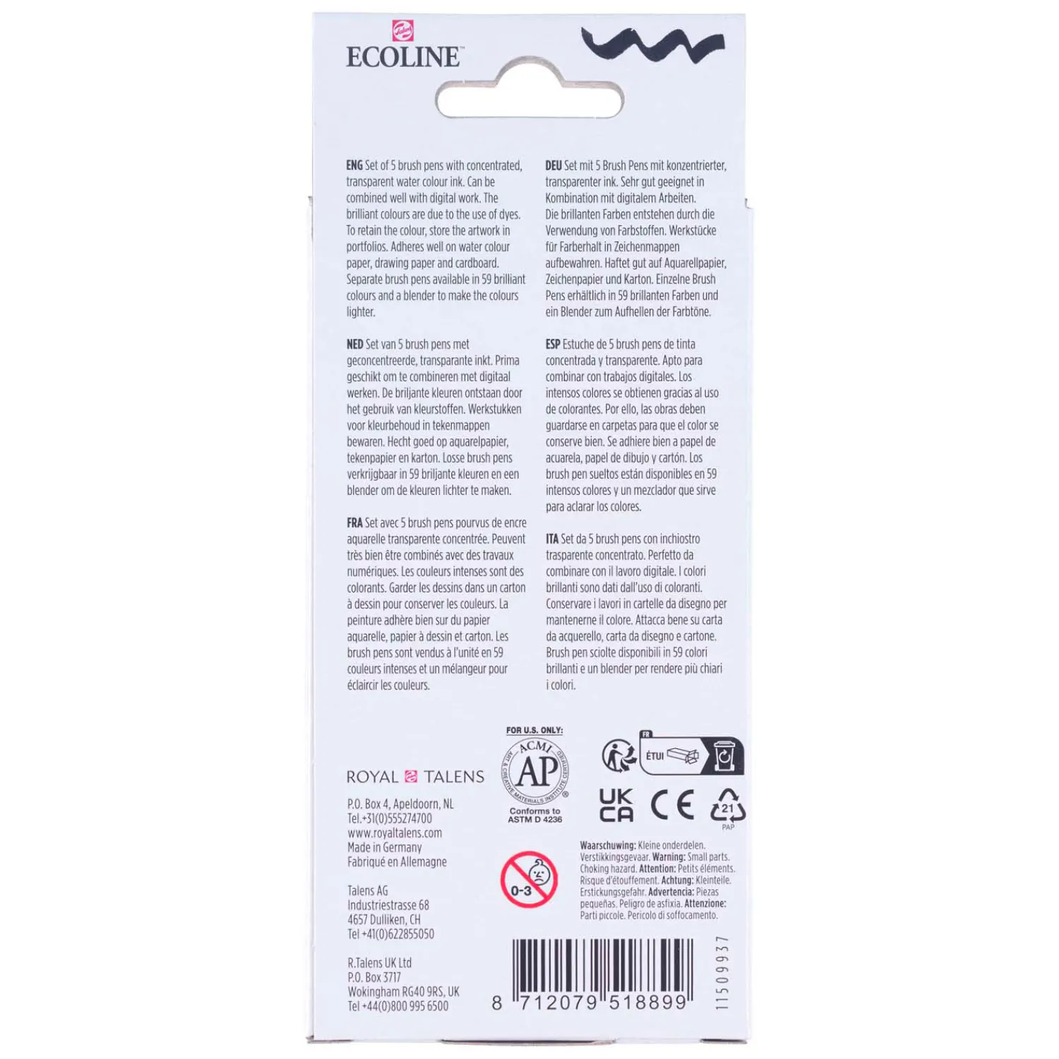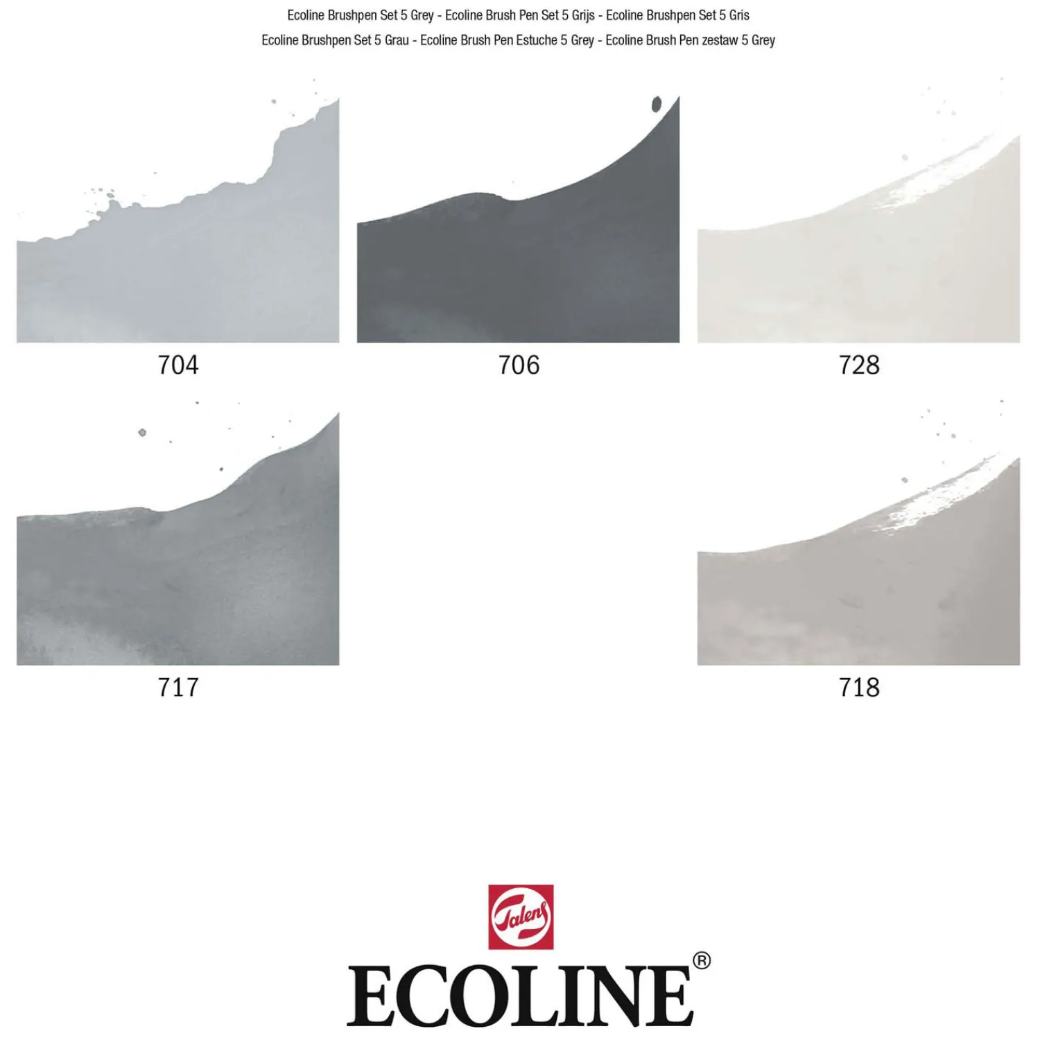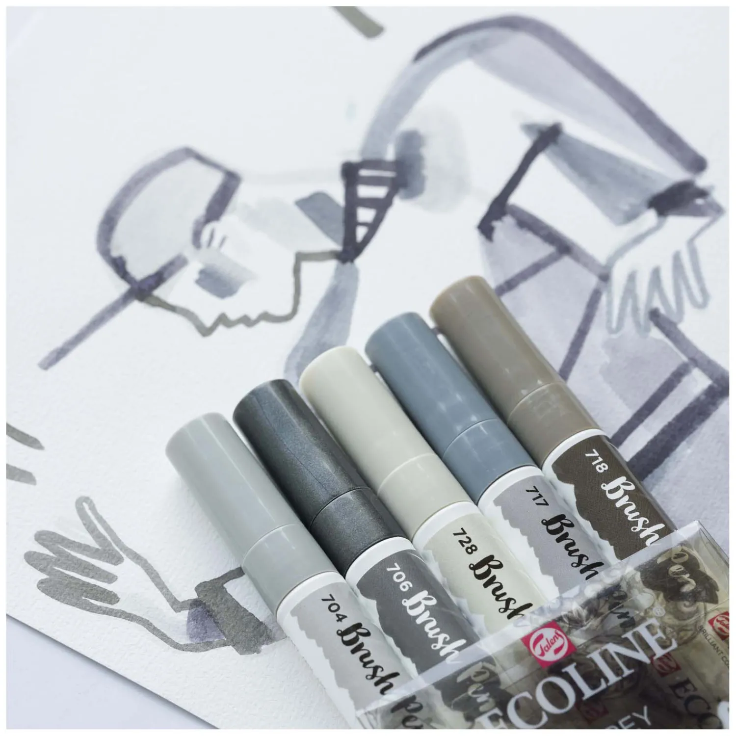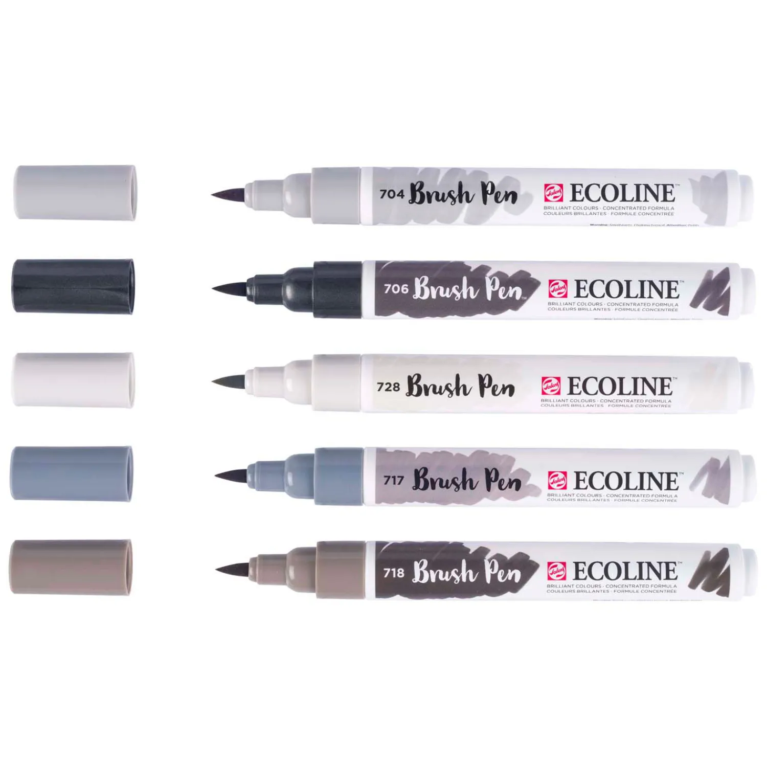 Deze set bevat 5 Ecoline Brush Pens in levendige grijstinten. De Brush Pen kenmerkt zich door de flexibele punt en het uitgebreide assortiment schitterende kleuren dankzij de pure formule op kleurstofbasis. De transparante kleuren bieden de beste resultaten bij gebruik op wit of zeer lichtgekleurd papier. Indien gewenst kun je de kleurintensiteit gemakkelijk verminderen door ze te verdunnen met water of met de Brush Pen blender (apart verkrijgbaar). Deze pennen zijn perfect voor handlettering, aquareltekeningen, snelle schetsen en finishing touches.