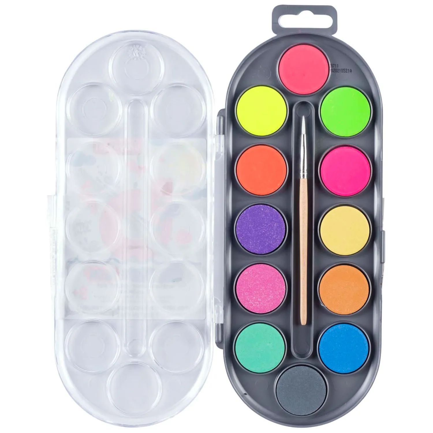 met de waterverf van Bruynzeel kun je gemakkelijk je eigen kunstwerken maken! Deze set bevat 7 metallic en 5 neon waterverfkleuren die goed werken op zowel wit als zwart papier! Het inbegrepen penseel helpt je de heldere kleuren op papier aan te brengen, terwijl het handige doosje de verf beschermt en voorkomt dat de kleuren in elkaar overlopen. De cirkels in het deksel kunnen ook gebruikt worden als mengpallet!