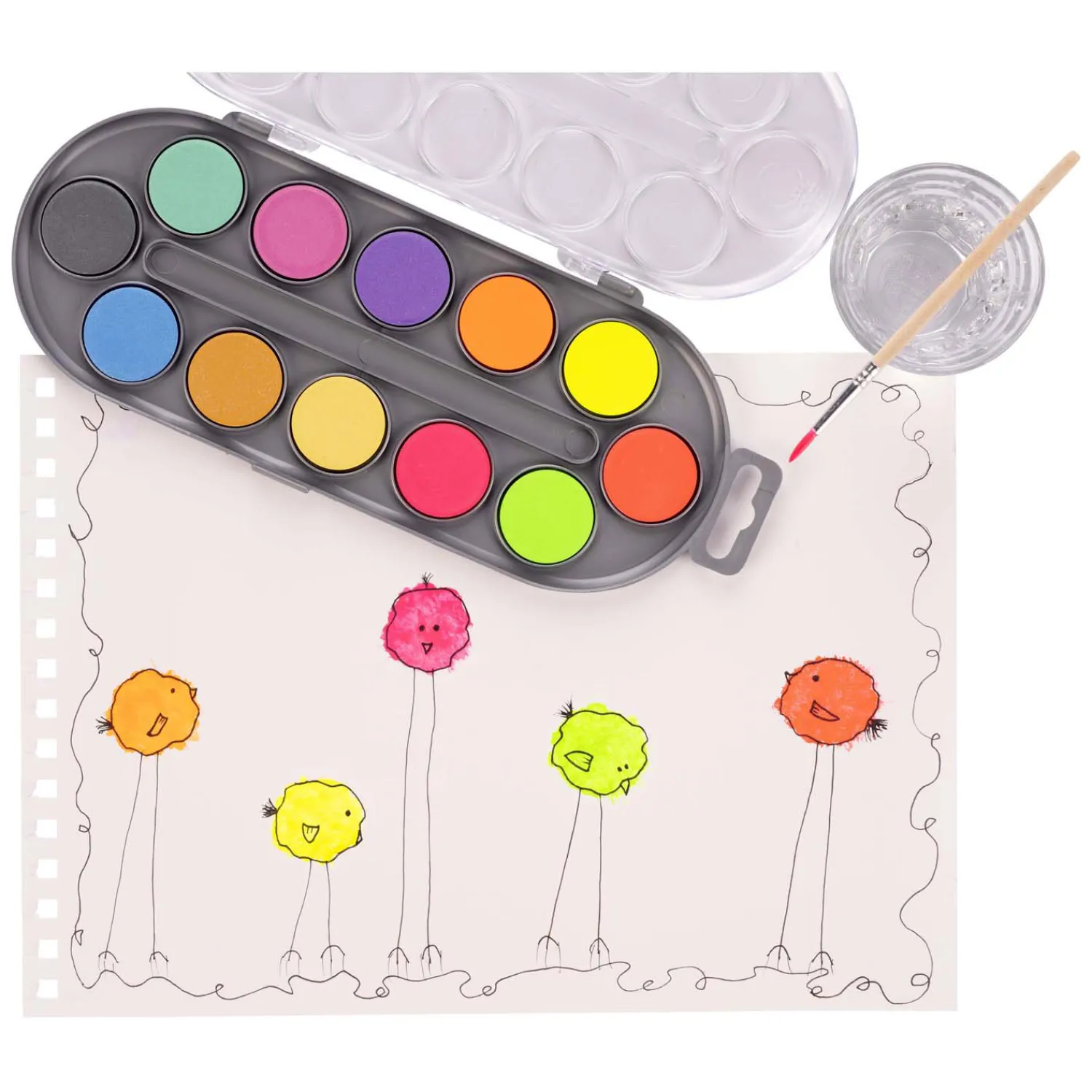 Geschikt voor kinderen vanaf 3 jaar. 12 heldere kleuren. Ideaal voor beginnende kunstenaars. Kleuren zijn makkelijk met elkaar te vermengen met gebruik van water. Glutenvrij.