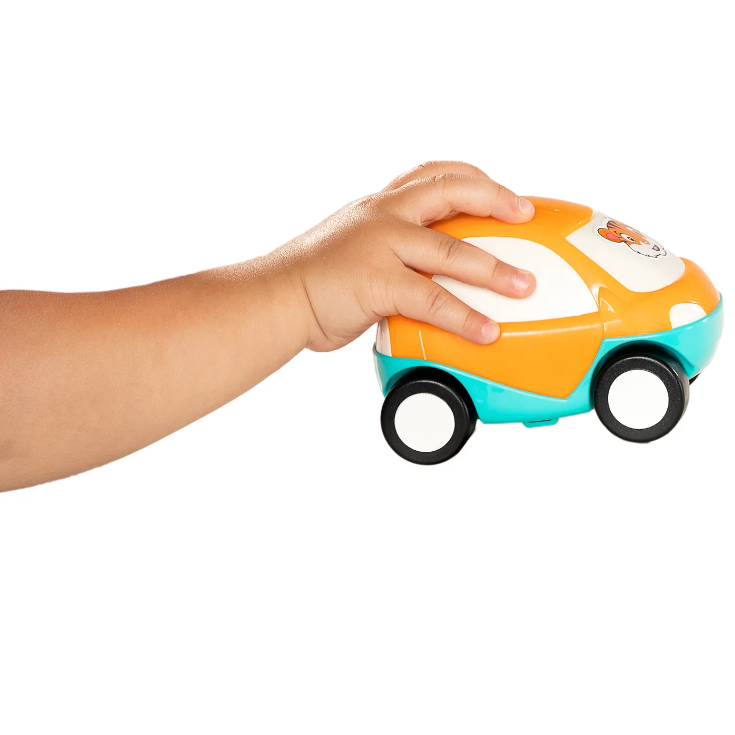 Dit schattige autootje is ideaal voor je dreumes of peuter en zorgt voor uren speelplezier. Het wagentje heeft een oranje kleur met een lief tijgertje erop. Door het brede en gladde ontwerp kan je kindje het gemakkelijk vastpakken en kan de race beginnen.