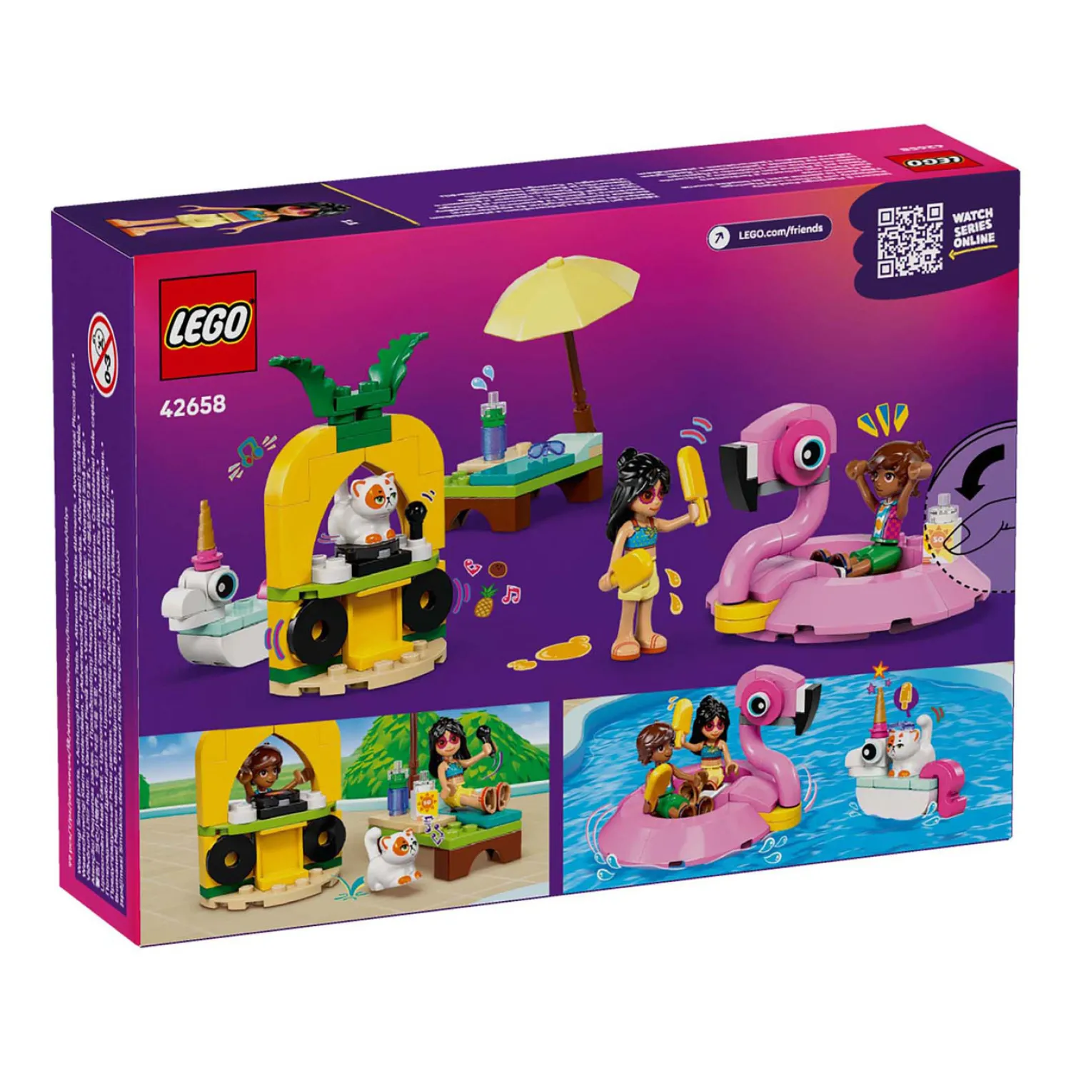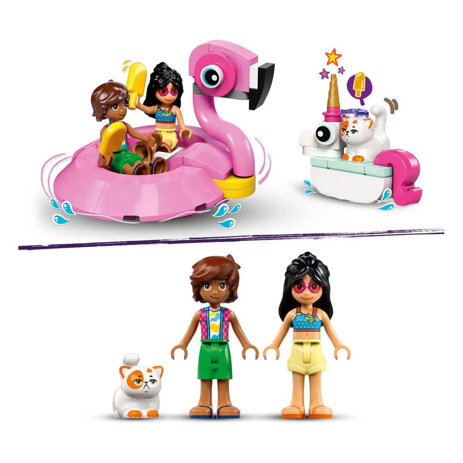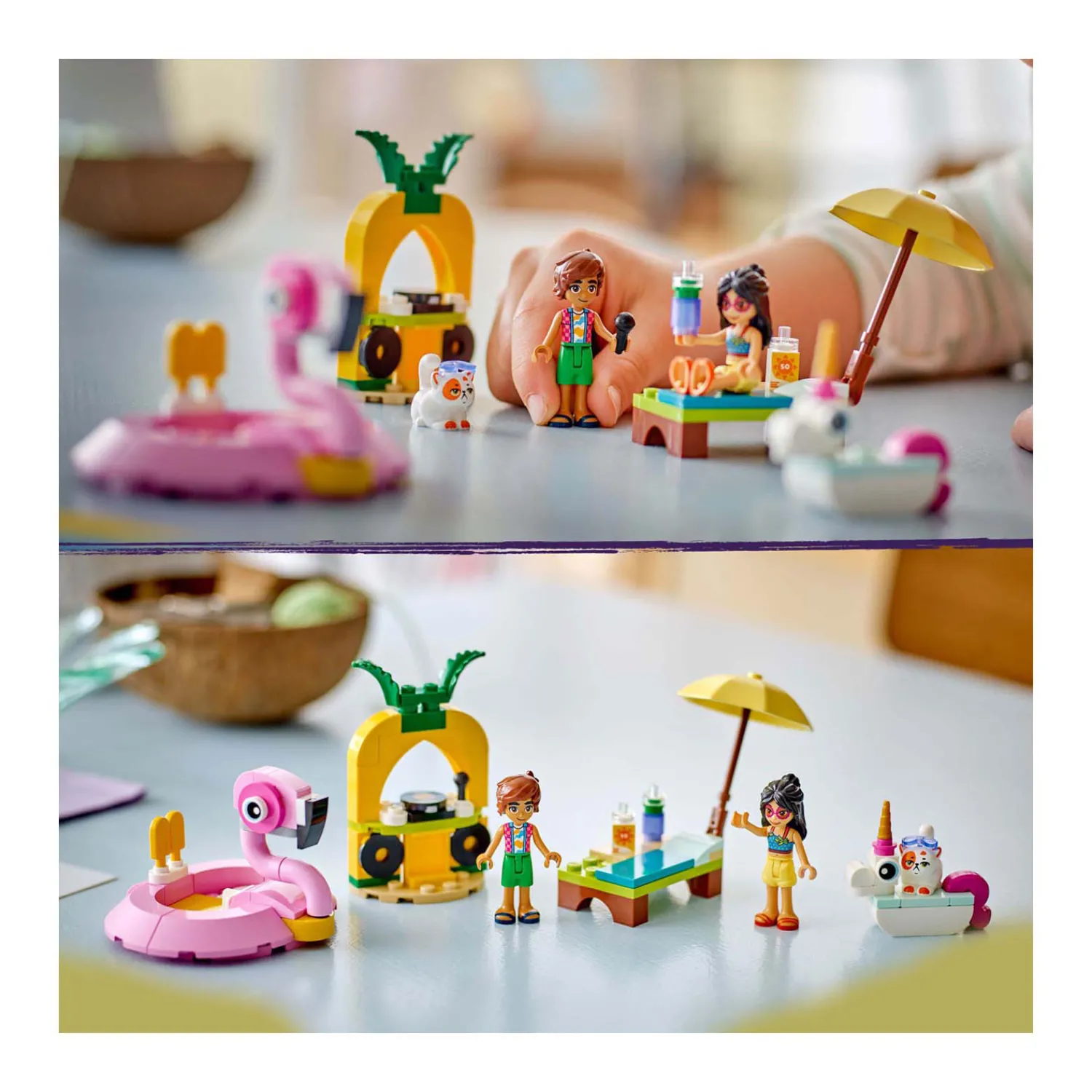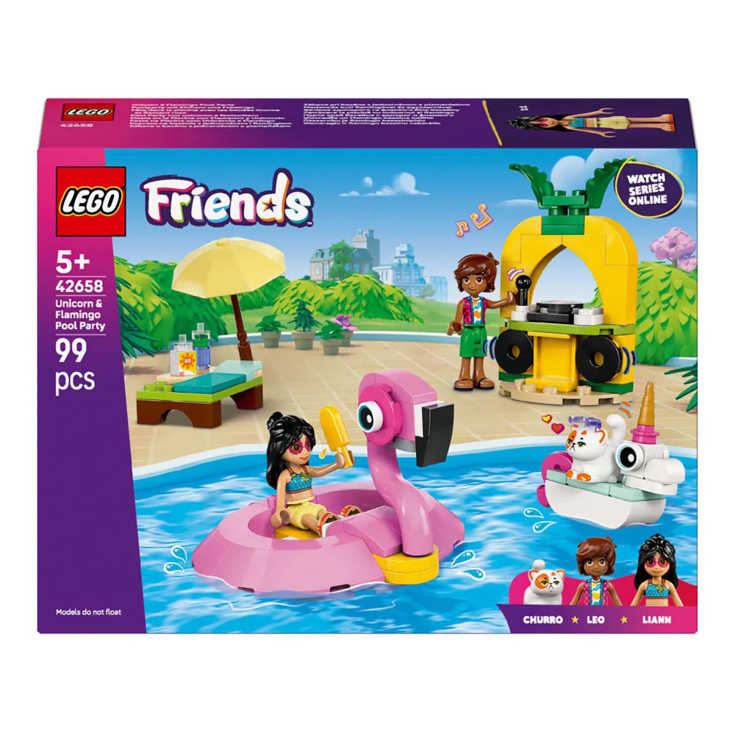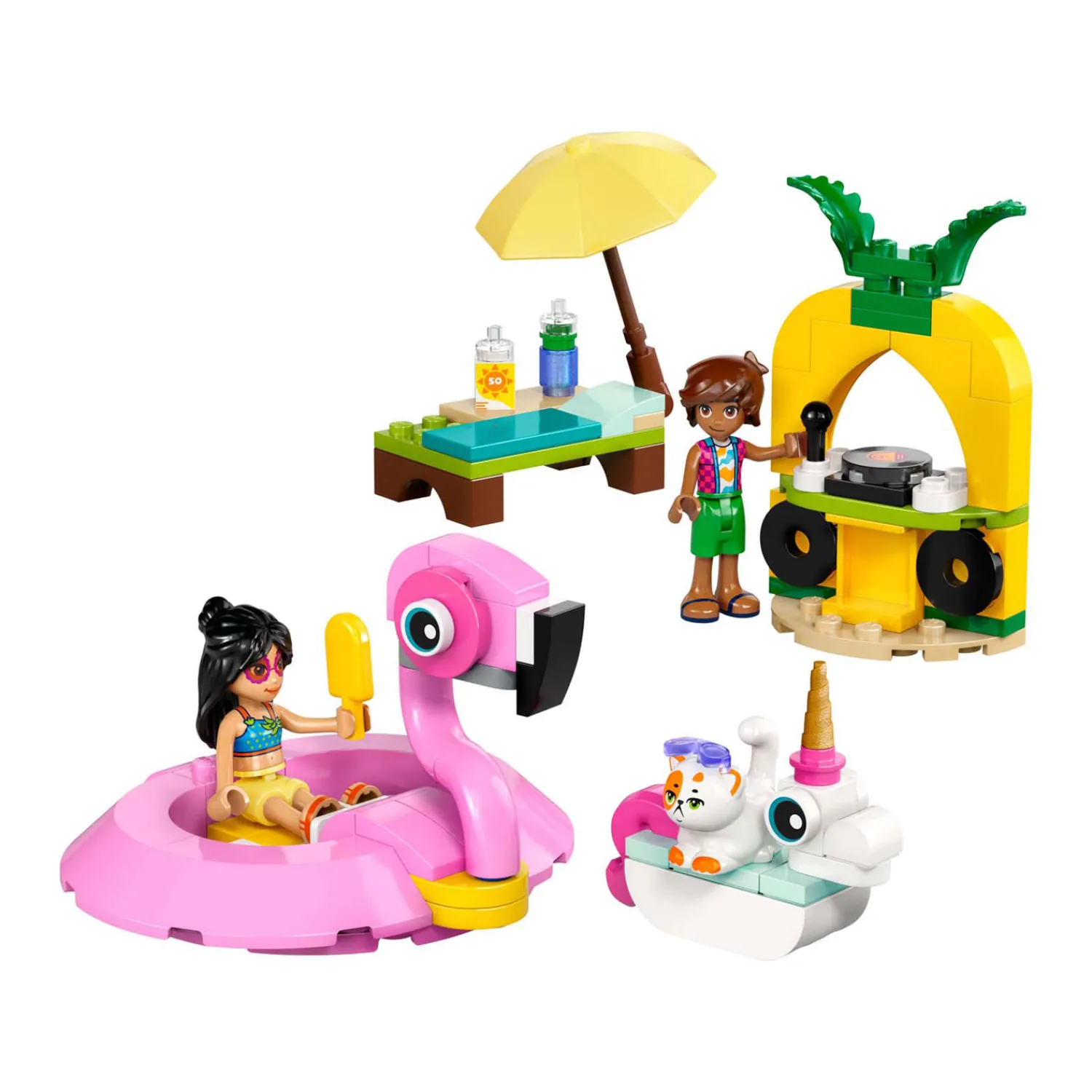 Kinderen kunnen verhalen naspelen over Leo, Liann en Churro die genieten van een zwembadfeestje in hun eenhoorn- en flamingozwembanden. De bouwbare flamingozwemband biedt plaats aan 2 personages en is voorzien van een houder voor de 2 ijslolly’s. De kleinere eenhoornzwemband is ideaal voor Churro de kat. Er is ook een ligstoel, een dj-booth met plaat en microfoon, een parasol en een drankje voor nog meer fantasierijke rollenspellen.