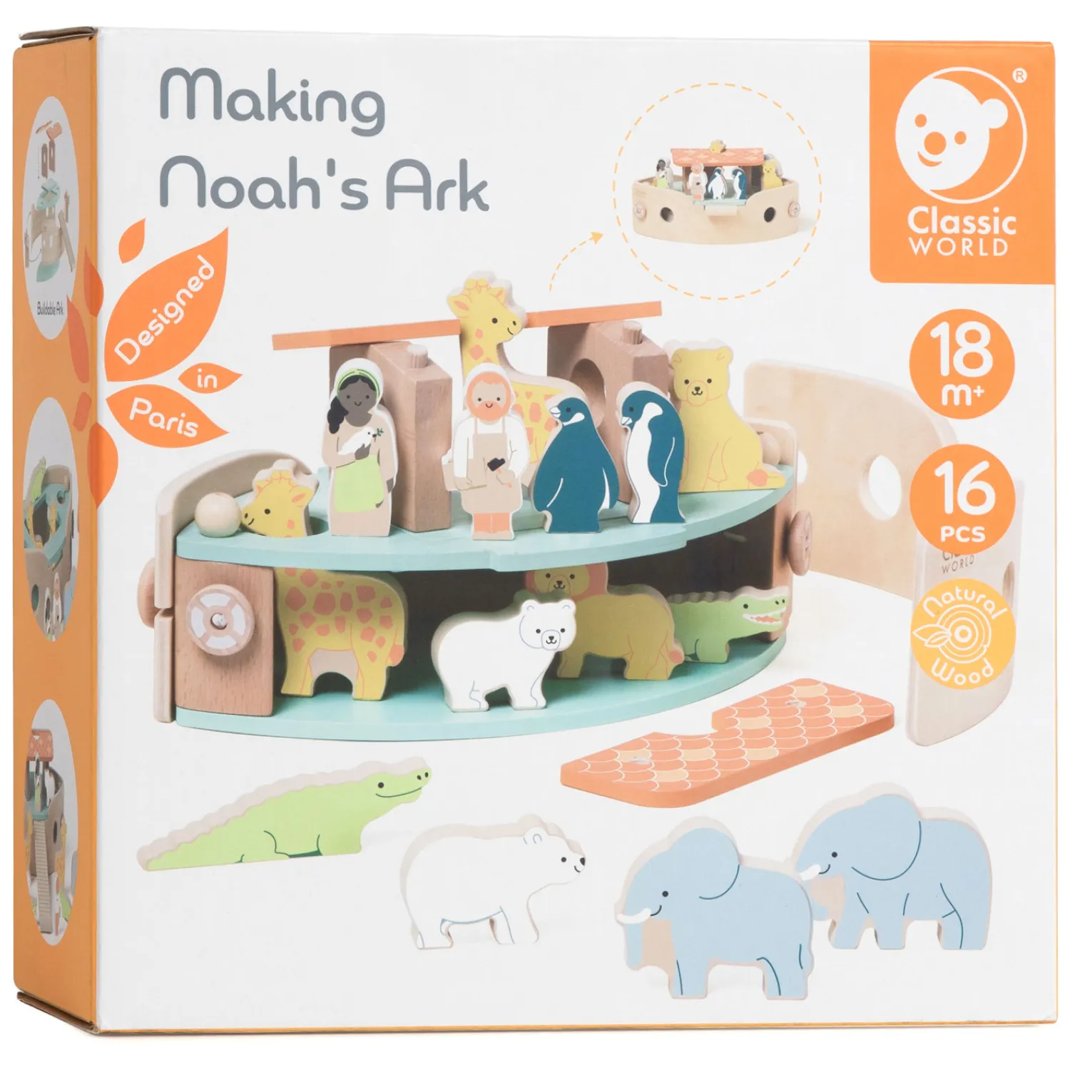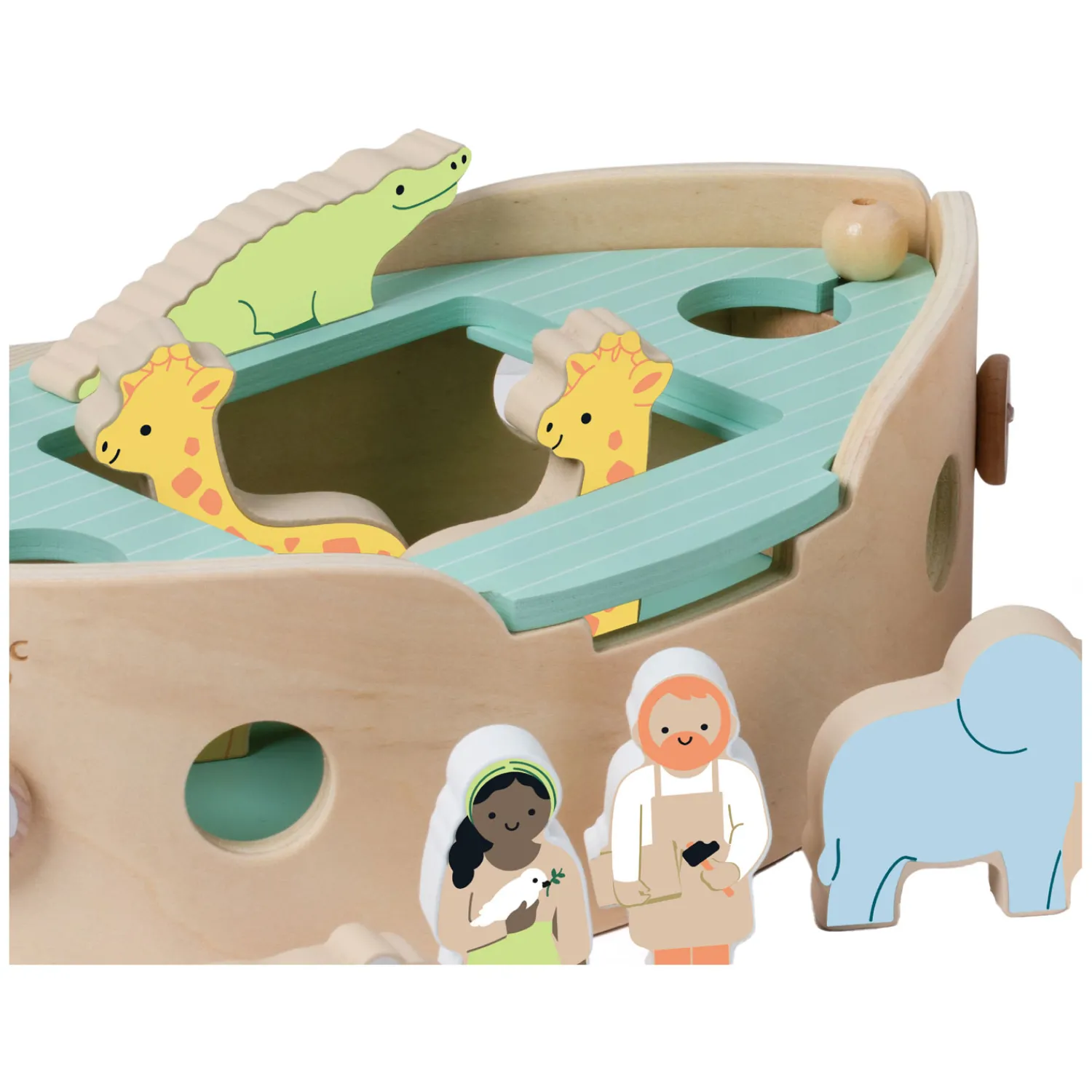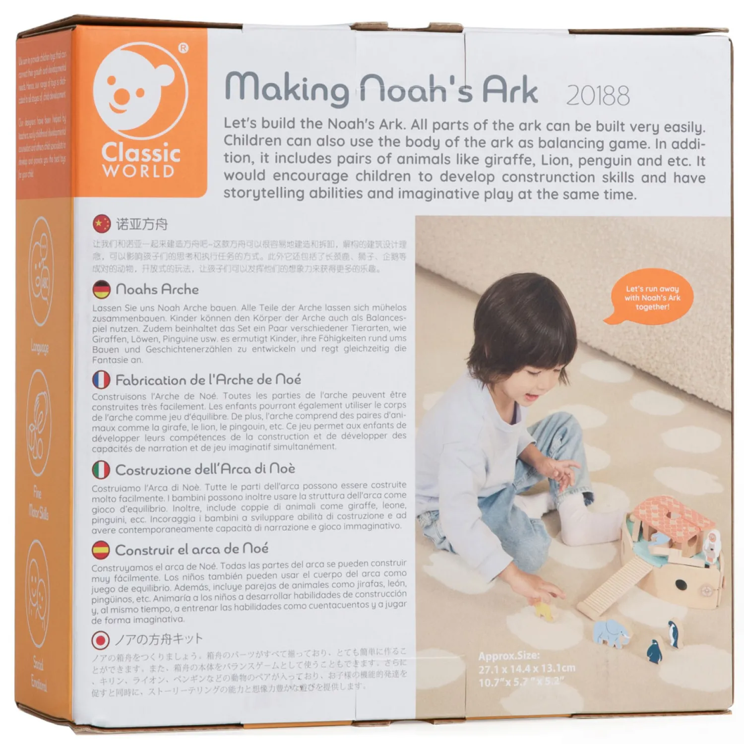 De houten ark van Noach bestaat uit 12 bouwonderdelen, 10 houten dieren en Noach en zijn vrouw. Afmetingen: 27.1 x 14.4 x 13.1 cm. Geschikt voor kinderen vanaf 18 maanden oud.