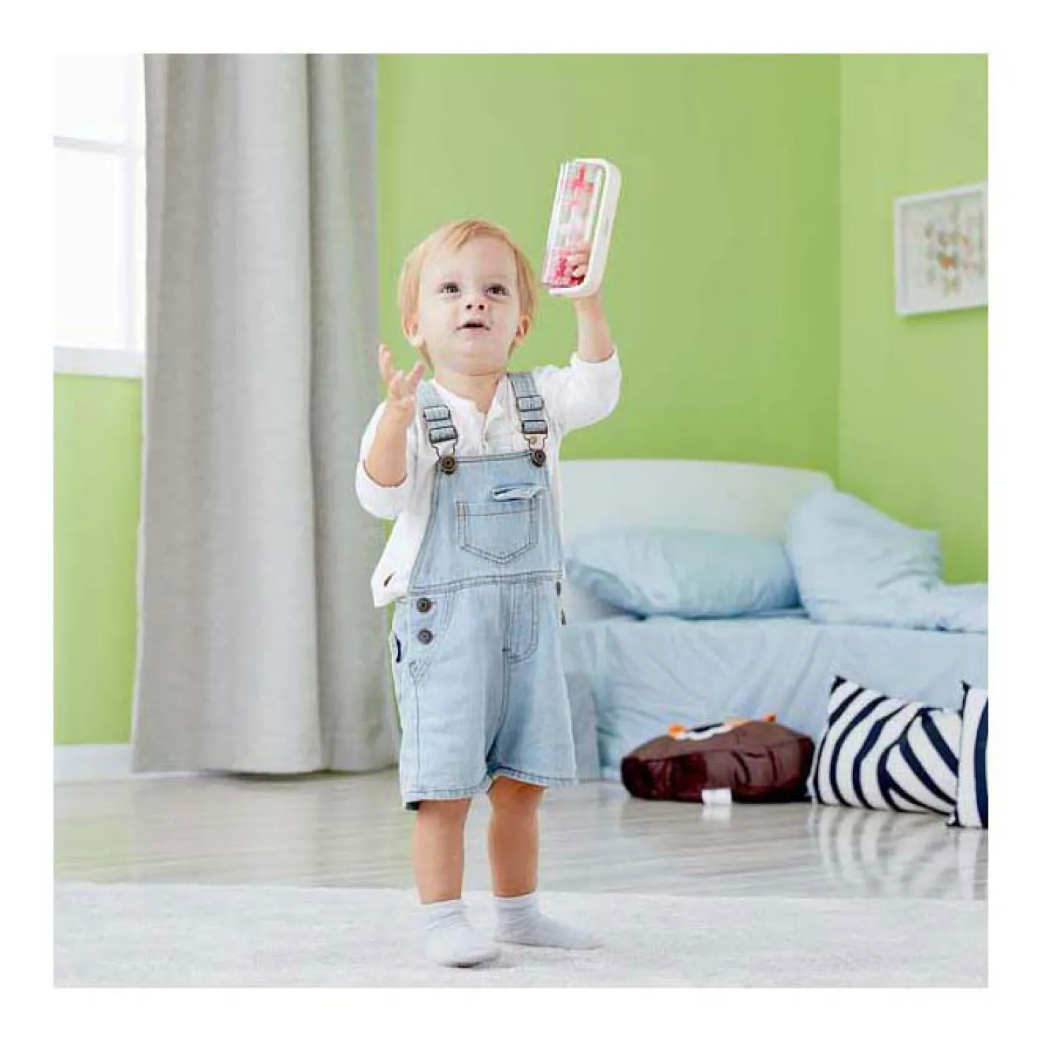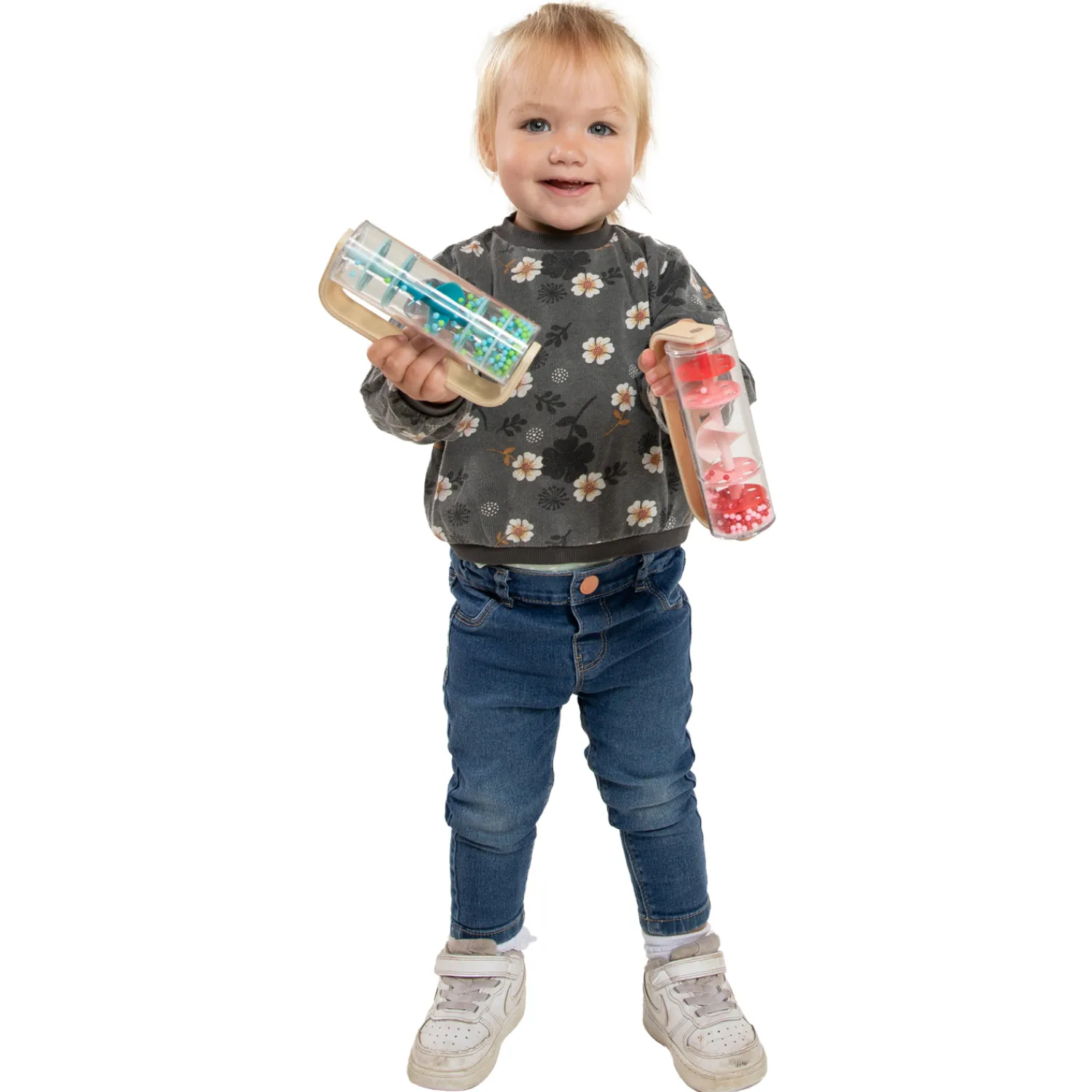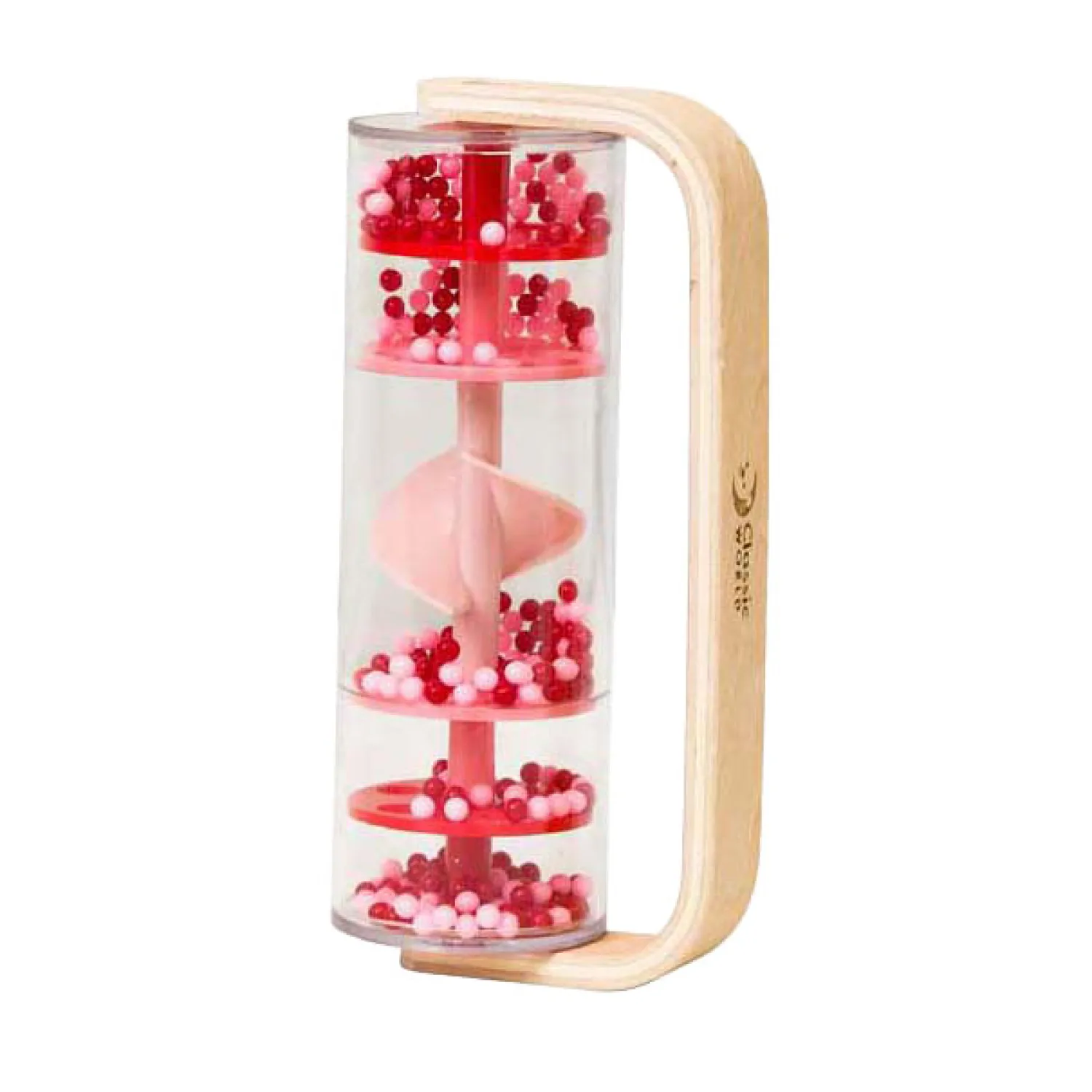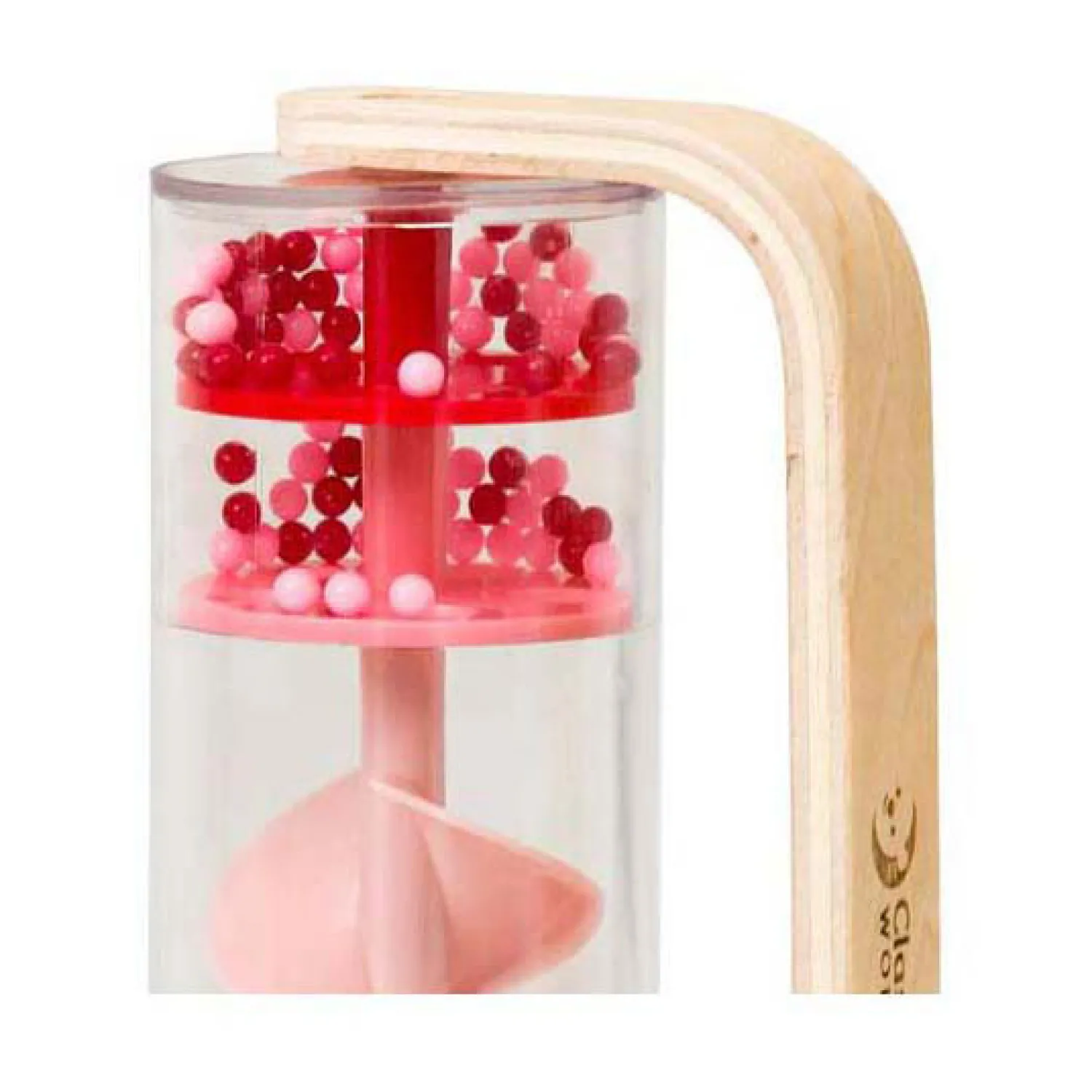 Dit mooie instrument kun je schudden en omdraaien en voor verschillende geluiden! Als je het draait, vallen de balletjes door het instrument, wat een geluid van regendruppels veroorzaakt.