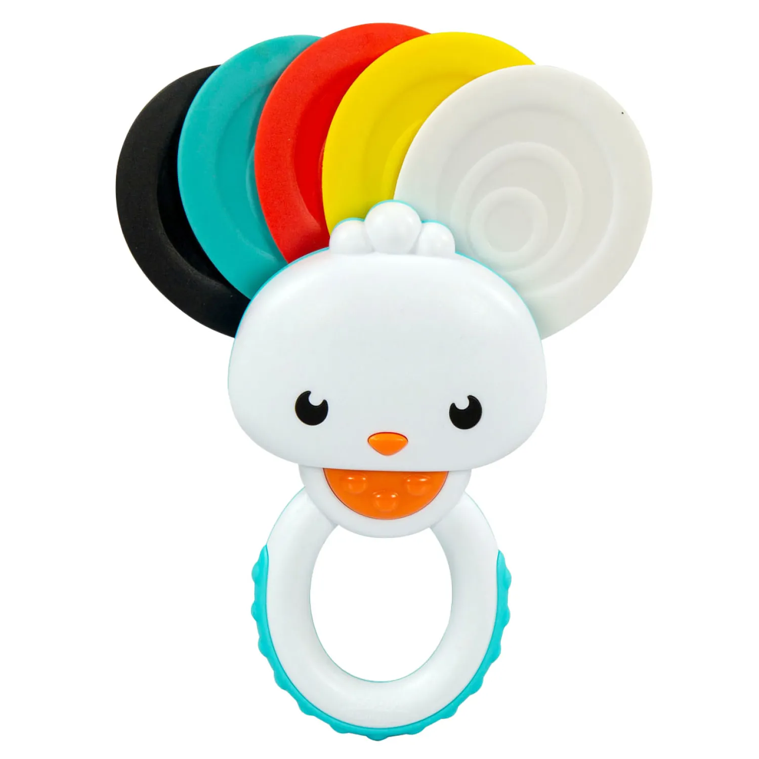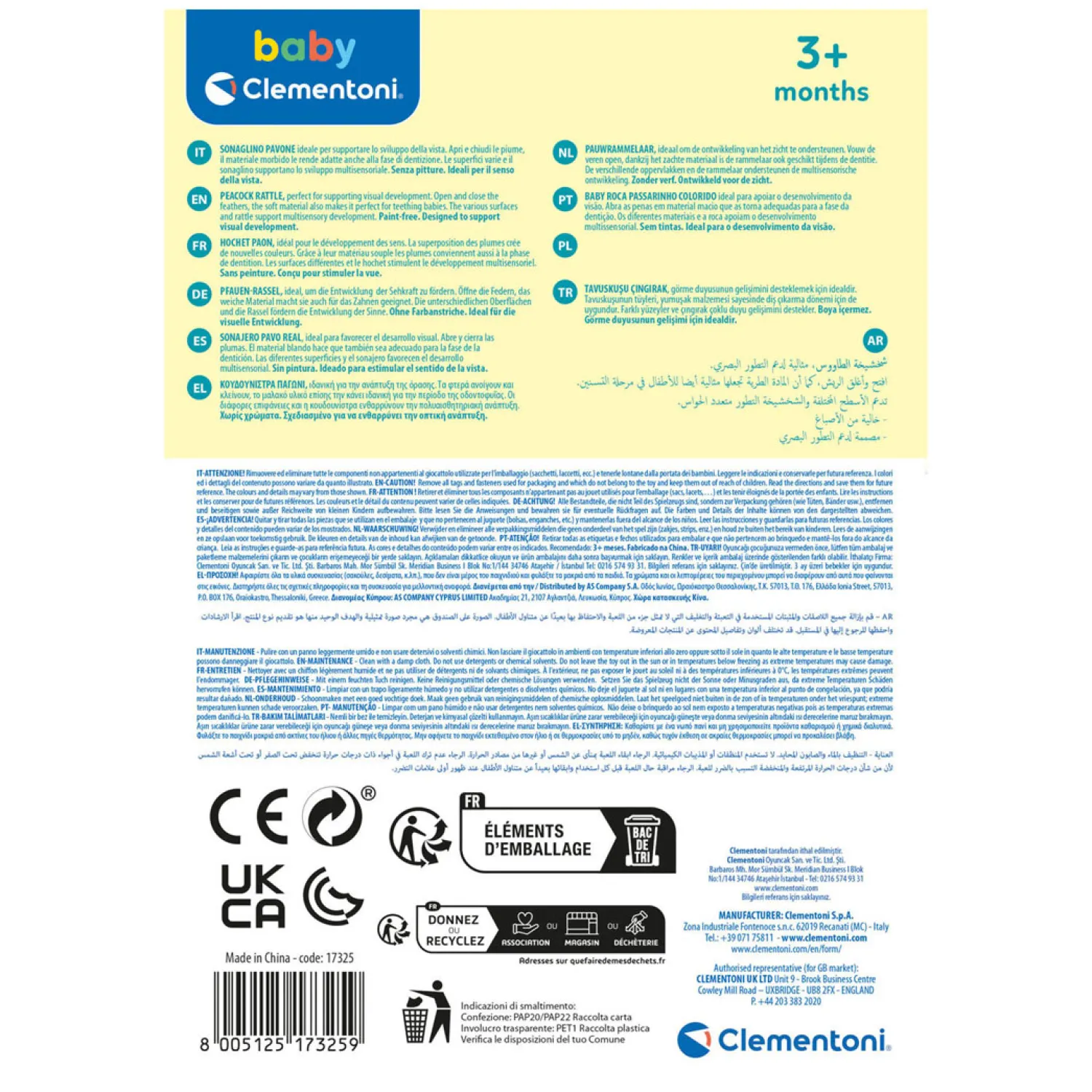 Een lieve, kleine pauwvormige rammelaar, ideaal voor het stimuleren van het zicht bij baby’s tijdens hun eerste maanden. De zachte pauwstaart is geschikt voor de dentitiefase. De veren openen en sluiten met overlappende bewegingen om nieuwe kleuren te creëren. Beschikt over een praktische ring en reliëftextuur om handmatige vaardigheden te stimuleren.