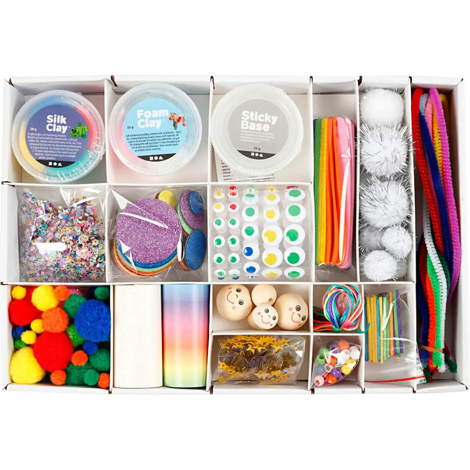 Inhoud: Foam Clay, Silk Clay, Sticky Base, kleine pailletten, pom-poms, bedrukt papier, zelfklevende wiebelogen, houten kralen met gezicht, nylon koord, plastic kralen, EVA foam figuren met glitter, ijsstokjes in verschillende kleuren , lucifers, pijpreinigers en glitter pom-poms.