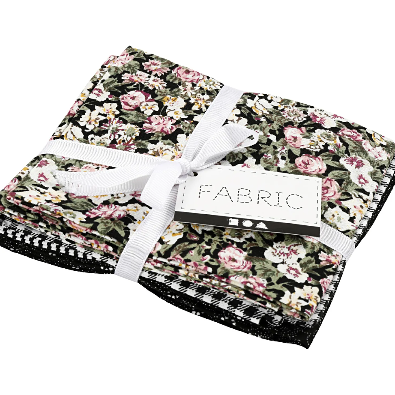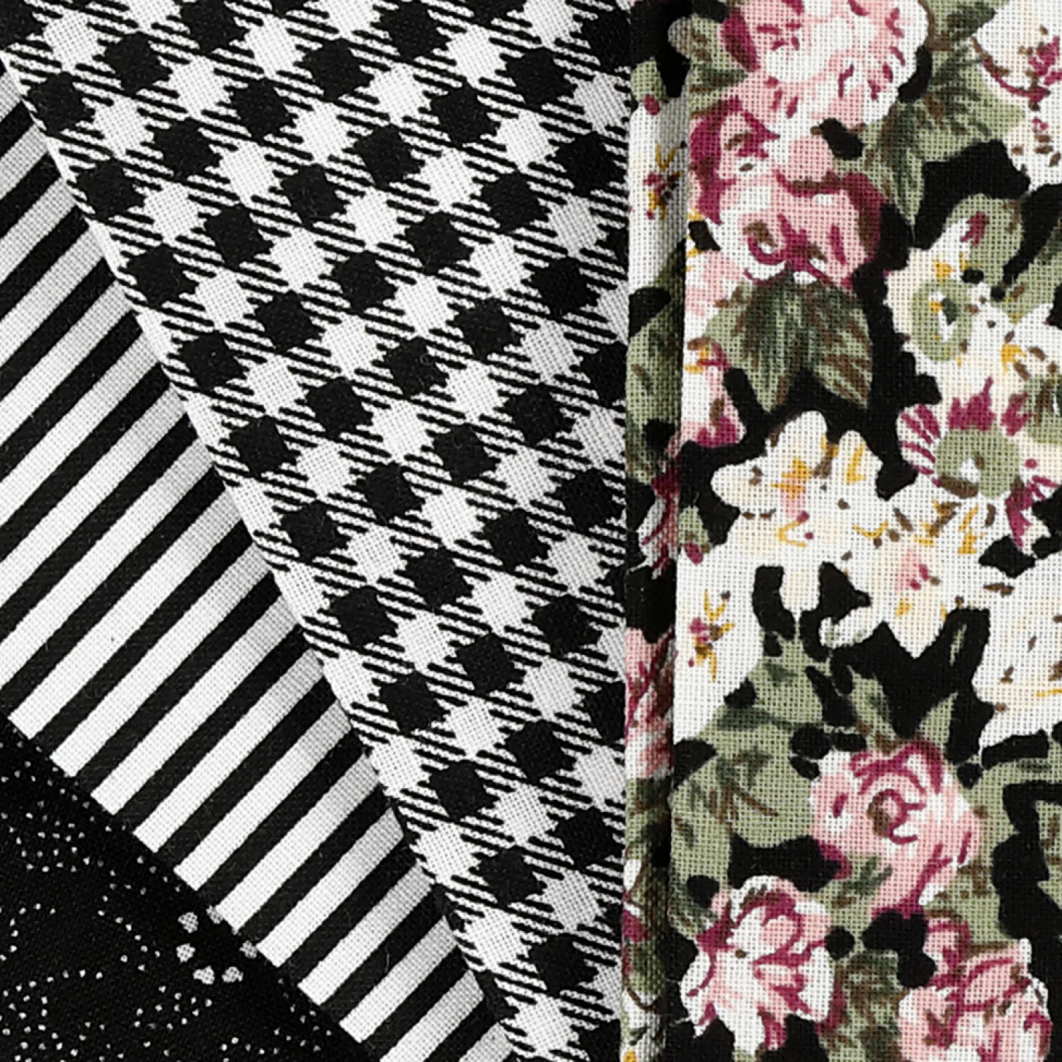 Bundel van vier verschillende, zwarte patchwork stoffen. De stof is gemaakt van 100% katoen. Afmeting: 45×55 centimeter. Gewicht: 100 gram. De stof is wasbaar op 40°C. Let op: de stof kan krimpen tot 3-5%.
