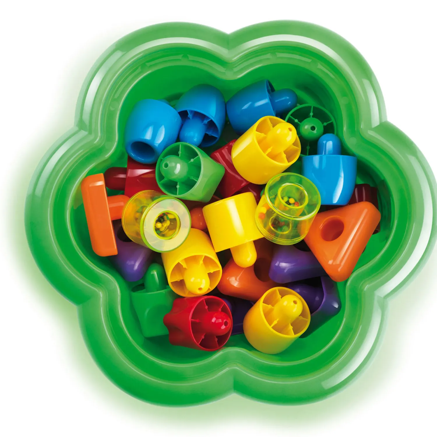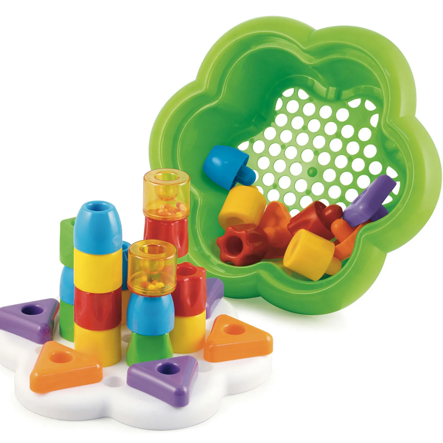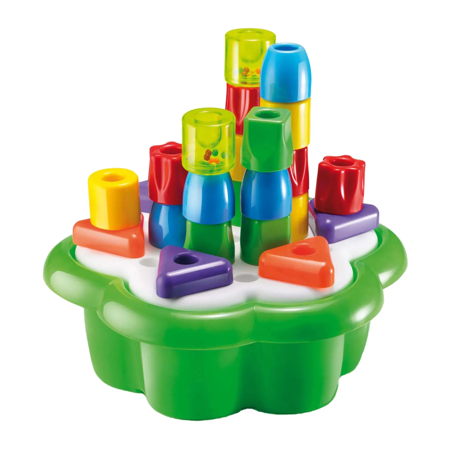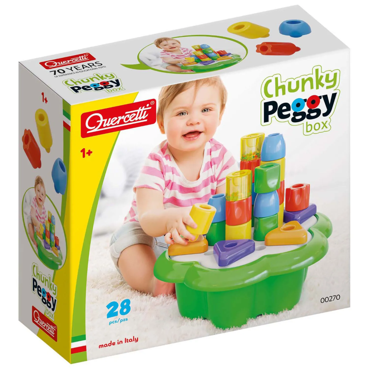 De Quercetti Daisy blokkendoos met zijn bijzondere ontwerp gemaakt van ronde vormen. Dit maakt het gemakkelijk en leuk voor baby’s en peuters om met de verschillende kleuren dikke pinnen te spelen en deze in het bloemvormige bord te steken of ze te stapelen om zo allerlei spannende torens te bouwen. De set bevat tevens 2 rammelaars in de vorm van 2 kleine cilinders. Uitstekend voor de hand-oogcoördinatie. Alle 26 vormen passen makkelijk in de bloemvormige emmer en is dus in zijn geheel makkelijk op te bergen. Geschikt voor kinderen vanaf 1 jaar.