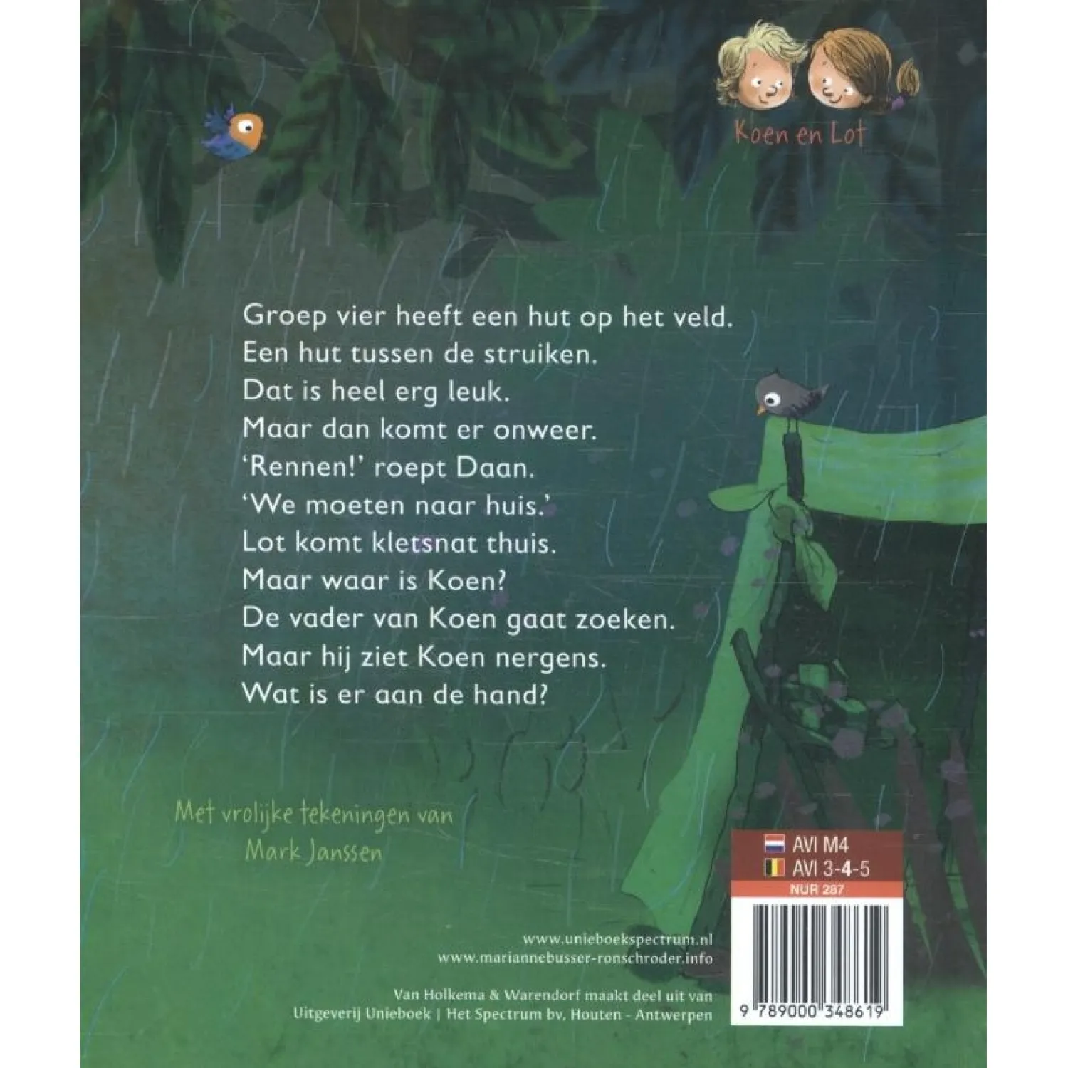 Groep 4 heeft een hut tussen de struiken op het veld. Dat is heel erg leuk, maar dan komt er onweer. Ze rennen vlug naar huis en Lot komt kletsnat thuis. Maar waar is Koen? Zijn vader gaat hem zoeken, maar ziet hem nergens. Wat zou er aan de hand zijn?