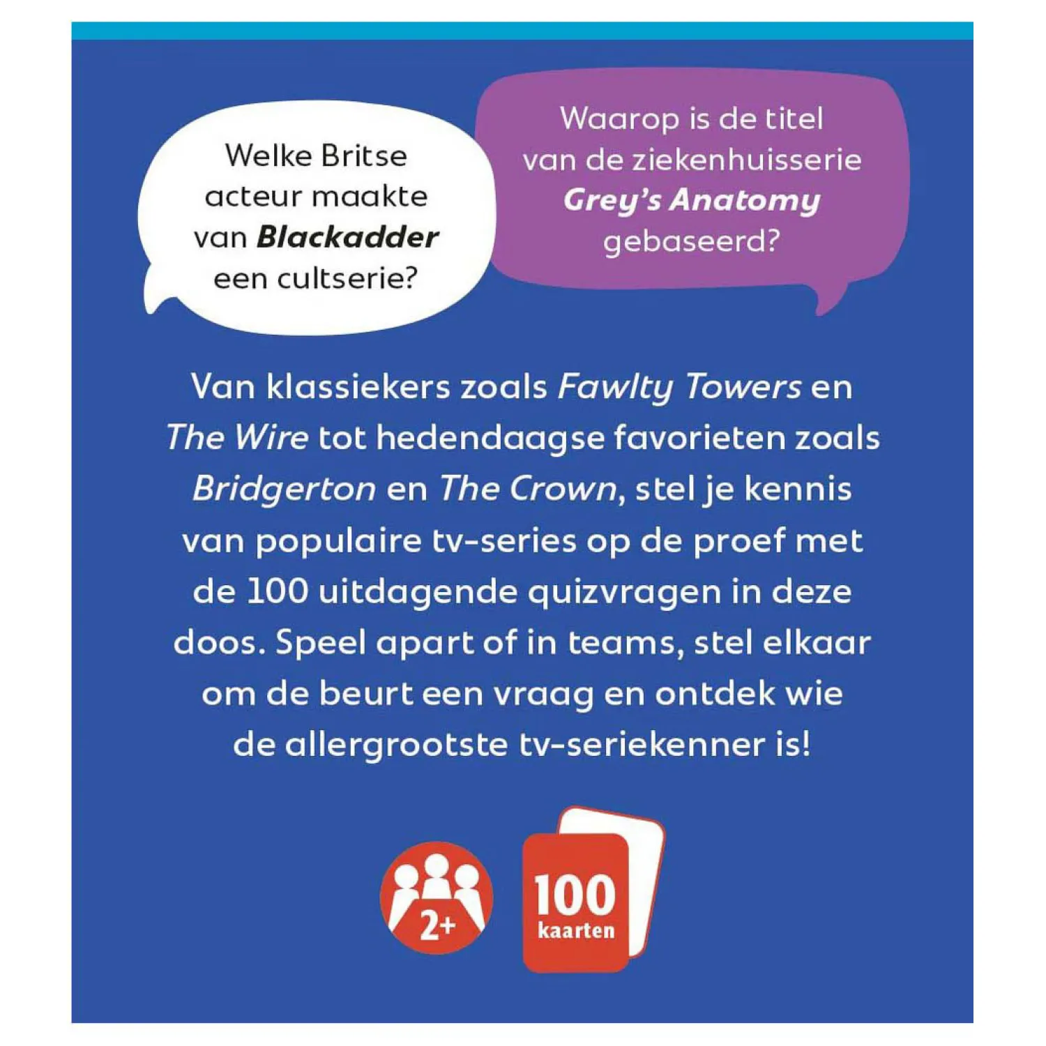Van klassiekers zoals Fawlty Towers en The Wire tot hedendaagse favorieten zoals Bridgerton en The Crown, stel je kennis van populaire tv-series op de proef met de 100 uitdagende quizkaarten in deze doos. Welke Britse acteur maakte van Blackadder een cultserie? En waarop is de titel van de ziekenhuisserie Grey’s Anatomy gebaseerd? Speel apart of in teams, stel elkaar om de beurt een vraag en ontdek wie de allergrootste tv-seriekenner is!