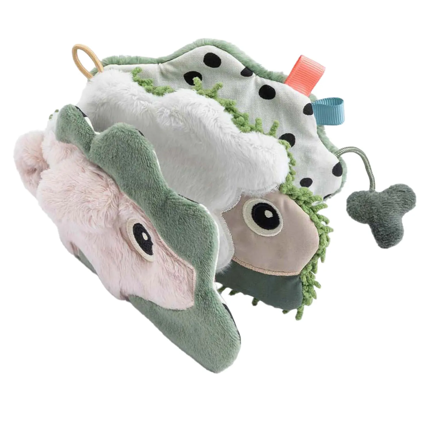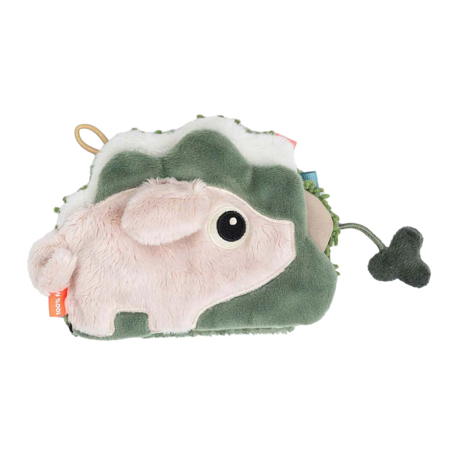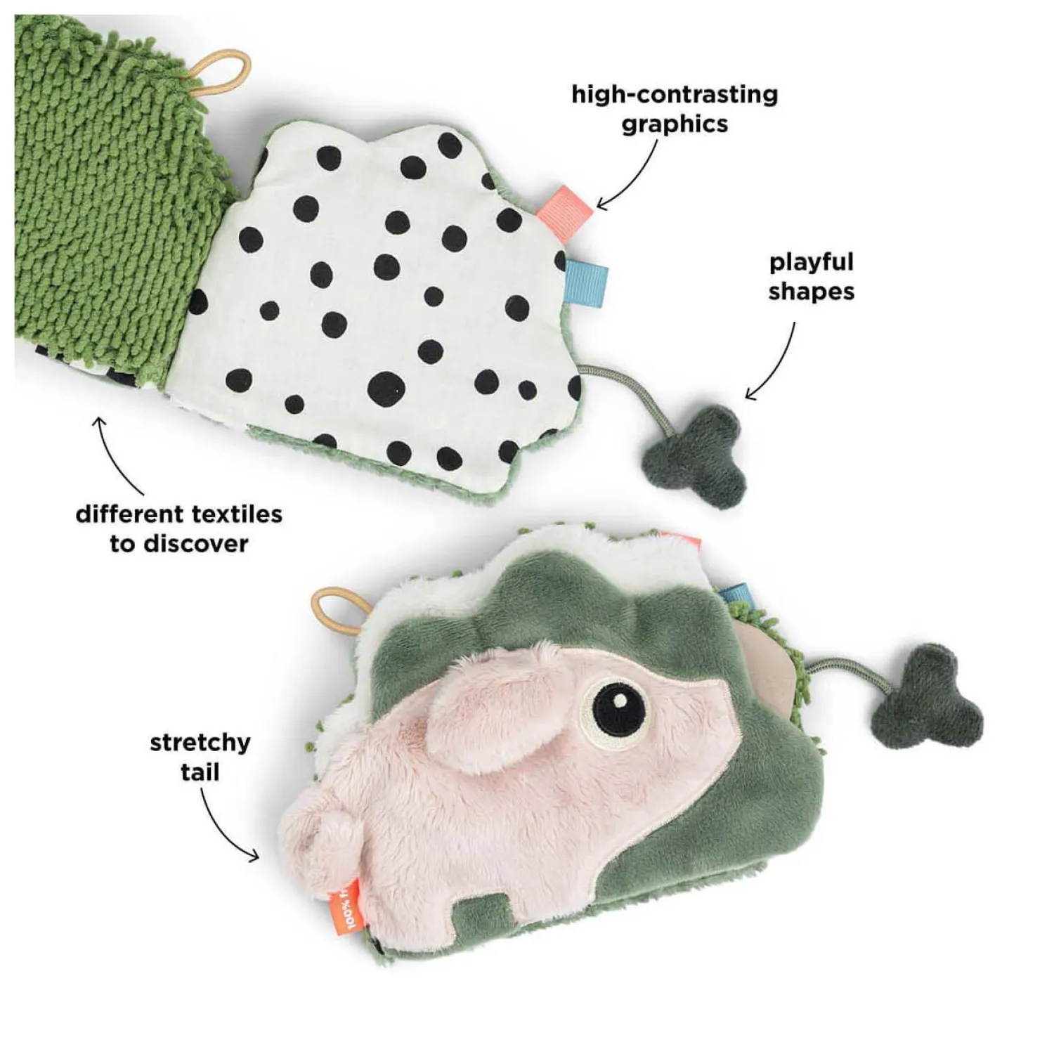 • Zintuiglijke elementen zoals knisperend, kralen en verschillende texturen stimuleren het gehoor en de tastzin van uw baby