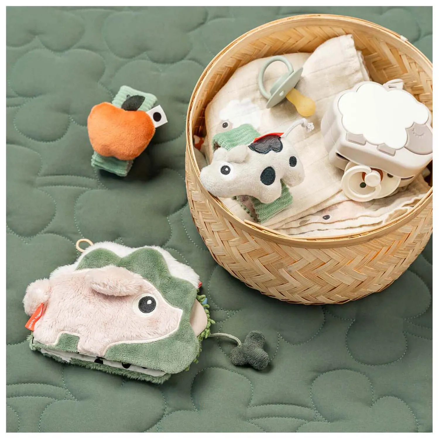 Met speelse contrasten en kleurrijke elementen biedt het boek visuele stimulatie, terwijl de hertenvriendjes uw baby troost en vermaak bieden tijdens zijn speelavonturen.