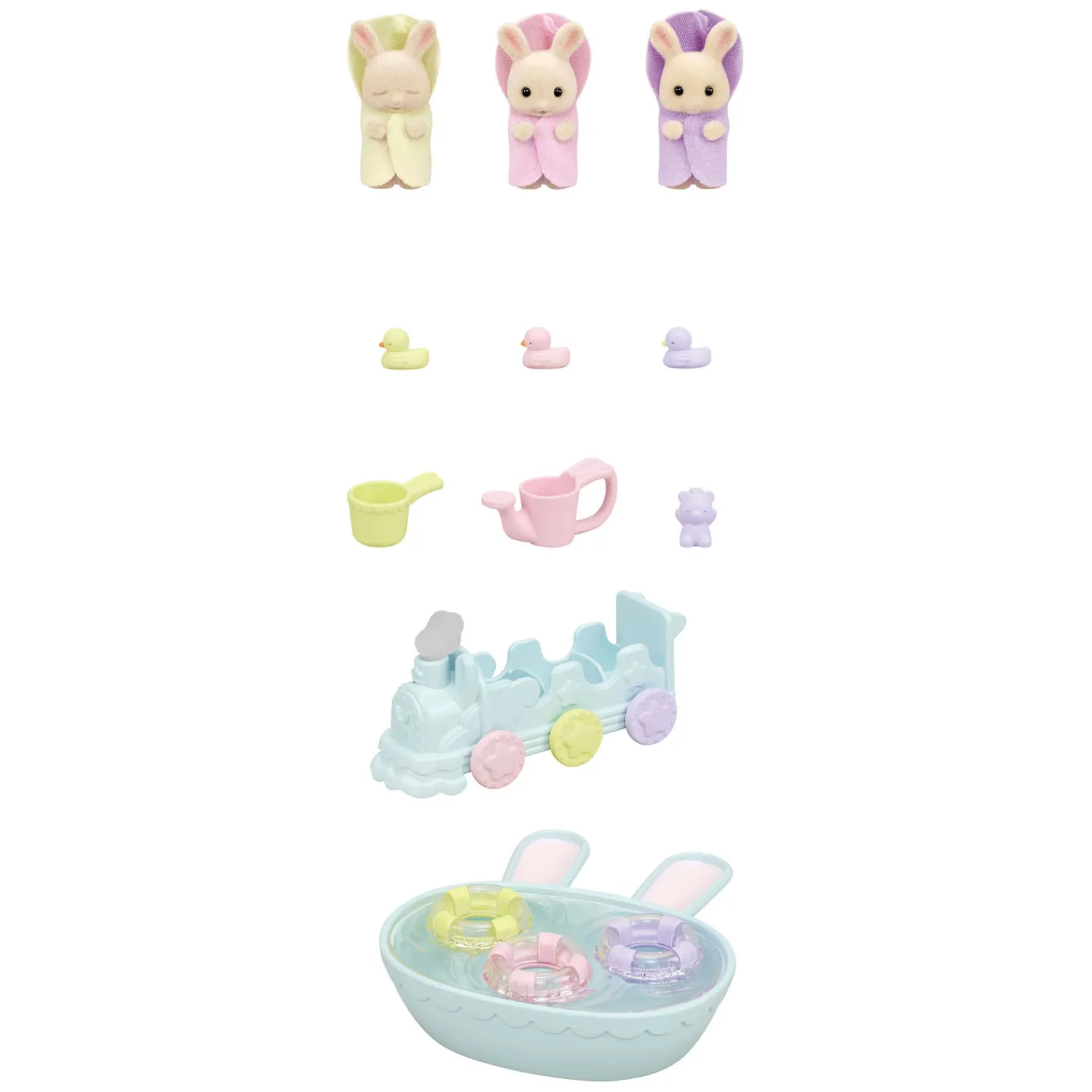 De set bestaat uit de drie pasgeboren konijnendrielingen, een babybadje met op kleur afgestemde bad eendjes plus een grote speelgoedtrein waar ze allemaal op kunnen spelen.