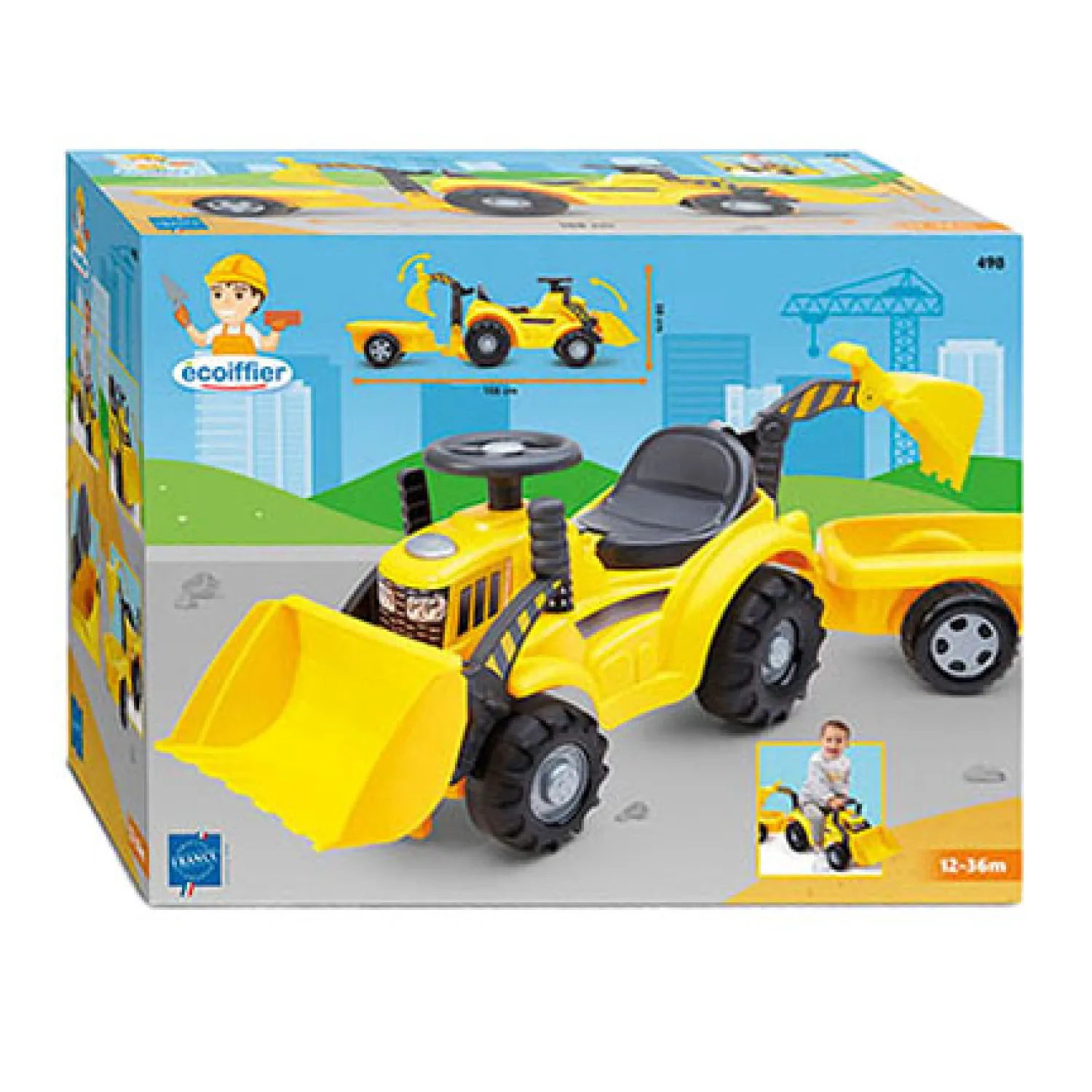 EEN SUPER GRAAFLADER: deze graaflaadmachine heeft 4 tandwielen, 1 stuurwiel, 1 hefstoel met opbergruimte, 1 voor- en achterschep en 1 aanhangwagen.