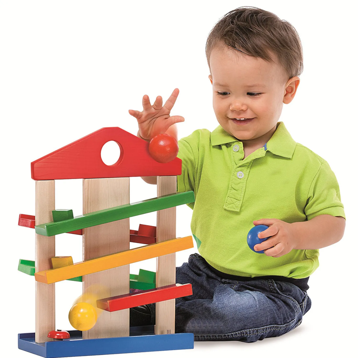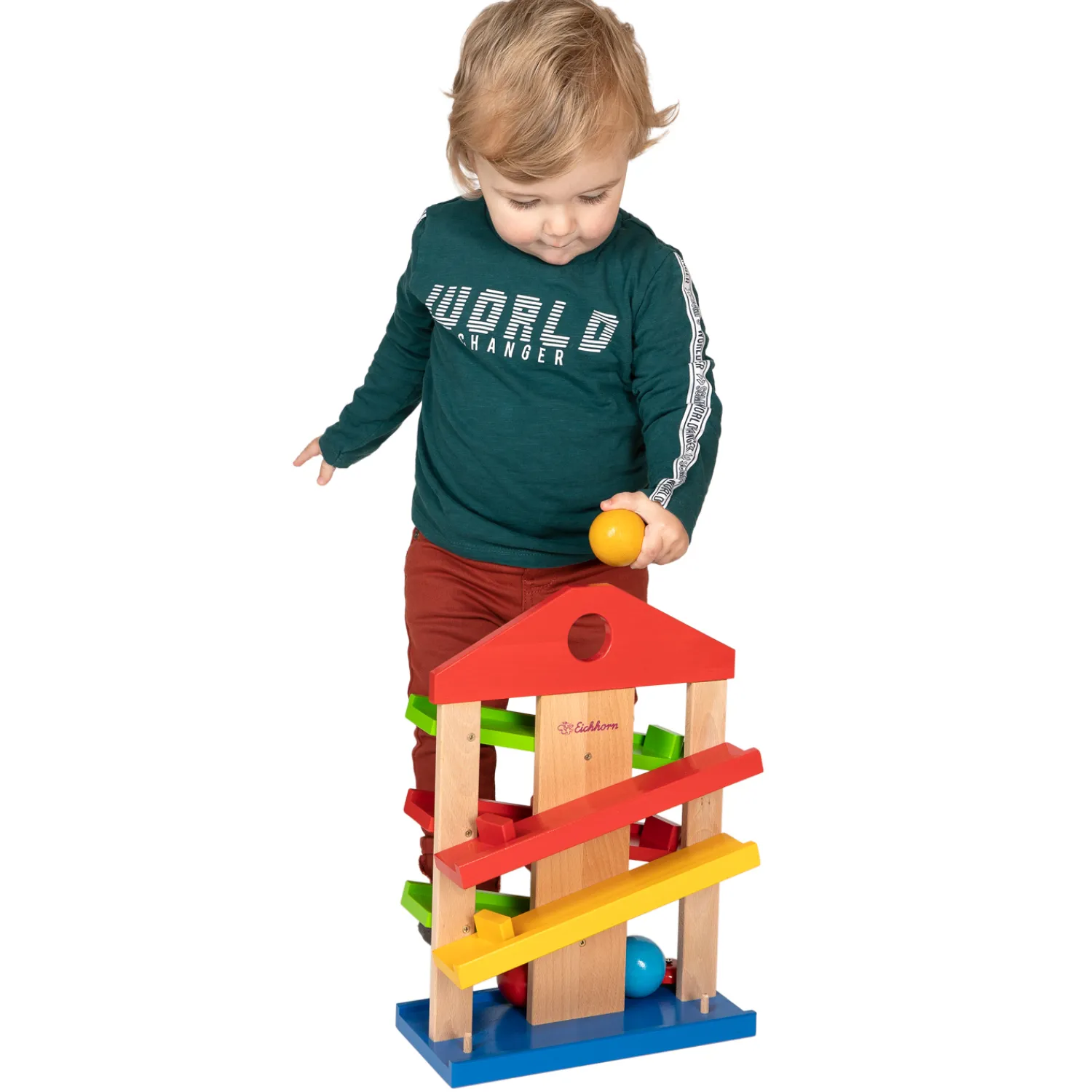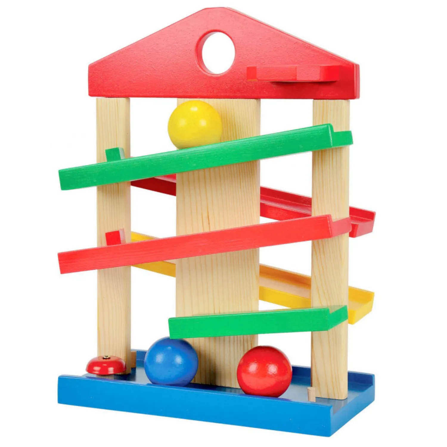 Houten ballenbaan in de vorm van een huis. Inclusief 3 ballen en bellen. Van het vertrouwde en educatieve merk Eichhorn.