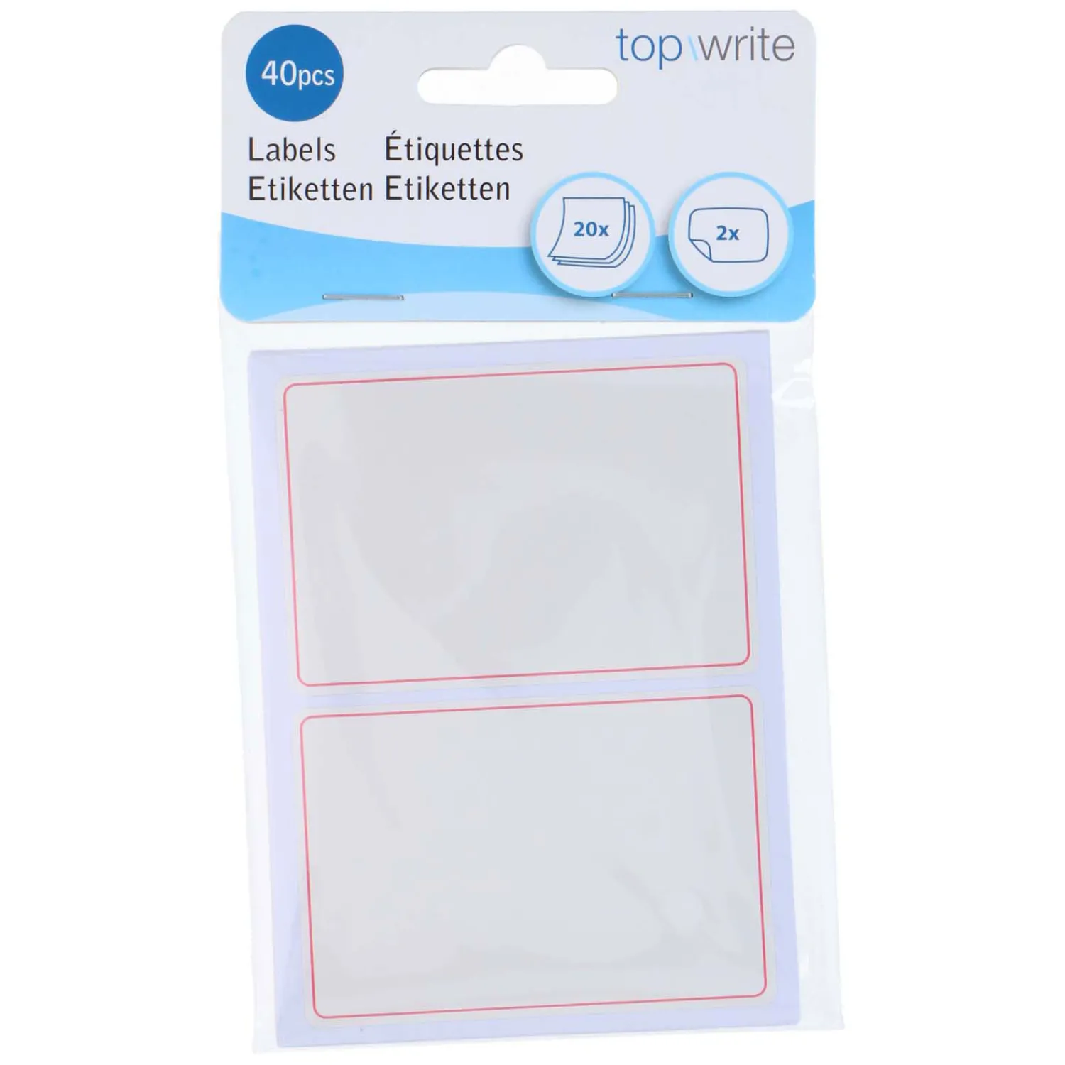 Topwrite zelfklevende etiketten. In de verpakking zitten 20 vellen met elk 2 etiketten, 40 stuks in totaal. Afmetingen etiket: 11 x 8 centimeter.