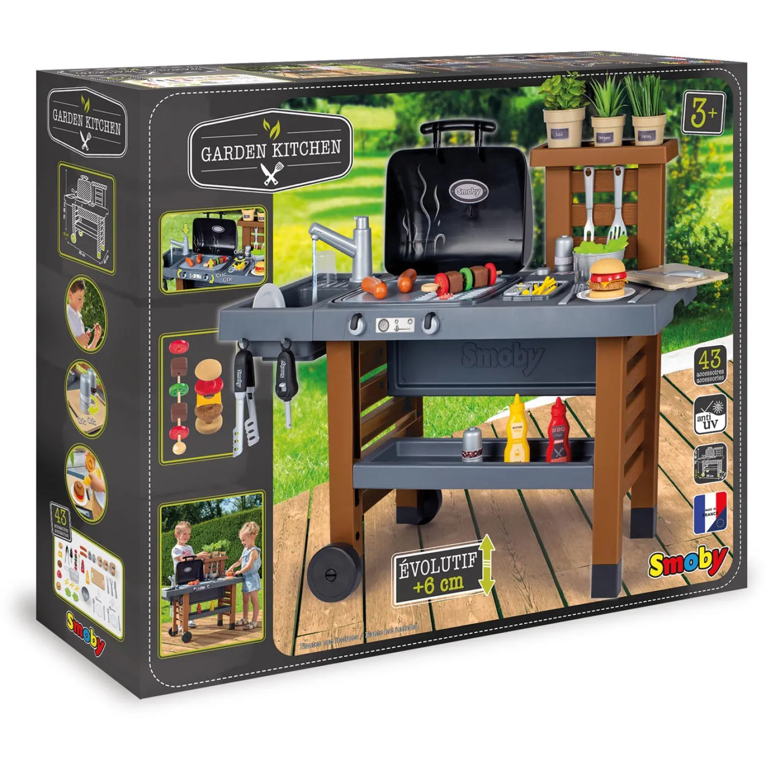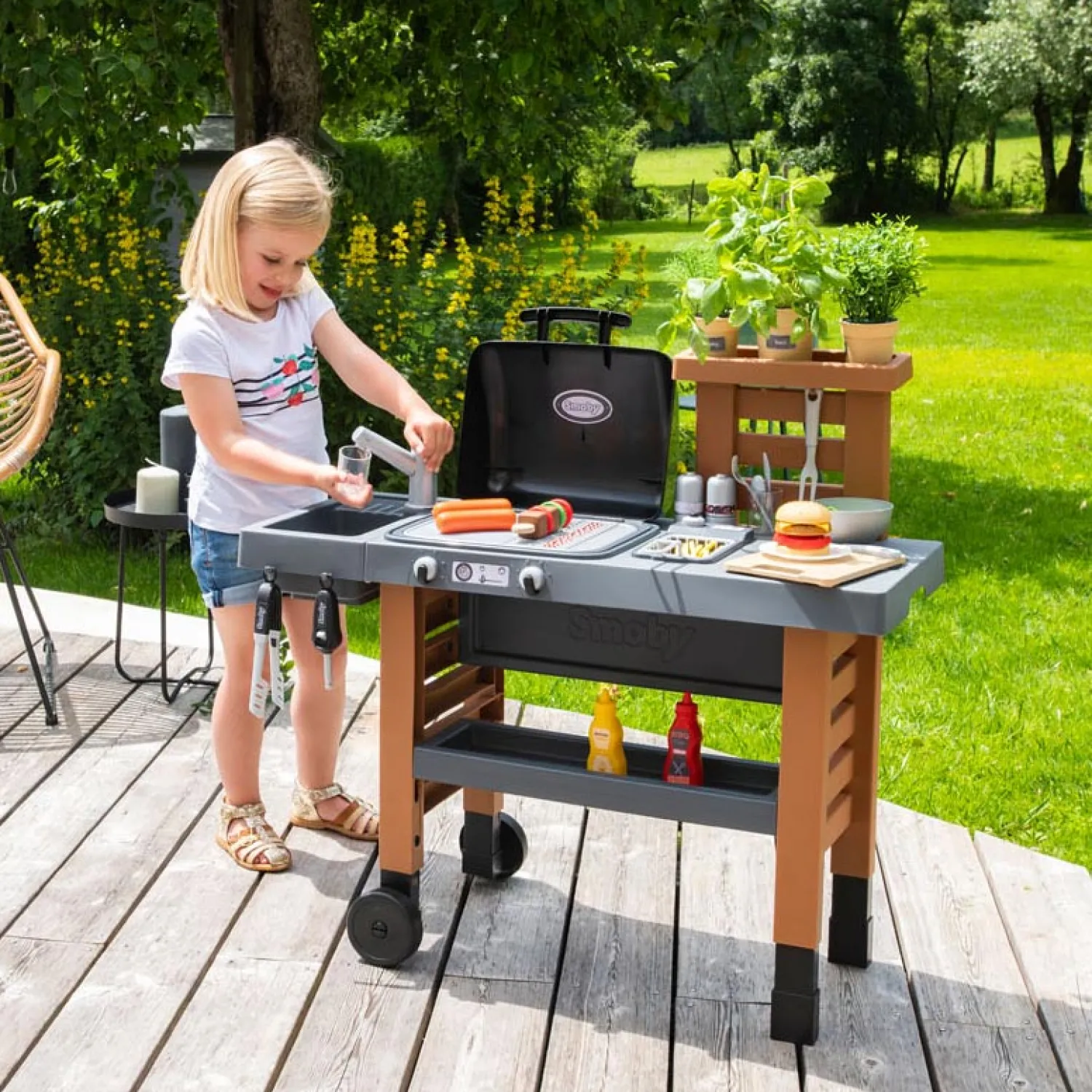Je kan deze buitenkeuken in hoogte verstellen en aanpassen aan de lengte van je kind: zo heeft het er nog langer plezier van! De legplanken en het plateau onder het werkblad bieden plaats aan de vele accessoires die bij de keuken horen.