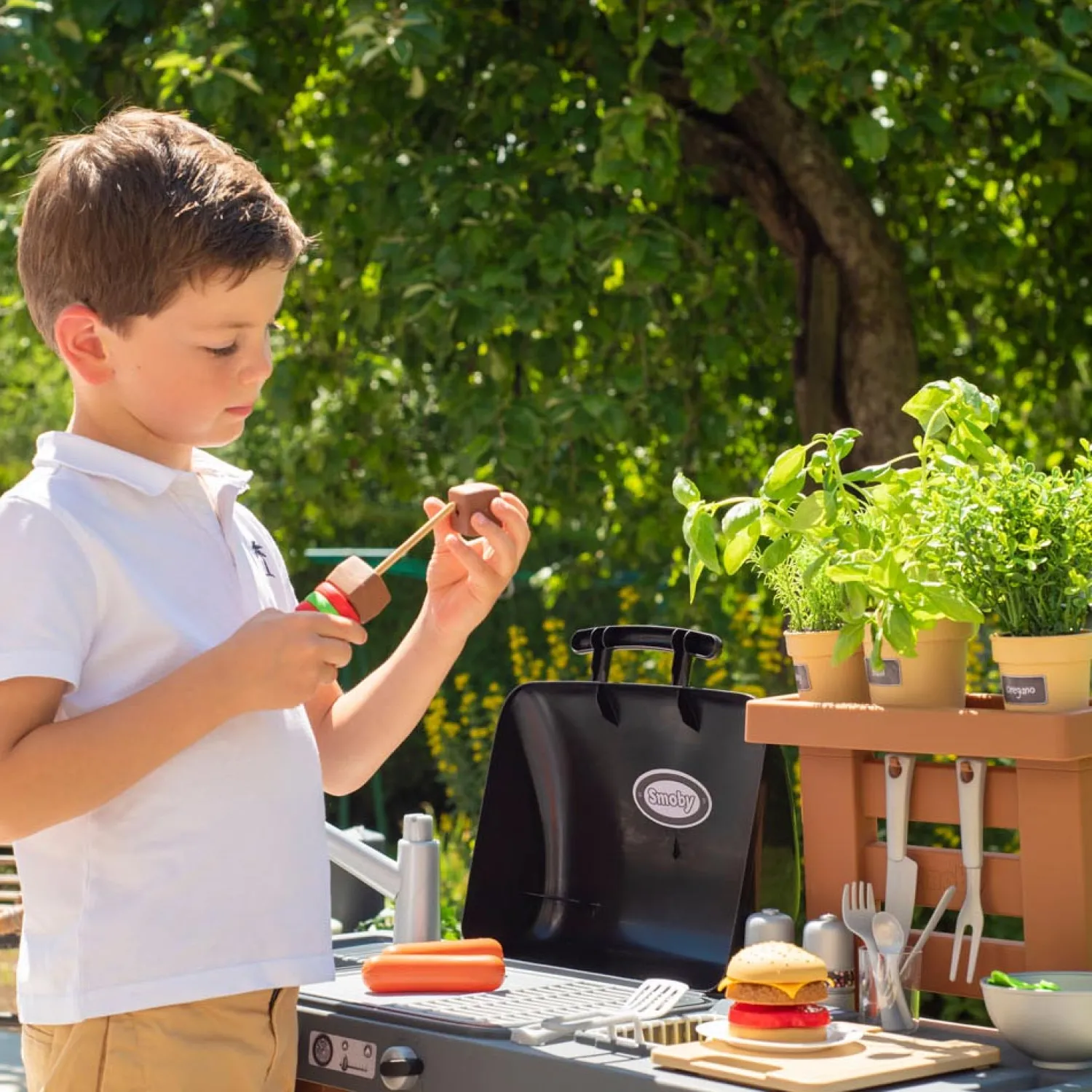 Deze Smoby keuken wordt geleverd met veel accessoires zoals 2 borden, bestek, 2 glazen, een snijplank, sausjes, slablaadjes, frietjes, worstjes, potjes om echte kruiden in te planten, een vuurstarter, enz.