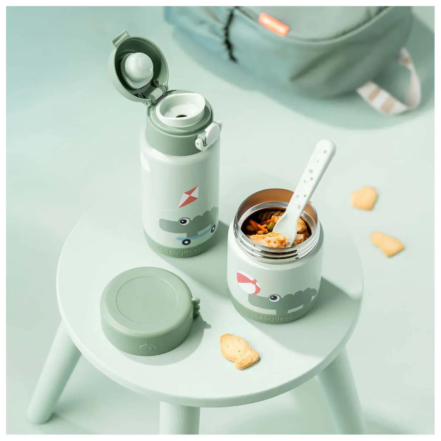 De pot in een koele groene tint wordt tot leven gebracht door de speelse Croco en Birdee, altijd klaar om lekkere traktaties te bewaken en mee te doen aan elk klein eetavontuur.