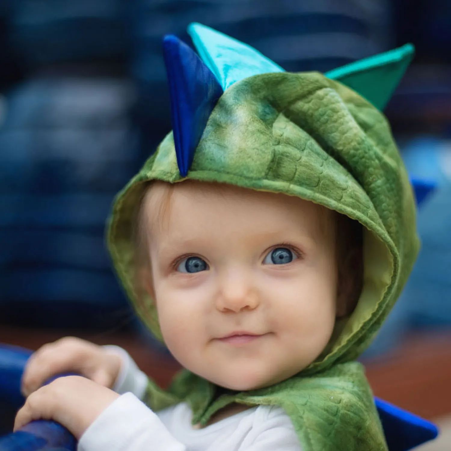 Deze drakencape is zowel stoer als eigenlijk best wel schattig, door zijn kleine formaat! Deze cape is geschikt voor kindjes van 1 tot 2 jaar, dus voor de echte kleintjes! De groene cape met reptielenprint en de blauwe stekels op de rug van de capuchon tot de onderkant maken de look van jouw kleine draak helemaal af. De cape sluit met klittenband.