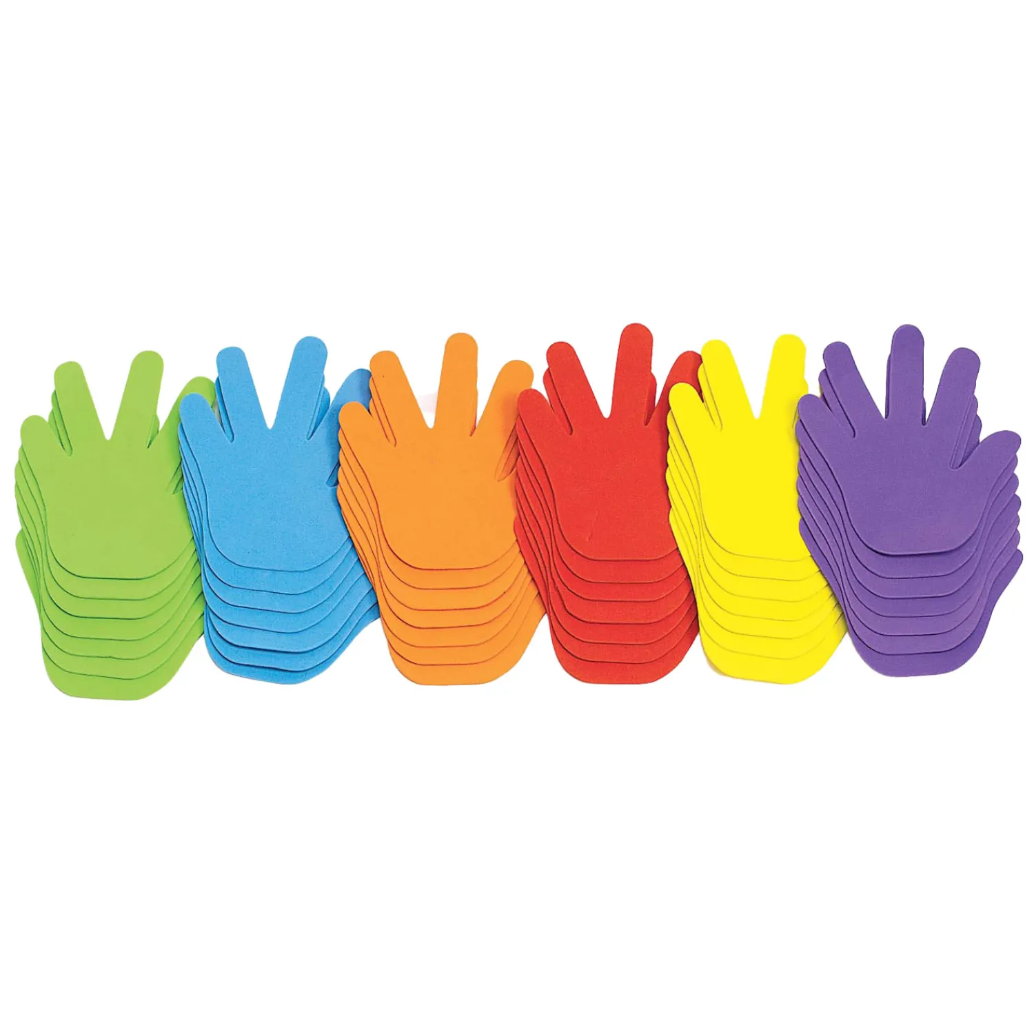 Elke handvorm is 12 cm x 11,4 cm. De handen hebben 6 oogverblindende kleuren: blauw, groen, oranje, paars, rood en geel. Van elke kleur zijn er 25 stuks.