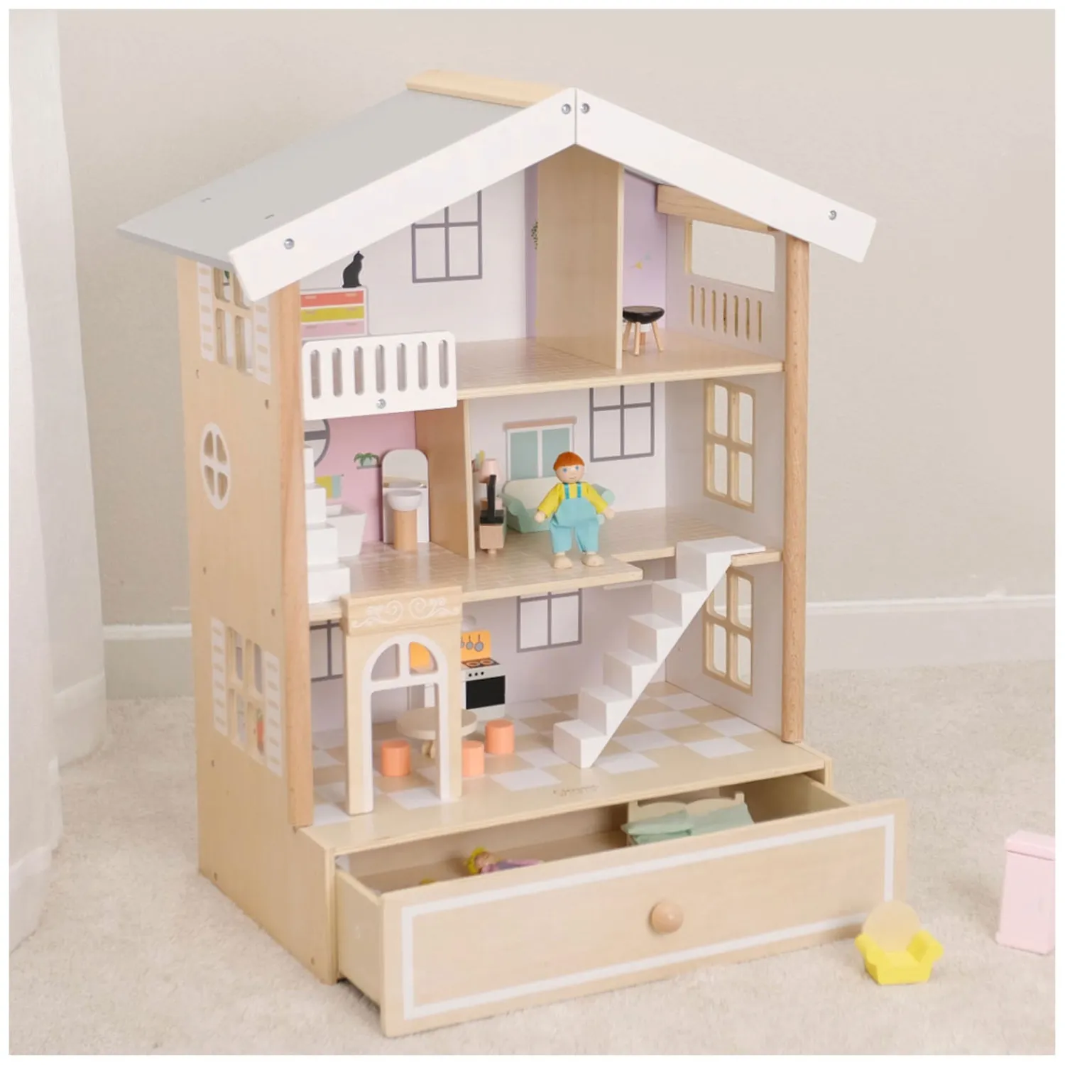 Klaar met spelen? Onder in het poppenhuis bevindt zich een lade waar je alle poppenmeubeltjes veilig kunt opbergen voor de volgende keer. Dit 28-delige poppenhuis is gemaakt van duurzaam hout en bevat allerlei prachtige designmeubelen, die net als het huis ontworpen zijn Parijs. De poppenmeubels en het houten poppenhuis zijn behandeld met kindveilige verf.