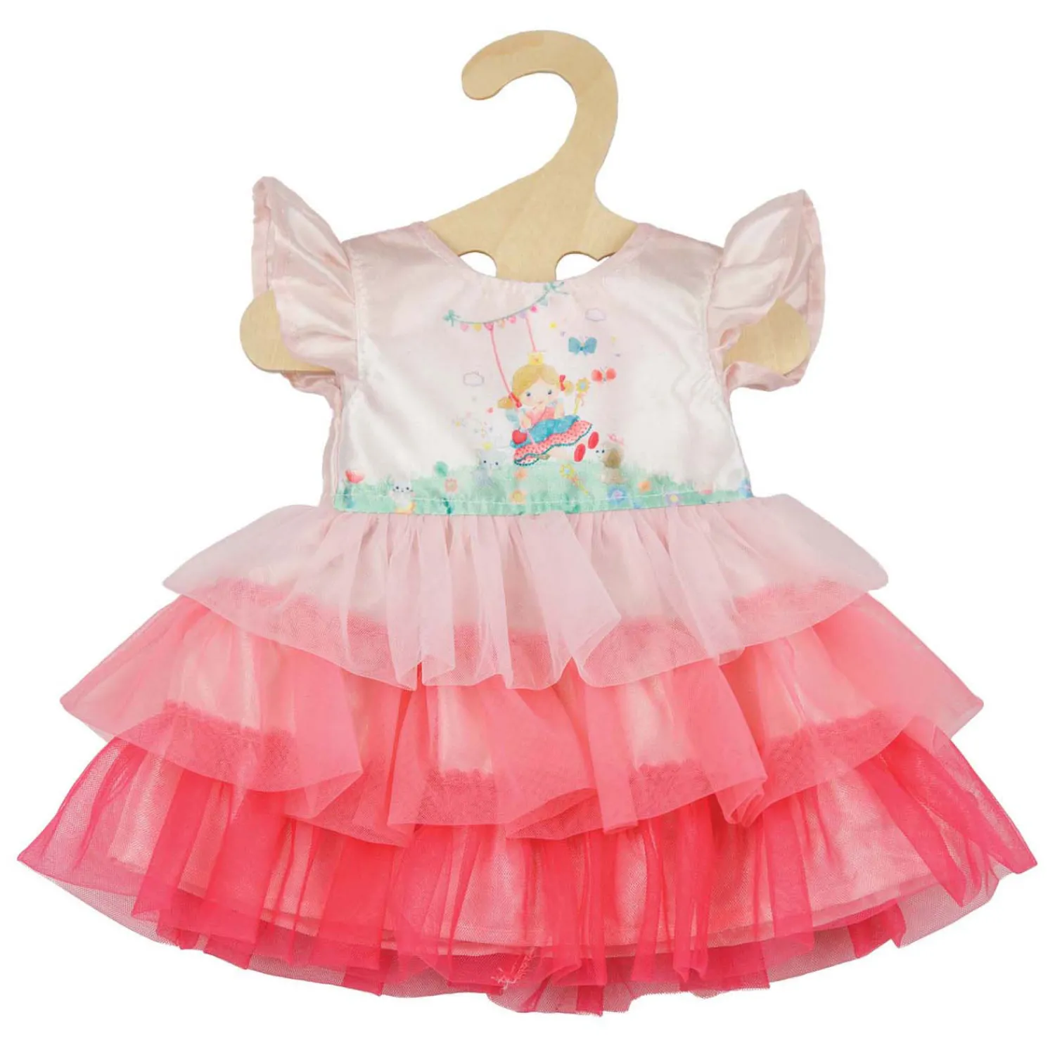 Het rompertje past op de meeste gangbare poppen van maat 35-45 cm.Geschikt voor kinderen vanaf 18 maanden.De prachtige poppenjurk ‘Prinses Emily’ verandert je pop in een betoverende schoonheid. De zacht lichtroze glinsterende top heeft een print van de verrukkelijke prinses Emily, sierlijk swingend in haar magische wereld. De levendige roze tule volants voegen een speels, helder contrast toe, terwijl de gouden glitterkroon en roze hartvormige tas deze grillige outfit compleet maken.