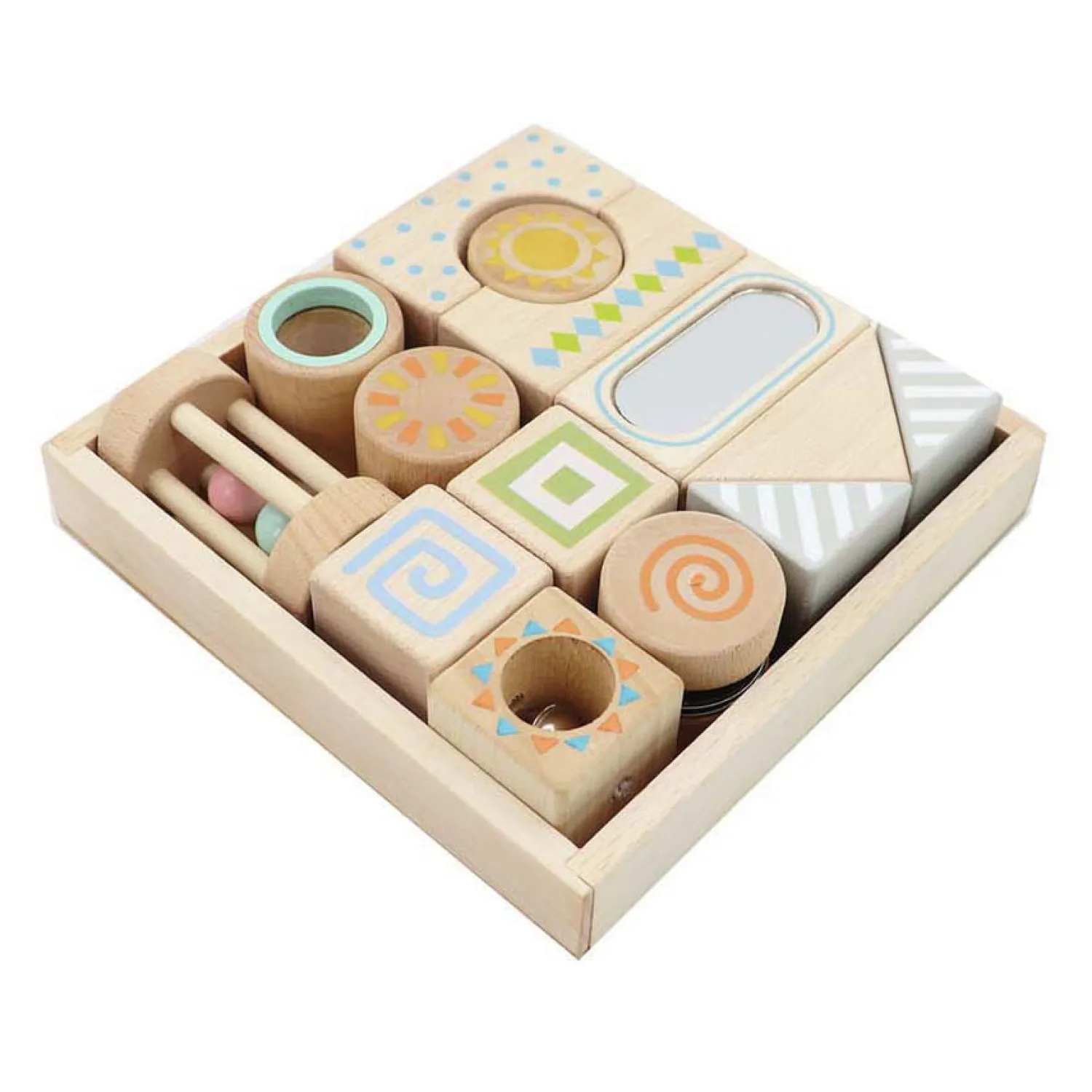 De sensorische speelblokken ontwikkelen de zintuigen en moedigen kinderen uit om te kijken, luisteren en voelen. Gemaakt van natuurlijk hout en bewerkt met kindveilige verf op waterbasis. Geschikt voor kinderen vanaf 12 maanden oud.