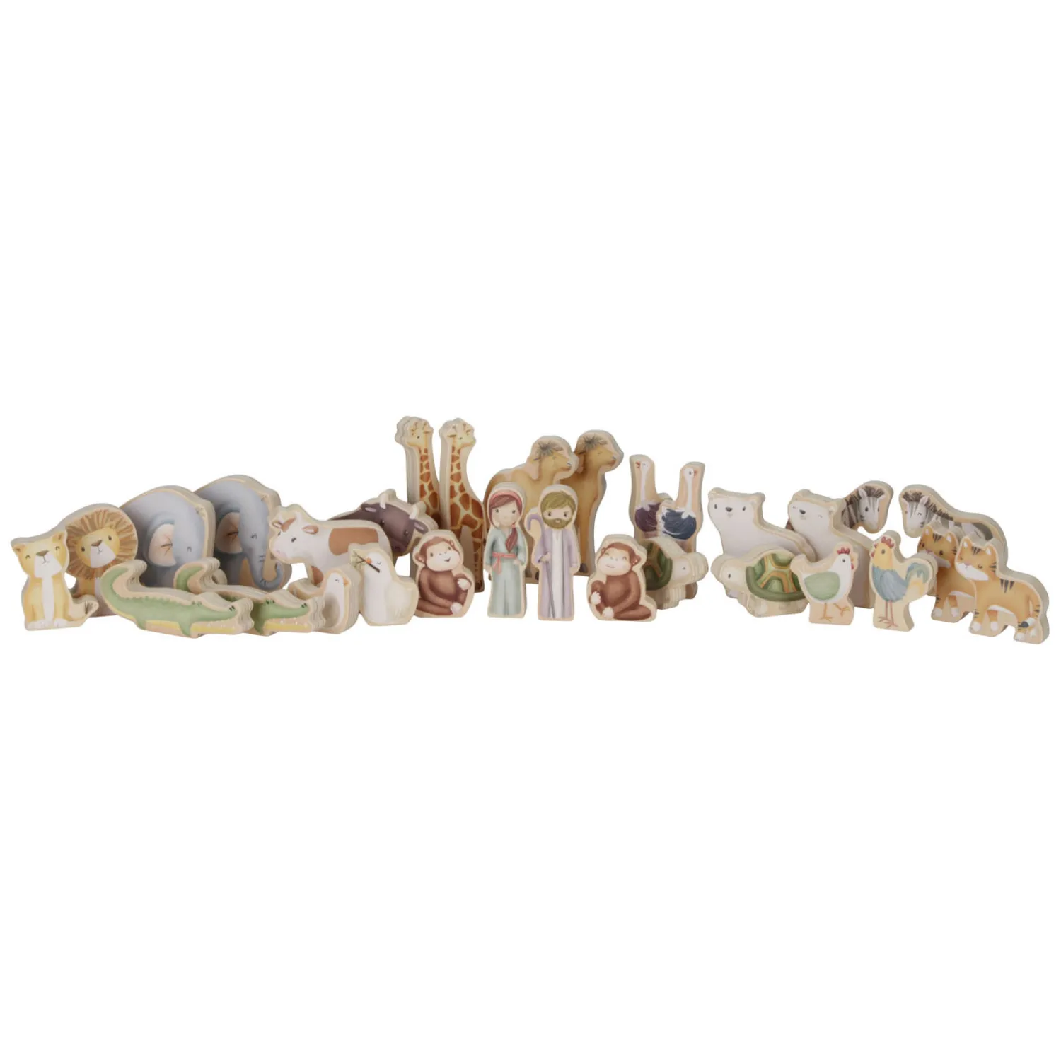 Iedereen aan boord! Speel het verhaal van de Ark van Noach na met deze mooie speelset. Help de dieren elkaar te vinden en maak ze klaar voor hun reis. Elke passagier heeft een gelijk vriendje om samen mee te reizen. Deze 25-delige set bevat de Ark met een deur, een dek dat omhoog kan worden gelift om alle dieren aan boord te brengen. Noah neemt zijn vrouw en een grote groep dieren mee op reis over de oceaan: 2 leeuwen, 2 olifanten, 2 zebra’s, 2 apen, 2 duiven, 2 krokodillen, 2 schildpadden, 2 giraffen, 2 struisvogels, 2 koeien, een kip en een haan. Deze speelset van de Ark van Noach moedigt rollenspellen aan, en verbetert de fantasie en woordenschat, terwijl je kindje dit klassieke verhaal leert.