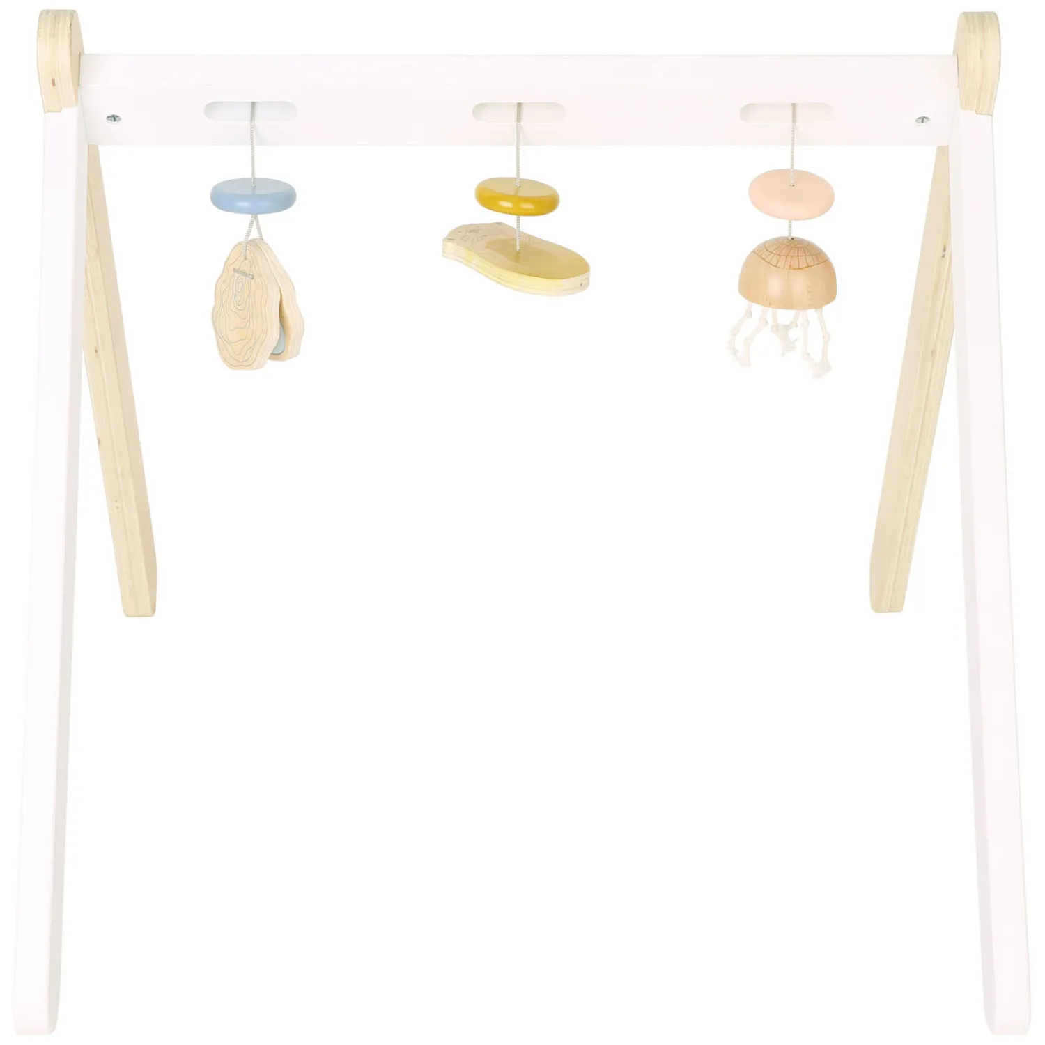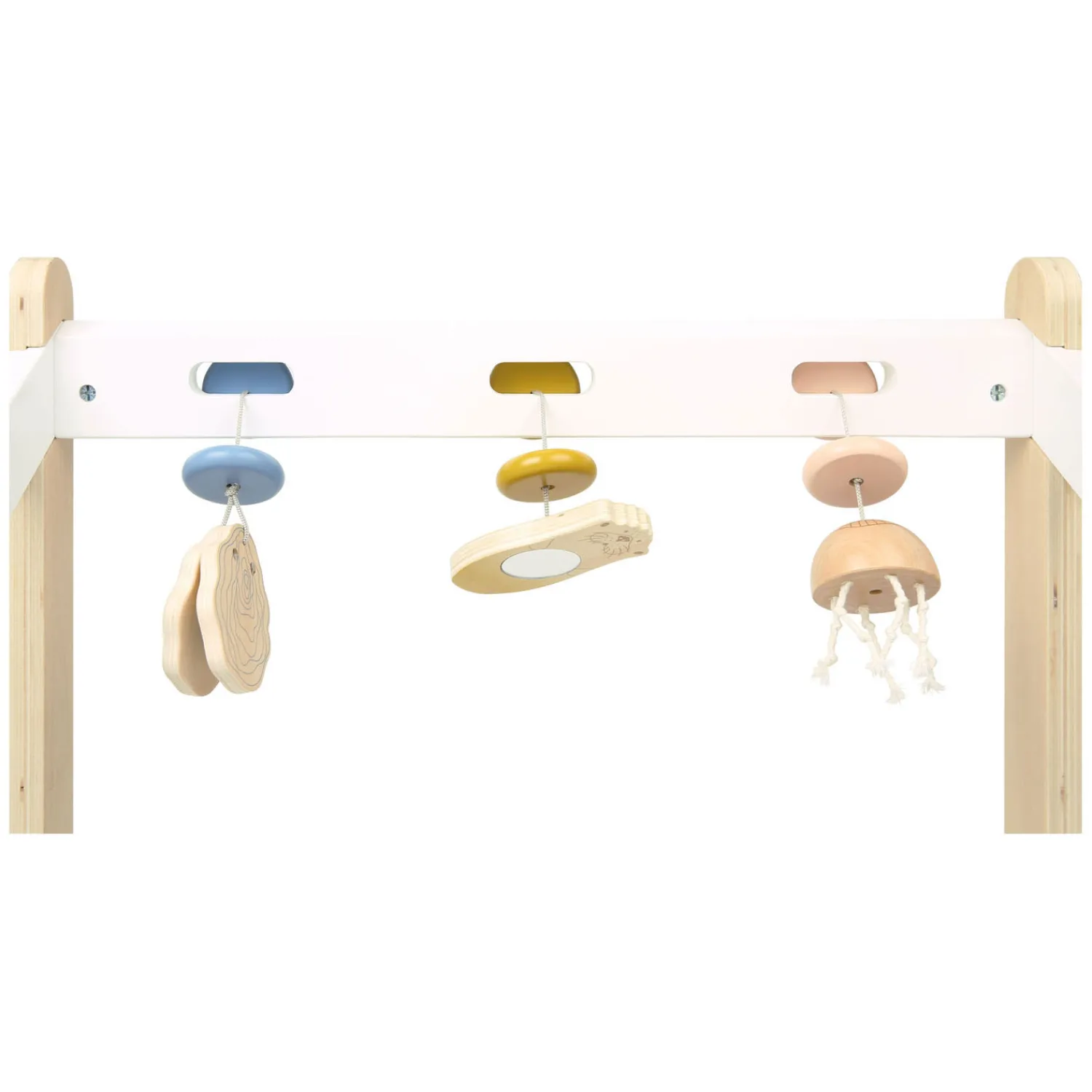 Dankzij het hoge aandeel zichtbaar houtmateriaal is het een absolute blikvanger en verstandig eerste speeltje voor vermaak en ter versterking van de motoriek bij liggende baby’s: de zeeotter, oester en kwal kunnen zonder gereedschap aan de drie sleuven worden bevestigd door ze erin te steken door. En dit is goed om te weten: de driedimensionale speelelementen zijn vooral voor liggende baby’s goed te zien! De speelboog is eenvoudig te monteren dankzij de in elkaar grijpende zijstukken en twee schroeven.