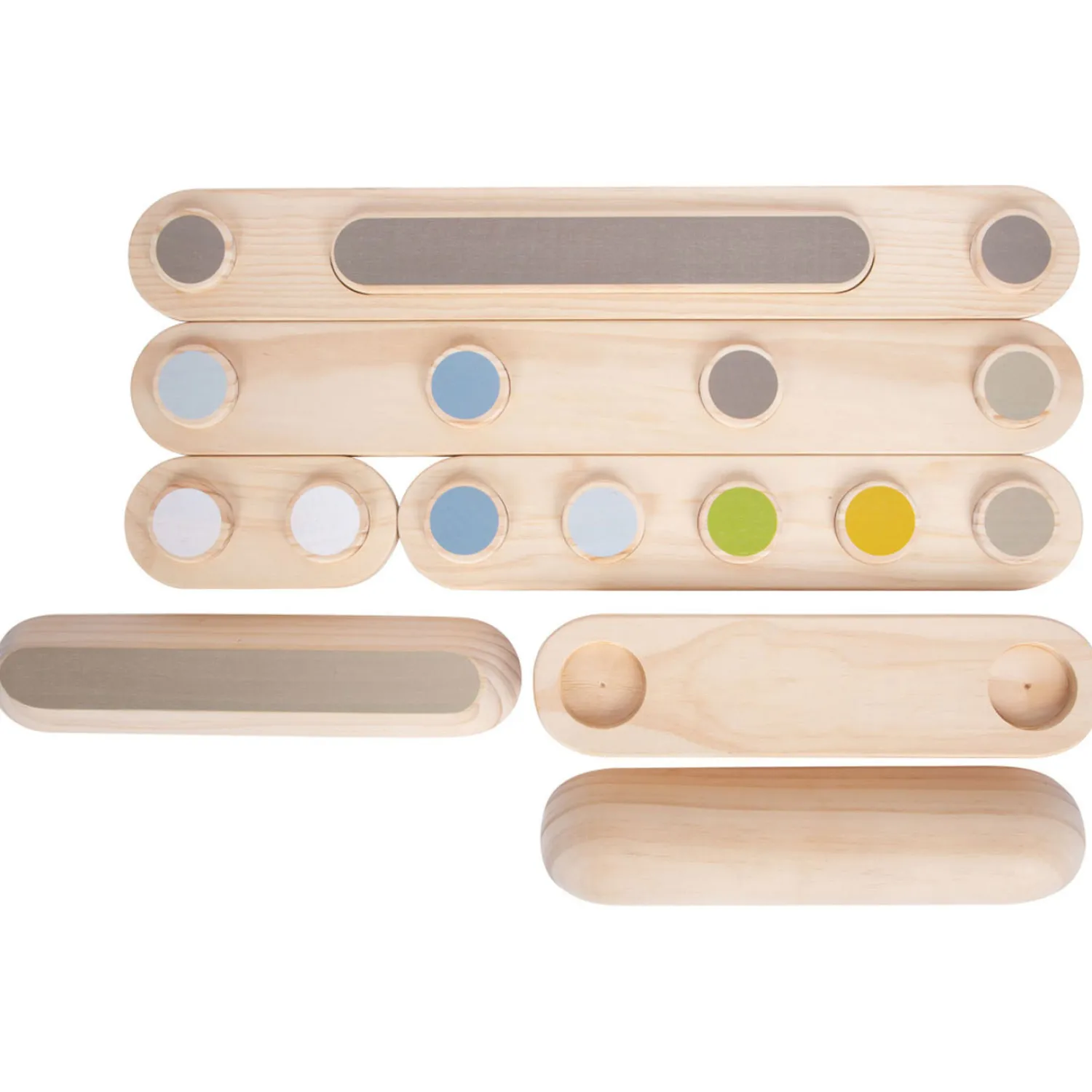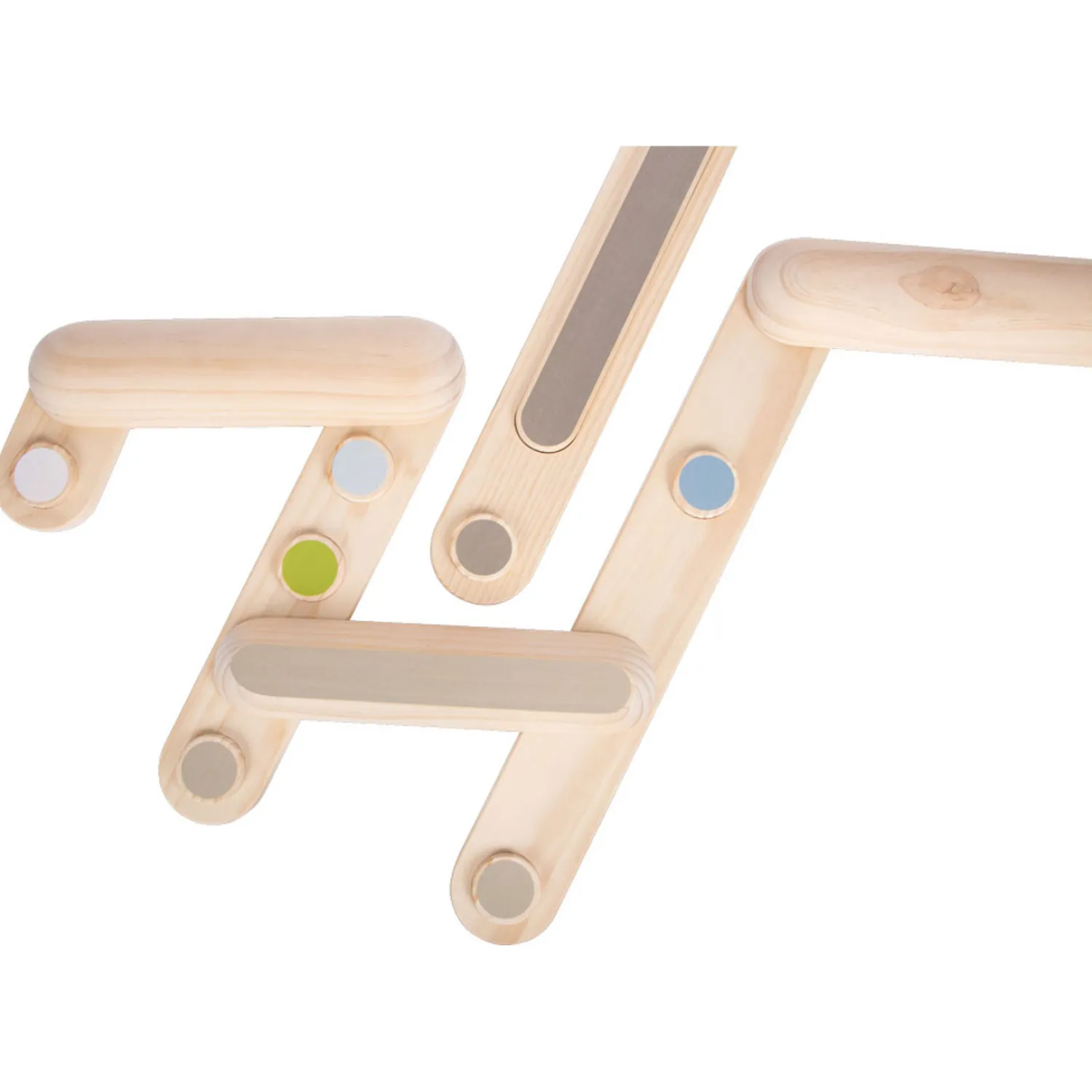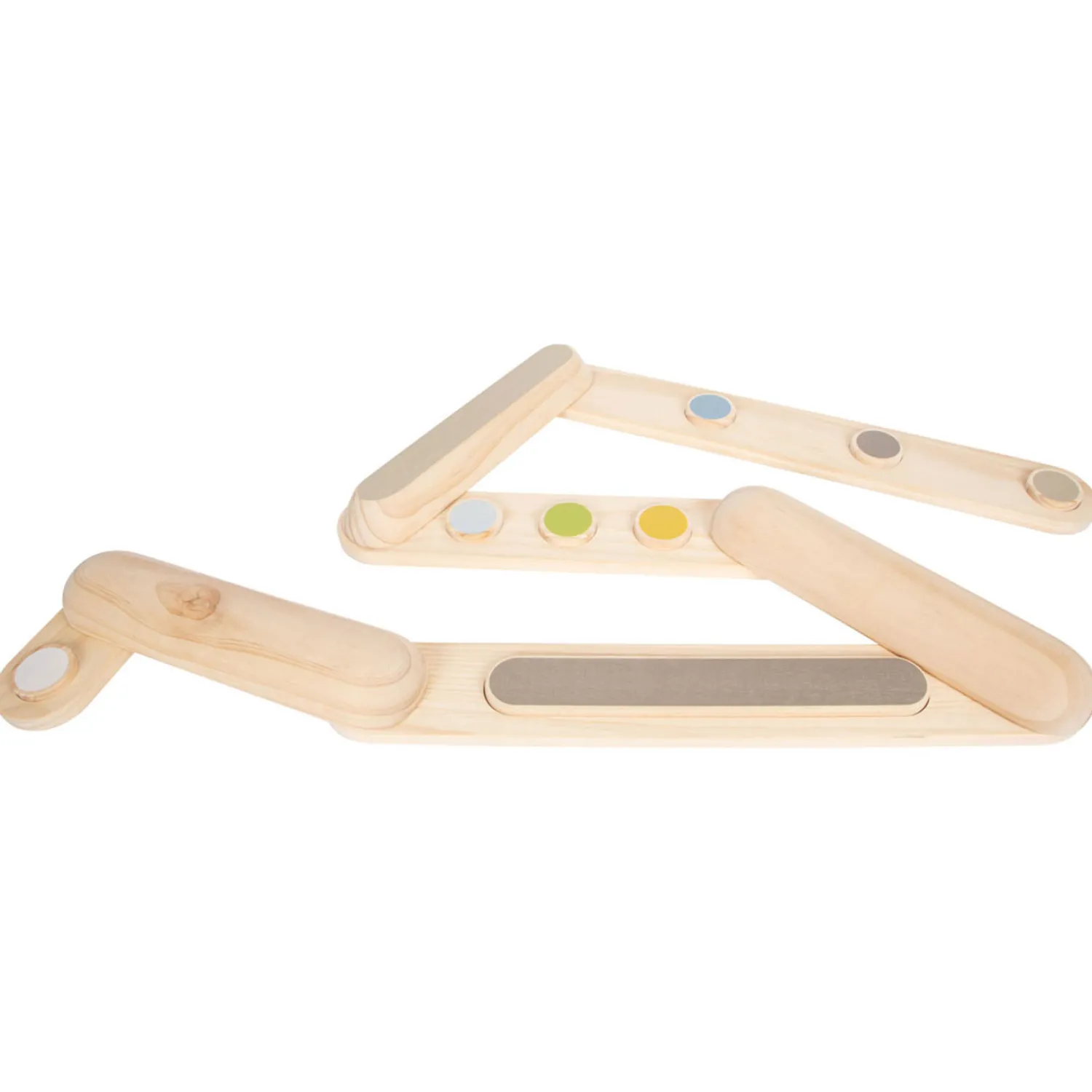 Het langste element van de evenwichtsbalk is 70 cm lang en de kortste is 20 cm. Totaal zijn er 7 elementen die je op oneindig veel manieren aan elkaar kunt verbinden. Zo is de balk steeds weer anders!