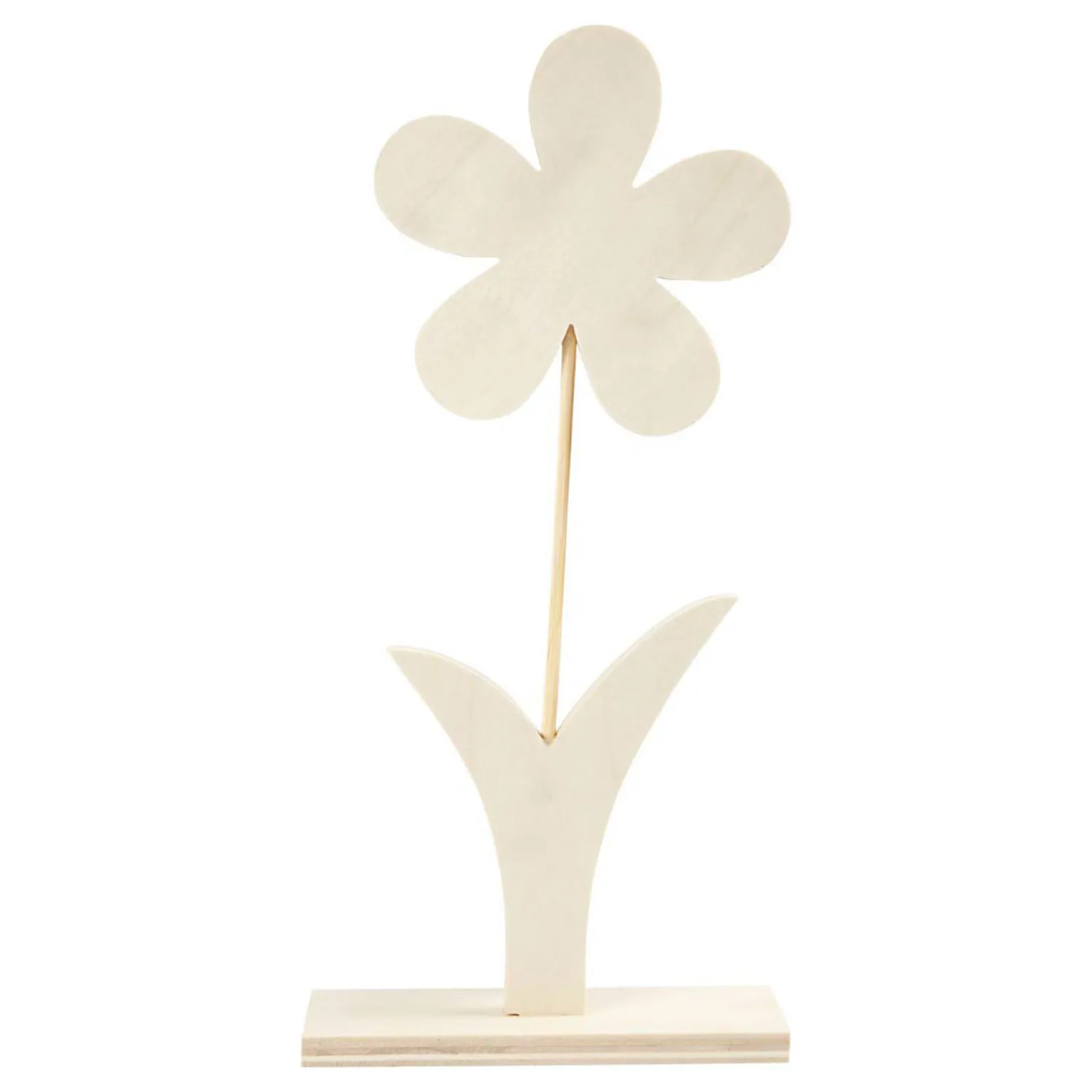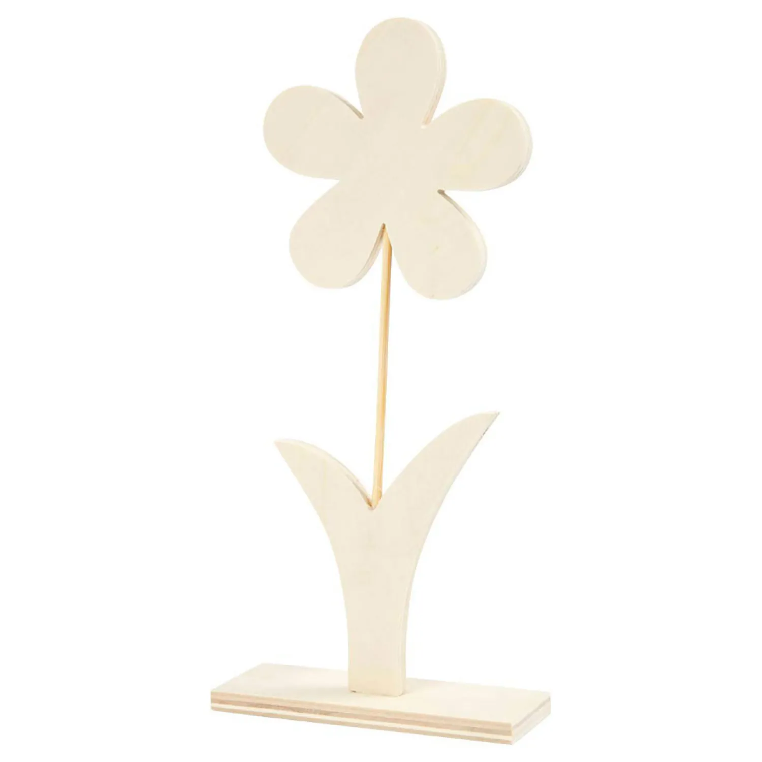 Bloem van licht hout gemonteerd op voet, zodat deze zelfstandig kan staan. Geschikt om zelf te versieren met diverse knutselmaterialen.