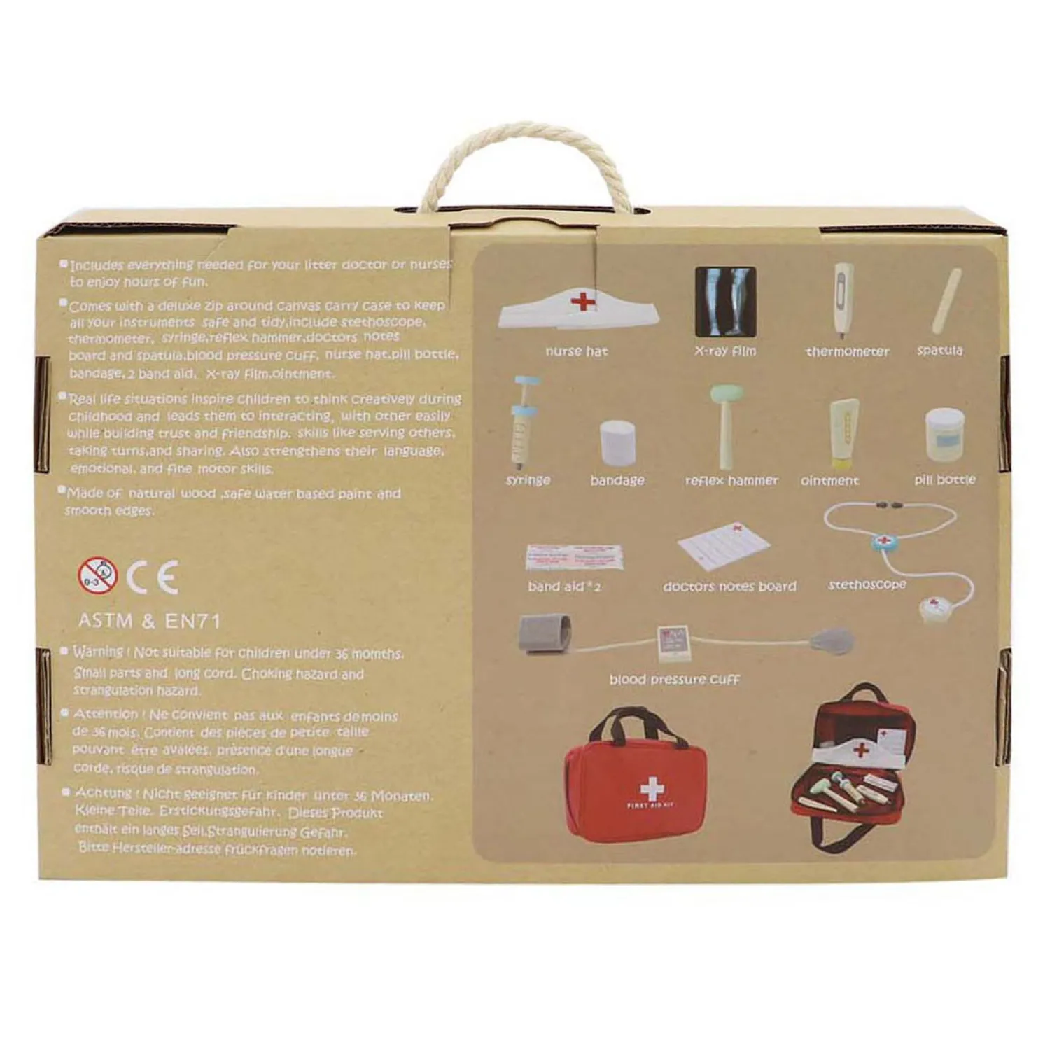 De doktersspullen zijn gemaakt van hout en kindveilige verf of waterbasis. Geschikt vanaf 3 jaar.