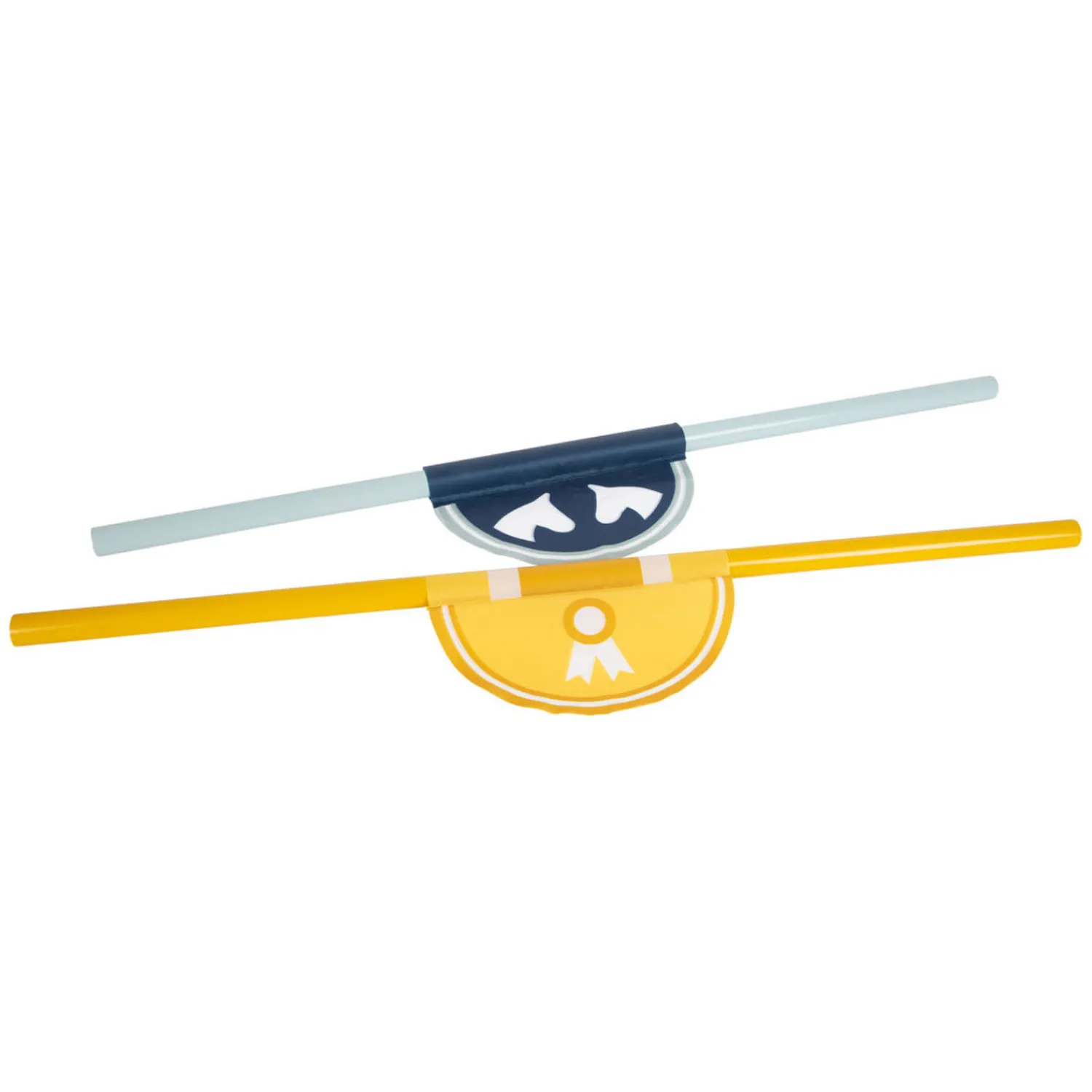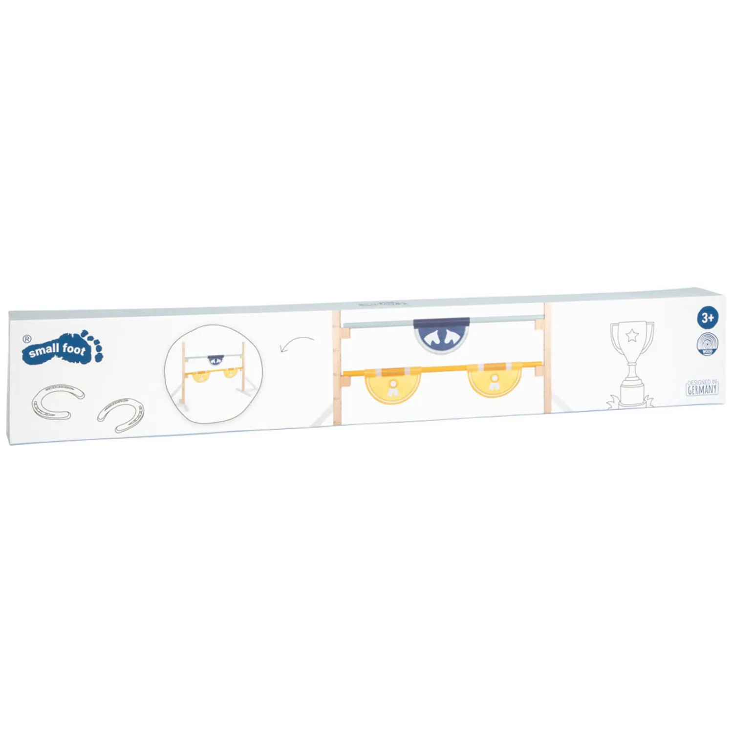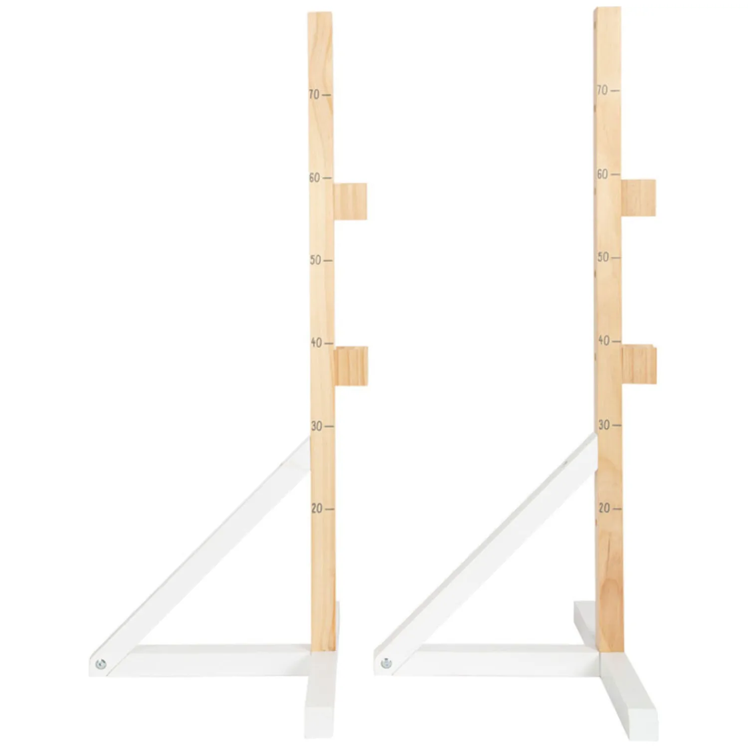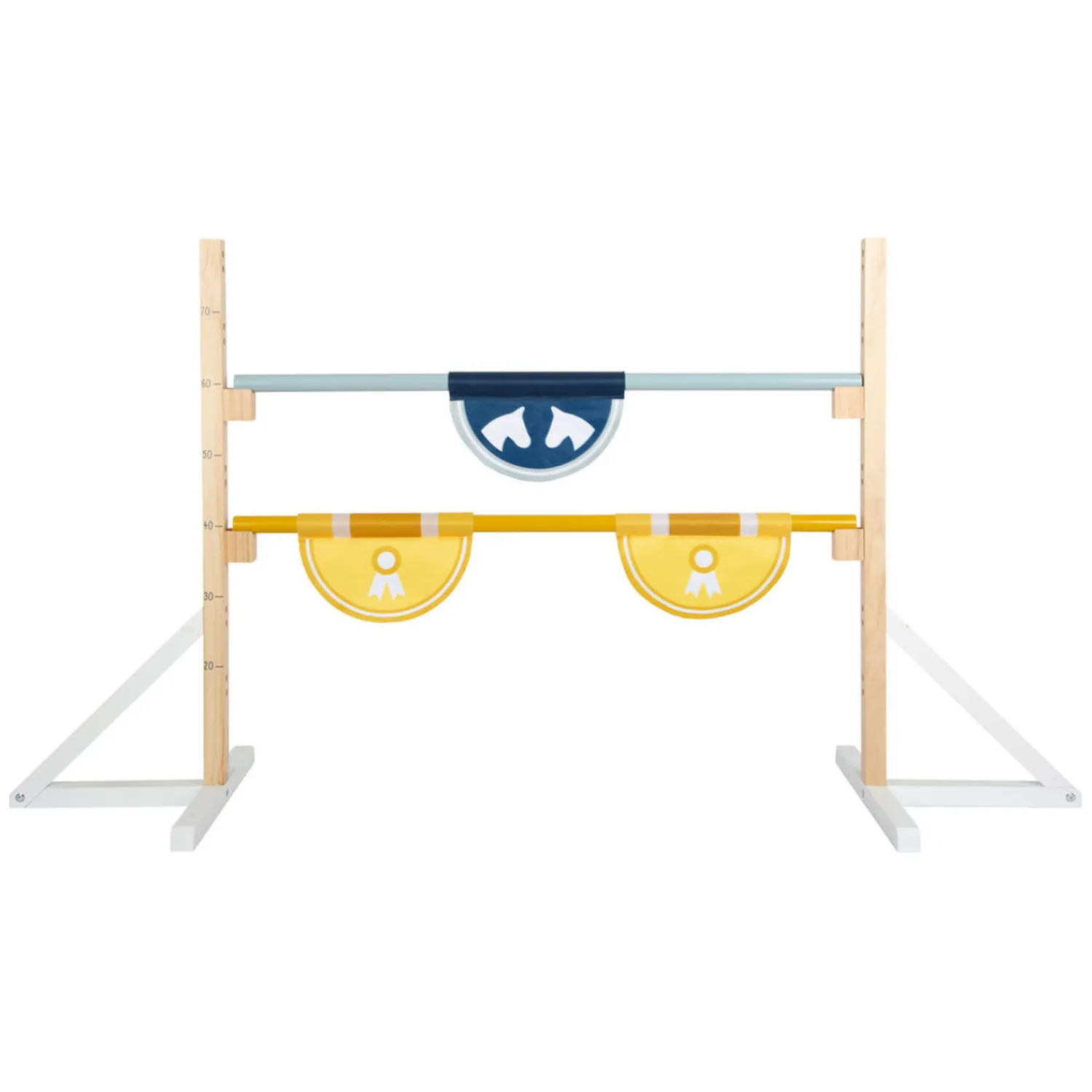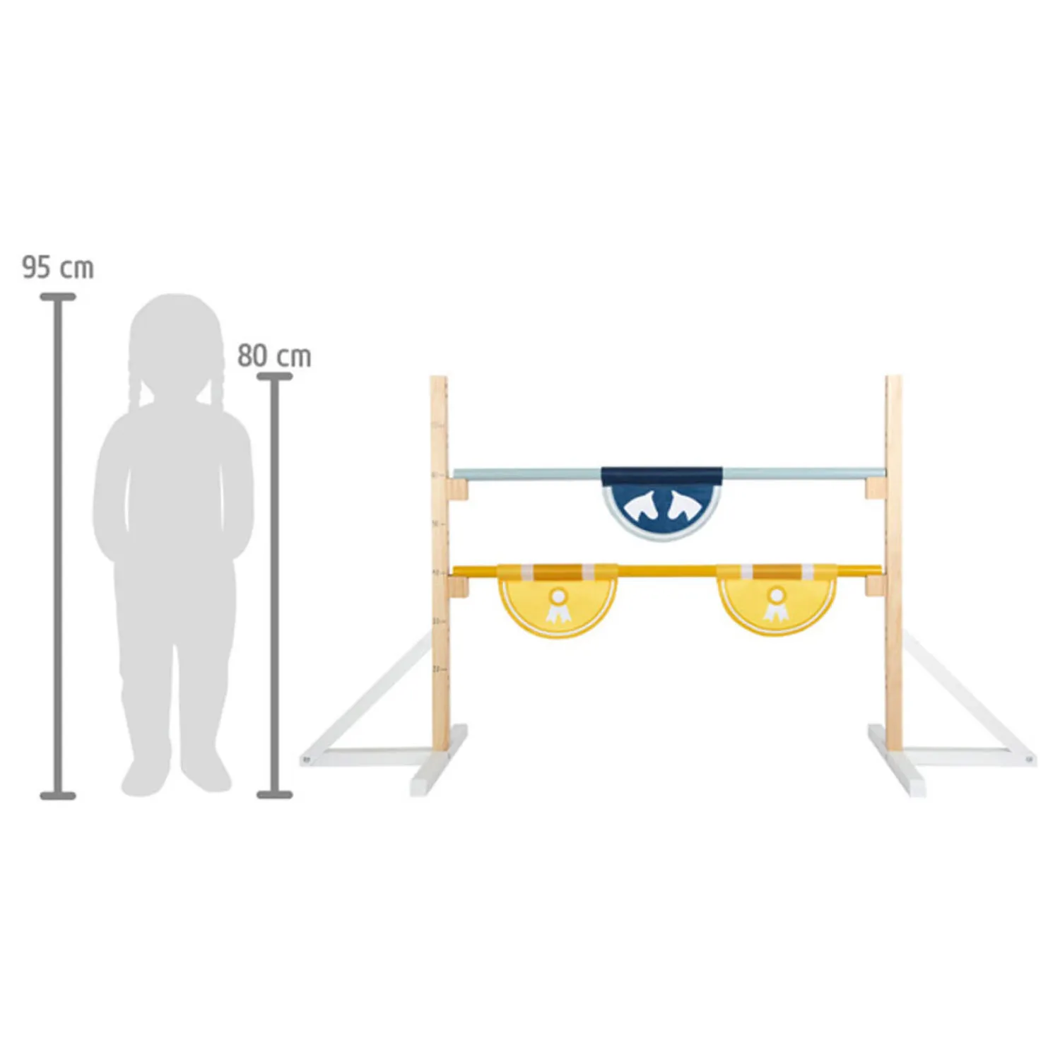 Paardje spelen en over hindernissen springen met een stokpaardje zijn populaire bezigheden bij paardenliefhebbers van alle leeftijden! En net als bij een echte paardenhorde valt de paal naar beneden als hij geraakt wordt tijdens de sprong! De twee paalhouders zijn aan beide zijden bedrukt met de hoogtematen en staan stevig overeind dankzij de massief houten voetjes. En een tip: je kunt meerdere hindernissets combineren met de Cavaletti Obstacle Course for Kids (artikelnr. 5410318) tot één groot springparcours voor de kids. Wie kan over de paal springen zonder hem omver te werpen? Geschikt voor kinderen vanaf 3 jaar oud.